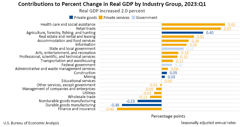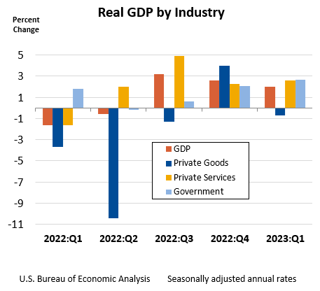 Today's release includes estimates of real GDP by industry, or value added—a measure of an industry's contribution to GDP. In the first quarter, the value added of private services-producing industries increased 2.6 percent, government increased 2.7 percent, and private goods-producing industries decreased 0.7 percent (table 12). Overall, 15 of 22 industry groups contributed to the first-quarter increase in real GDP (table 13).