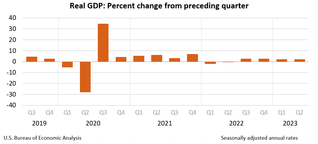 Real gross domestic product (GDP) increased at an annual rate of 2.1 percent in the second quarter of 2023 (table 1), according to the "third" estimate released by the Bureau of Economic Analysis. In the first quarter, real GDP increased 2.2 percent (revised).
