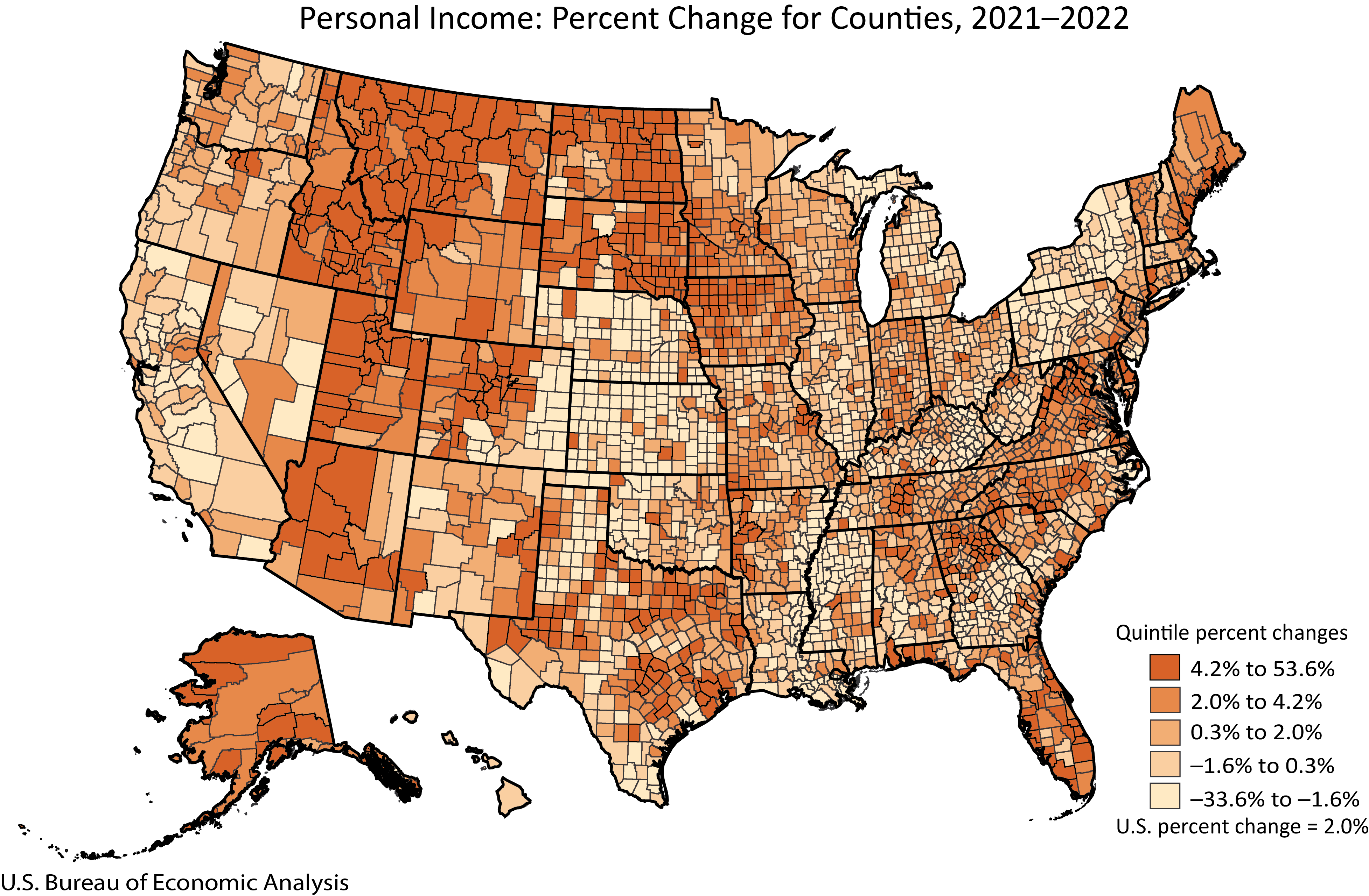 Personal income, in current dollars, increased in 1,964 counties, decreased in 1,107, and was unchanged in 43 counties in 2022, according to statistics released today by the U.S. Bureau of Economic Analysis (BEA). Personal income increased 2.1 percent in the metropolitan portion of the United States and 1.3 percent in the nonmetropolitan portion (table A). In metropolitan counties, the percent change in personal income ranged from 19.0 percent in Midland County, TX, to −16.8 percent in Crosby County, TX. In nonmetropolitan counties, it ranged from 53.6 percent in Towner County, ND, to −33.6 percent in Issaquena County, MS (BEA interactive data).