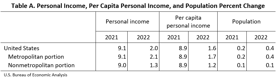 Per capita personal income. In the metropolitan portion of the United States, per capita personal income—personal income divided by population—increased 1.7 percent in 2022, down from 8.9 percent in 2021. In the nonmetropolitan portion of the United States, per capita personal income increased 1.2 percent, also down from 8.9 percent. Table 1 presents estimates of per capita personal income by state and county.