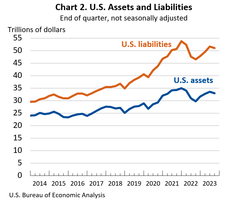 The U.S. net international investment position, the difference between U.S. residents' foreign financial assets and liabilities, was –$18.16 trillion at the end of the third quarter of 2023, according to statistics released today by the U.S. Bureau of Economic Analysis (BEA). Assets totaled $32.91 trillion, and liabilities were $51.07 trillion. At the end of the second quarter, the net investment position was –$18.14 trillion (revised). The net investment position and components of assets and liabilities are presented in table 1.