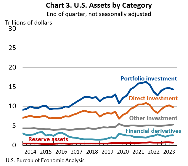 Direct investment assets decreased by $449.1 billion to $9.84 trillion and portfolio investment assets decreased by $388.2 billion to $14.42 trillion, driven mainly by foreign stock price decreases and the depreciation of foreign currencies against the U.S. dollar that lowered the market value of these assets in dollar terms.