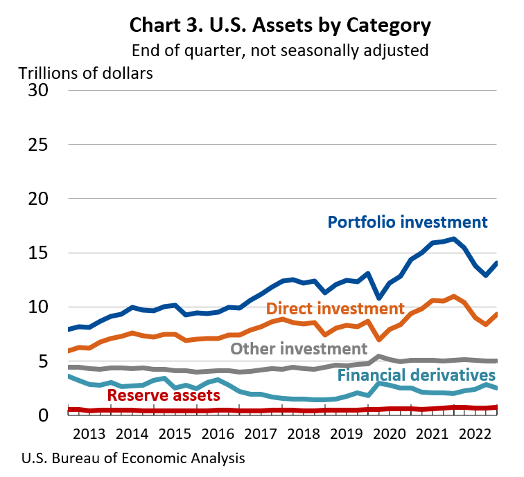U.S. assets decreased by $3.39 trillion to a total of $31.68 trillion at the end of 2022, mostly reflecting decreases in portfolio investment and direct investment assets that were partly offset by an increase in financial derivatives.