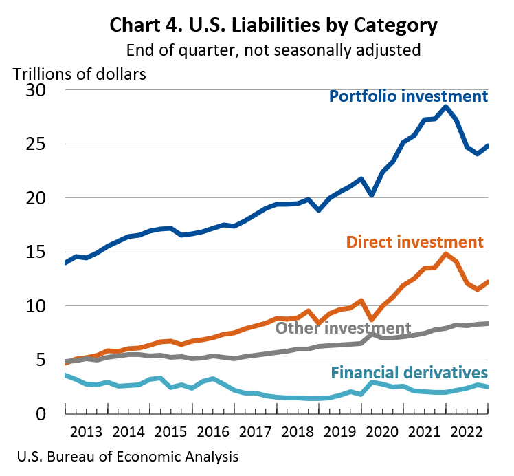 U.S. liabilities decreased by $5.39 trillion to a total of $47.80 trillion at the end of 2022, reflecting decreases in portfolio investment and direct investment liabilities that were partly offset by increases in financial derivatives and other investment liabilities.