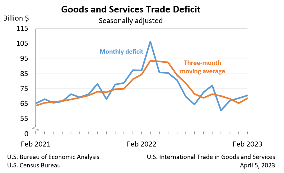 The U.S. Census Bureau and the U.S. Bureau of Economic Analysis announced today that the goods and services deficit was $70.5 billion in February, up $1.9 billion from $68.7 billion in January, revised.