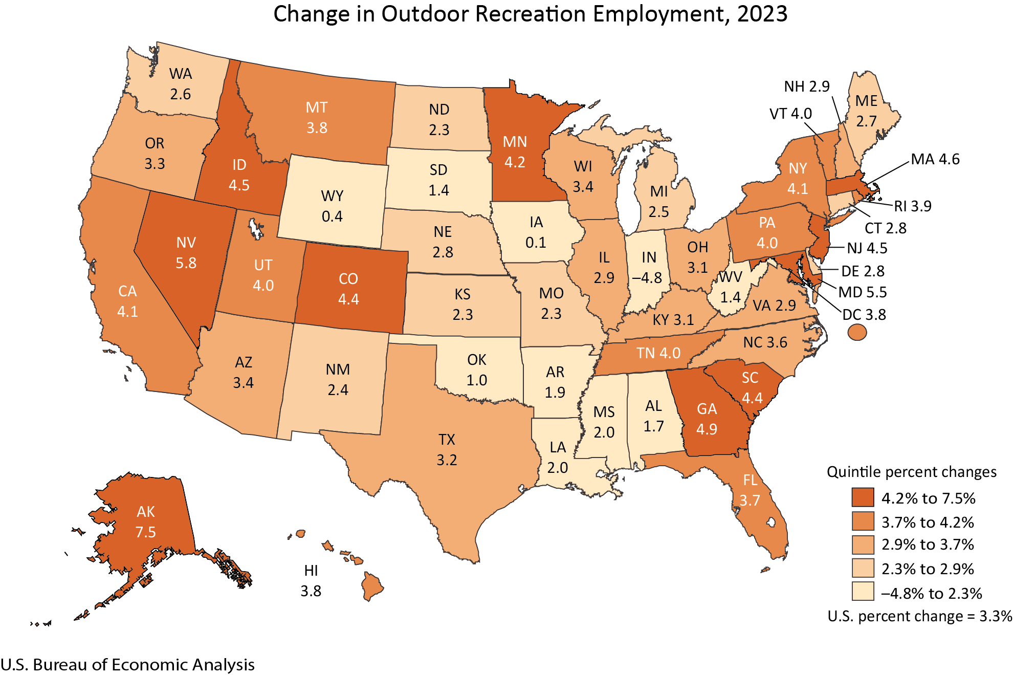Across all 50 states and the District of Columbia, outdoor recreation employment increased in 49 states and the District of Columbia in 2023, ranging from 7.5 percent in Alaska to −4.8 percent in Indiana. The percentage change was 3.8 percent in the District of Columbia (BEA interactive tables).