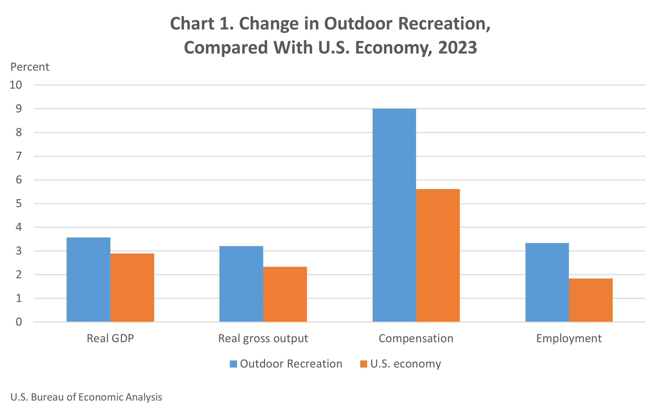 Inflation-adjusted (“real”) GDP for the outdoor recreation economy increased 3.6 percent in 2023, compared with a 2.9 percent increase for the overall U.S. economy, reflecting a deceleration from the increase in outdoor recreation of 10.2 percent in 2022 (chart 1 and national table 1). Real gross output for the outdoor recreation economy increased 3.2 percent, while outdoor recreation compensation increased 9.0 percent, and employment increased 3.3 percent (national table 9).