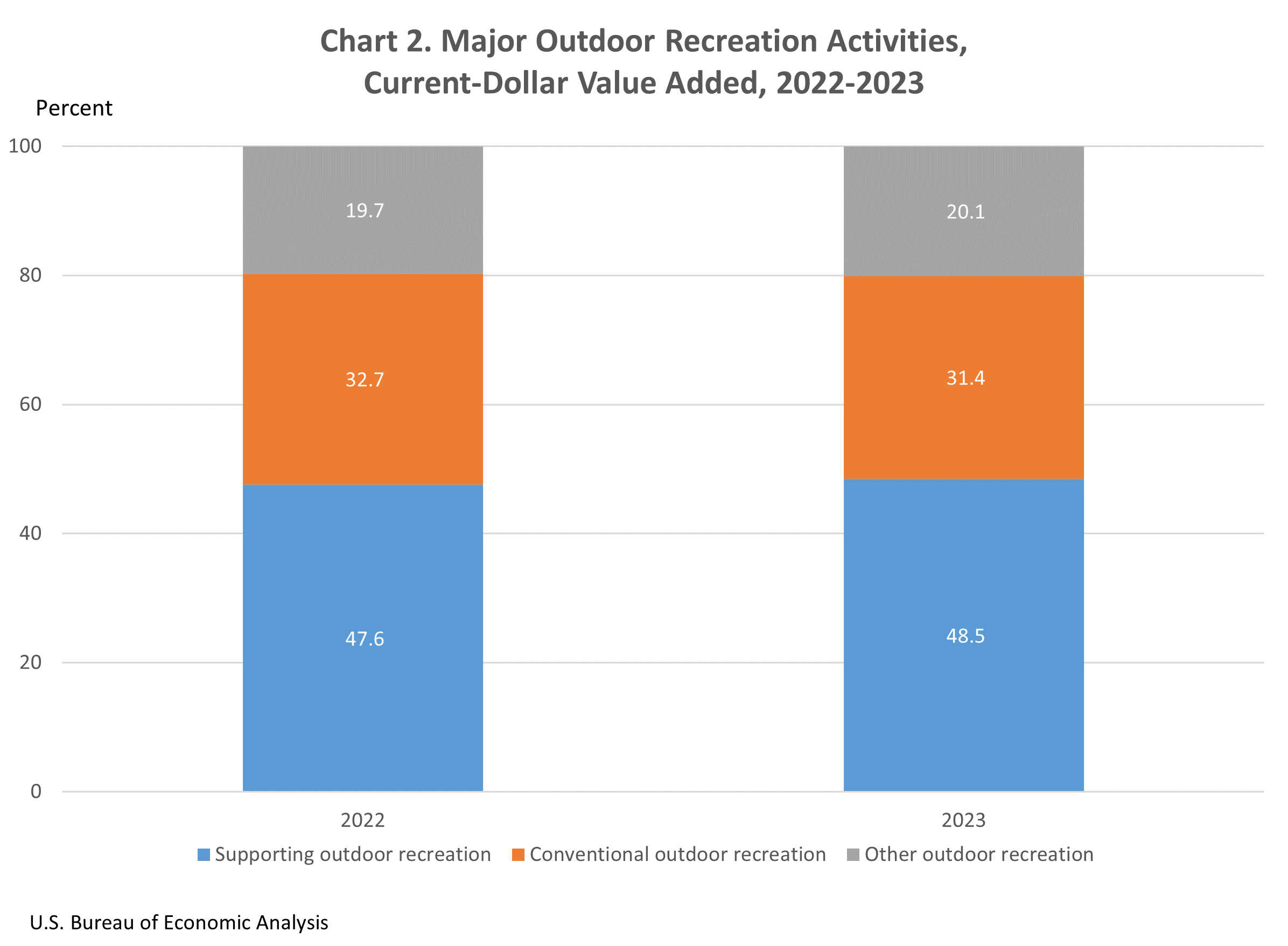 In 2023, conventional outdoor recreation accounted for 31.4 percent of U.S. outdoor recreation value added, compared with 32.7 percent in 2022 (chart 2). “Other outdoor recreation” accounted for 20.1 percent of value added in 2023, compared with 19.7 percent in 2022. Supporting activities accounted for the remaining 48.5 percent of value added in 2023, compared with 47.6 percent in 2022. Growth in supporting activities was led by travel and tourism, reflecting growth in spending on transportation, hotels, and restaurants (national table 4).