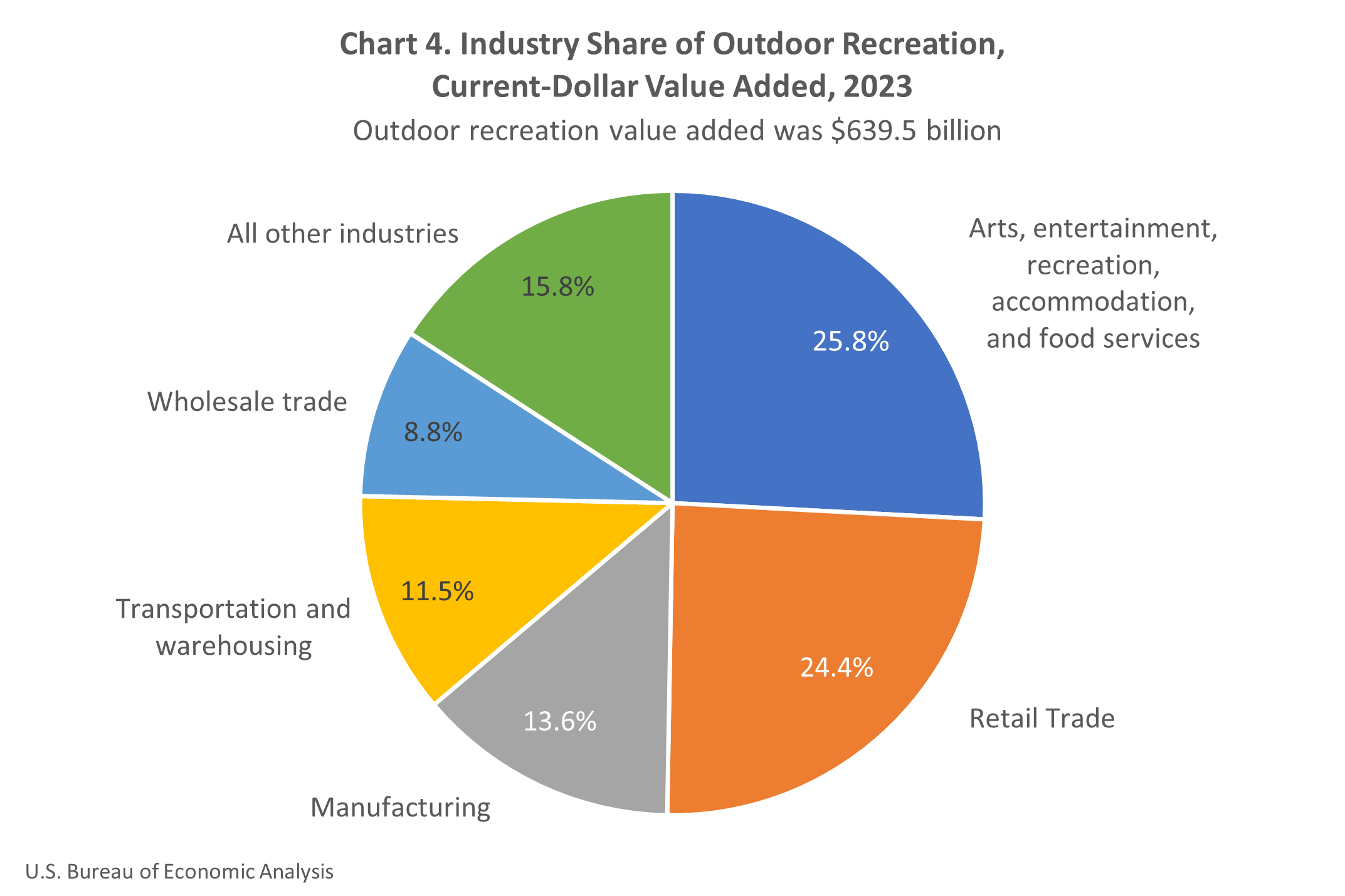 The U.S. Bureau of Economic Analysis released statistics today measuring the outdoor recreation economy for the nation, all 50 states, and the District of Columbia. The new U.S. data show that the value added of the outdoor recreation economy accounted for 2.3 percent ($639.5 billion) of current-dollar gross domestic product (GDP) for the nation in 2023 (national table 2). At the state level, value added for outdoor recreation as a share of state GDP ranged from 6.3 percent in Hawaii to 1.6 percent in Delaware, Connecticut, and New York. The share was 0.8 percent in the District of Columbia (state table 1).