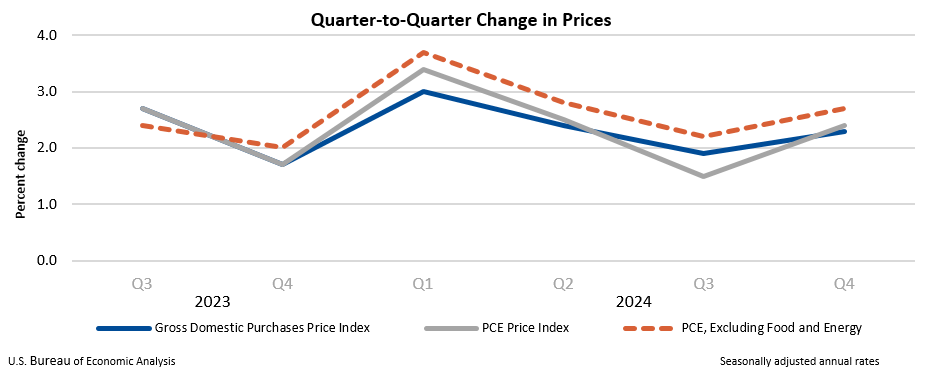 The price index for gross domestic purchases increased 2.4 percent in 2024, revised up 0.1 percentage point. The PCE price index increased 2.5 percent, the same as the previous estimate. Excluding food and energy prices, the PCE price index increased 2.8 percent, also the same as the previous estimate.