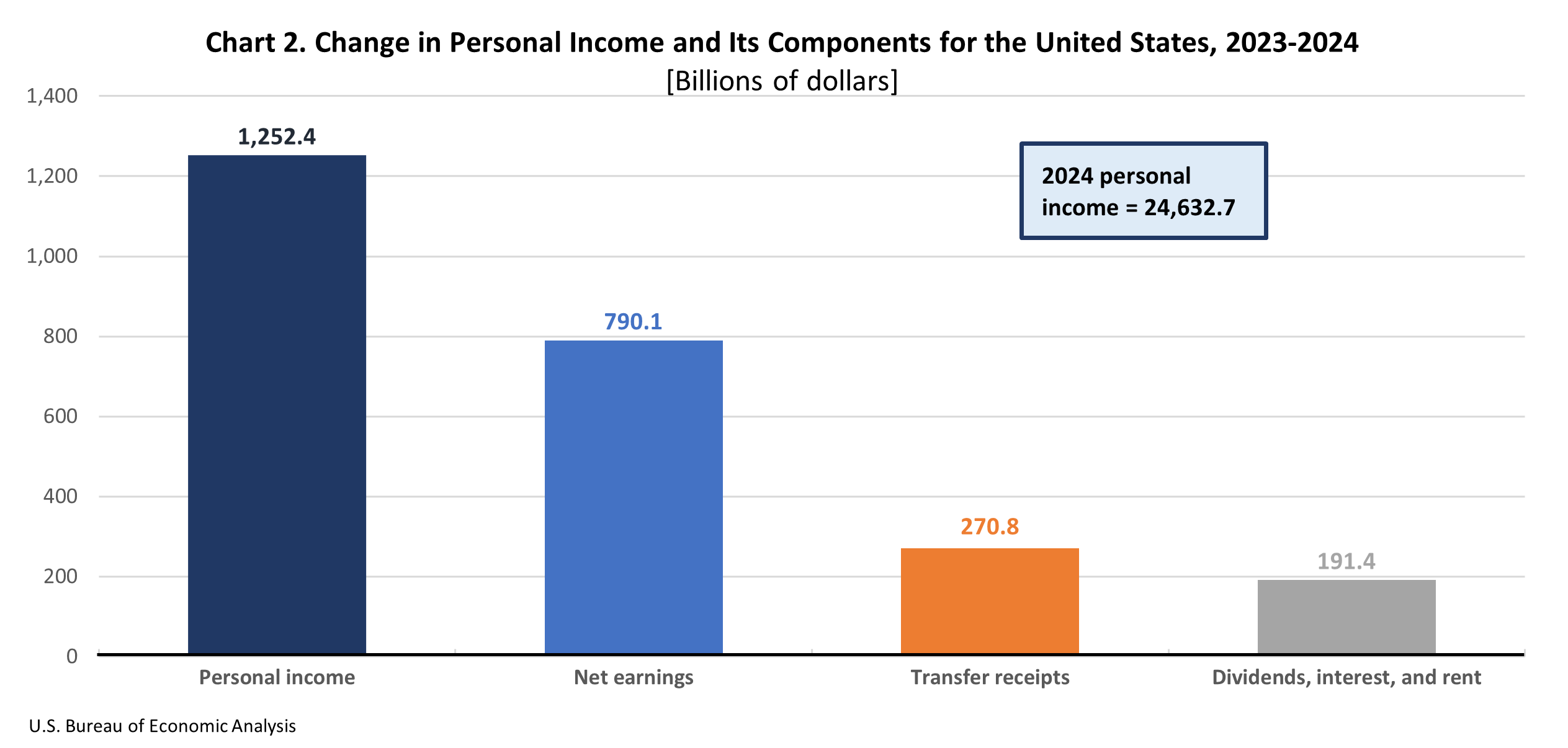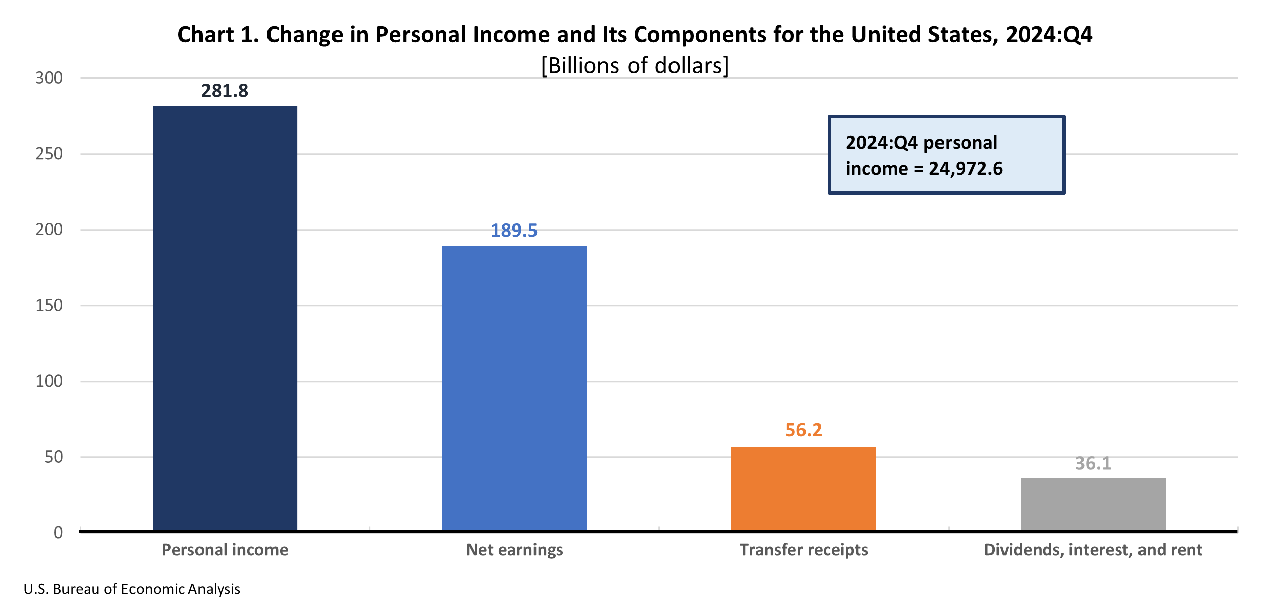In the fourth quarter of 2024, current-dollar personal income increased $281.8 billion, or 4.6 percent at an annual rate (table 5). Nationally, increases in earnings, transfer receipts, and property income (dividends, interest, and rent) contributed to the increase in personal income (chart 1).