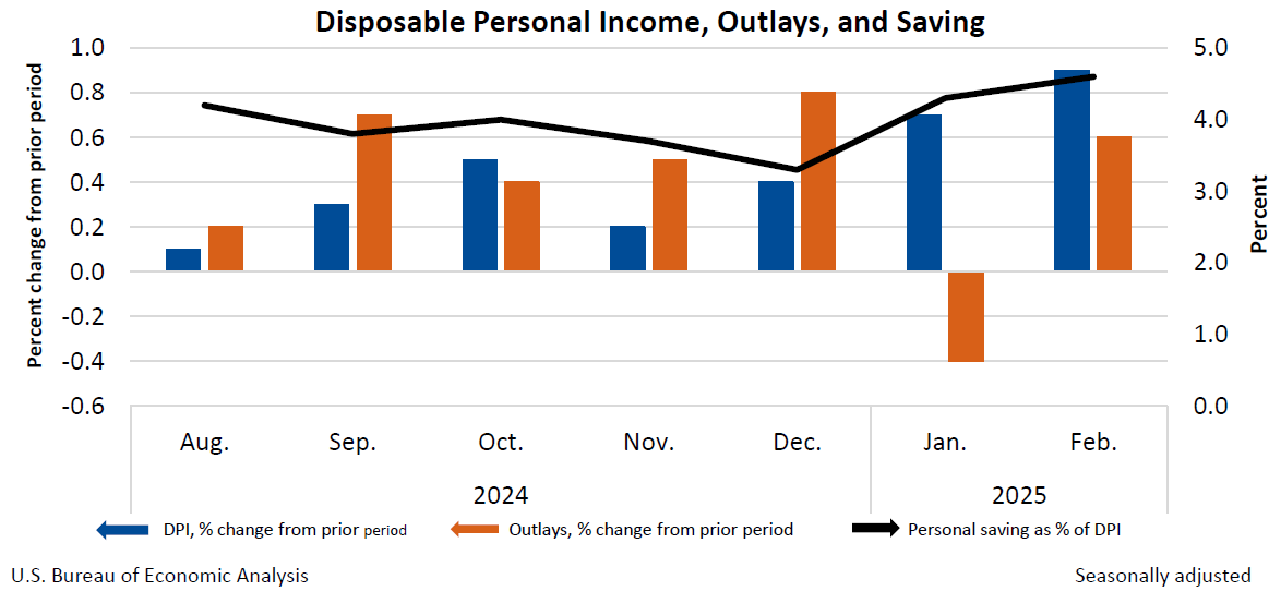 Personal outlays—the sum of PCE, personal interest payments, and personal current transfer payments—increased $118.4 billion in February. Personal saving was $1.02 trillion in February and the personal saving rate—personal saving as a percentage of disposable personal income—was 4.6 percent.