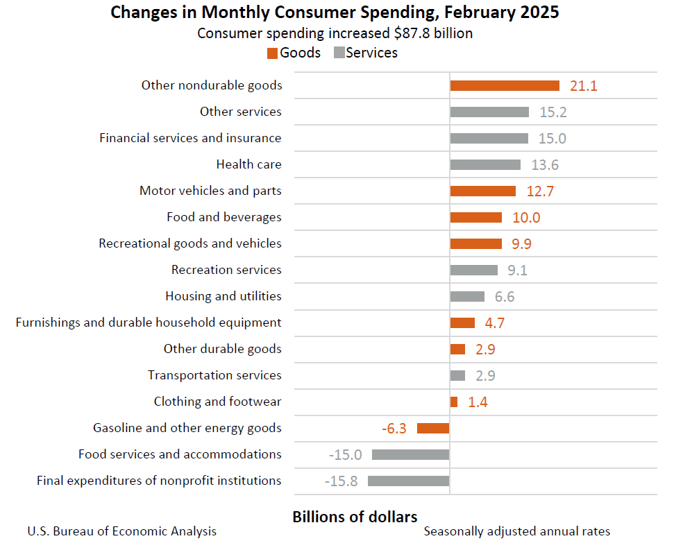 The $87.8 billion increase in current-dollar PCE in February reflected increases of $56.3 billion in spending for goods and $31.5 billion in spending for services.