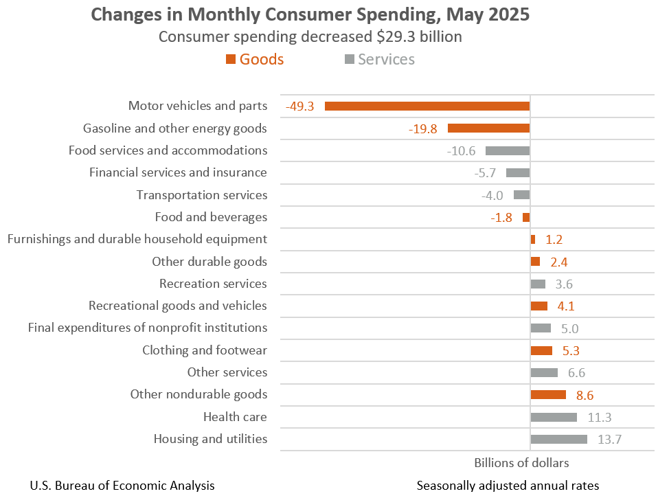 The $29.3 billion decrease in current-dollar PCE in May reflected a decrease of $49.2 billion in spending on goods that was partly offset by an increase of $19.9 billion in spending for services.