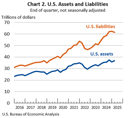 The U.S. net international investment position,the difference between U.S. residents' foreign financial assets and liabilities, was –$24.61 trillion at the end of the first quarter of 2025, according to statistics released today by the U.S. Bureau of Economic Analysis (chart 1). Assets totaled $36.85 trillion, and liabilities were $61.47 trillion (chart 2). At the end of the fourth quarter of 2024, the net investment position was –$26.54 trillion (revised). The net investment position and components of assets and liabilities are presented in table 1.
