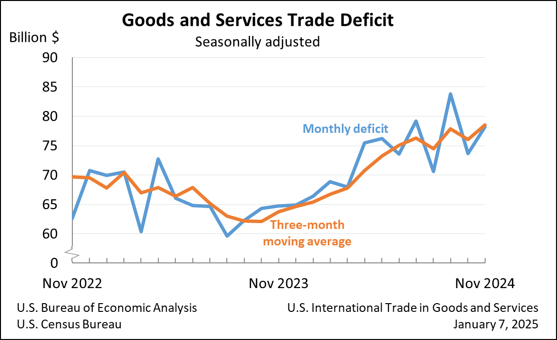 The average goods and services deficit increased $2.5 billion to $78.5 billion for the three months ending in November.