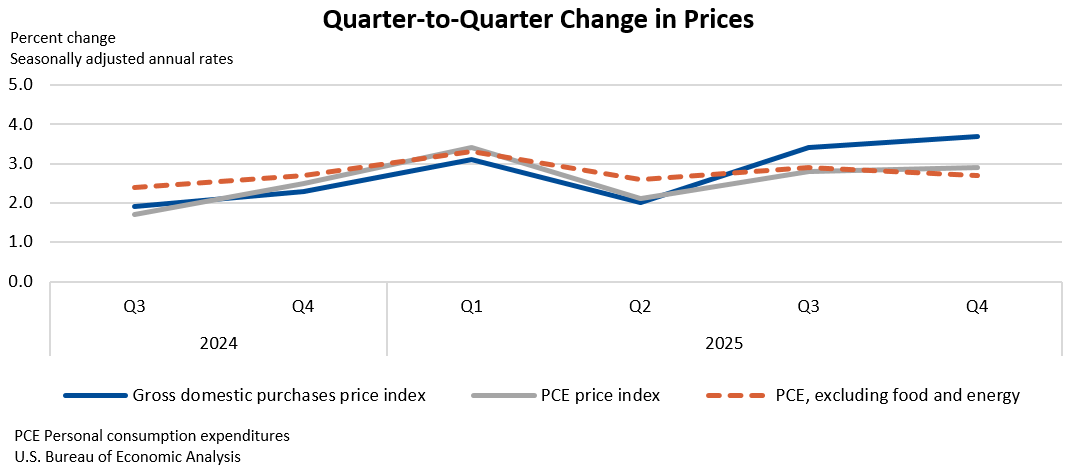 The price index for gross domestic purchases increased 3.7 percent in the fourth quarter, compared with an increase of 3.4 percent in the third quarter. The personal consumption expenditures (PCE) price index increased 2.9 percent, compared with an increase of 2.8 percent. Excluding food and energy prices, the PCE price index increased 2.7 percent, compared with an increase of 2.9 percent. (Refer to “Technical Notes” below for information on how BEA imputed missing Bureau of Labor Statistics (BLS) October prices.)