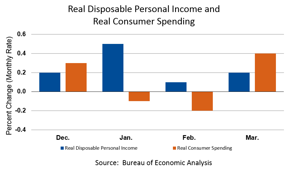 Real DPI, income adjusted for taxes and inflation, increased 0.2 percent in April, the same increase as in March.