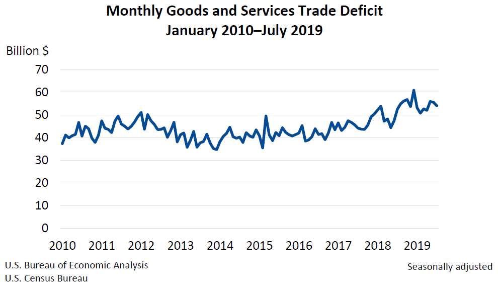 The U.S. monthly international trade deficit decreased in July 2019, according to the U.S. Bureau of Economic Analysis and the U.S. Census Bureau. The deficit decreased from $55.5 billion in June (revised) to $54.0 billion in July, as exports increased and imports decreased. The previously published June deficit was $55.2 billion. The goods deficit decreased $1.6 billion in July to $73.7 billion. The services surplus decreased $0.1 billion in July to $19.7 billion.
