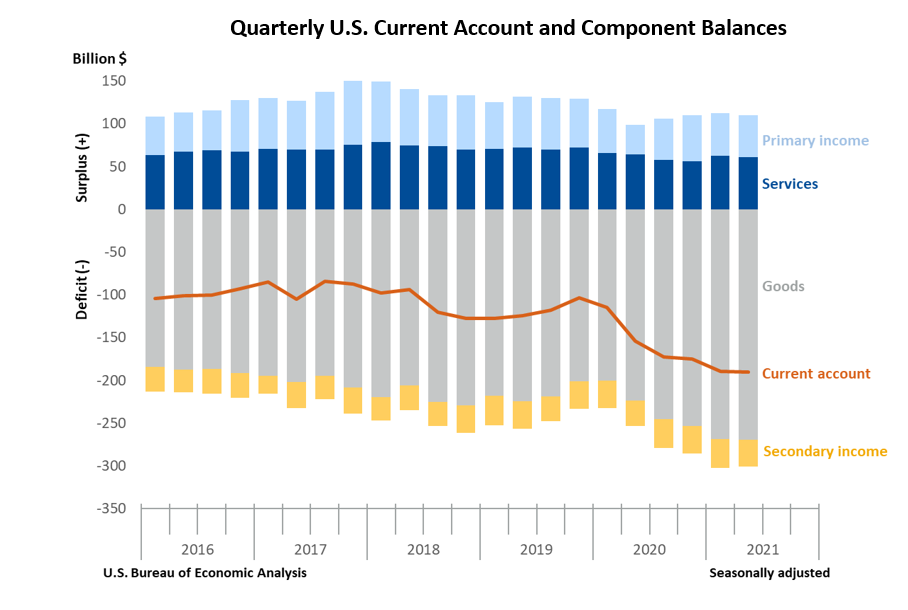 The U.S. current account deficit, which reflects the combined balances on trade in goods and services and income flows between U.S. residents and residents of other countries, widened by $0.9 billion, or 0.5 percent, to $190.3 billion in the second quarter of 2021. The widening mainly reflected reduced surpluses on services and on primary income that were mostly offset by a reduced deficit on secondary income. The second quarter deficit was 3.3 percent of current dollar gross domestic product, down from 3.4 percent in the first quarter.