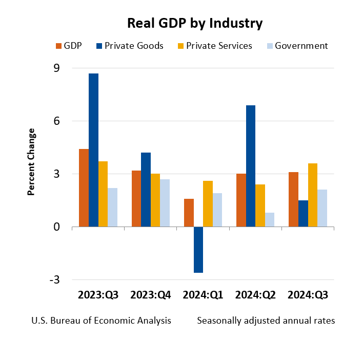 Private goods-producing industries increased 1.5 percent, private services-producing industries increased 3.6 percent, and government increased 2.1 percent (table 12). Overall, 16 of 22 industry groups contributed to the third-quarter increase in real GDP.