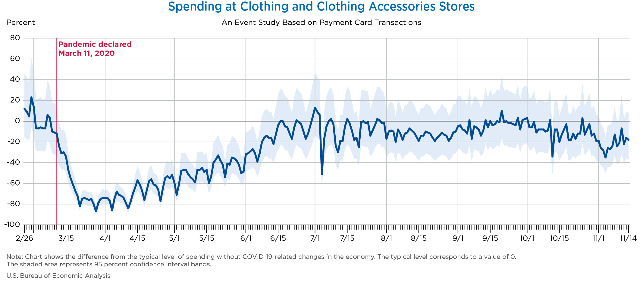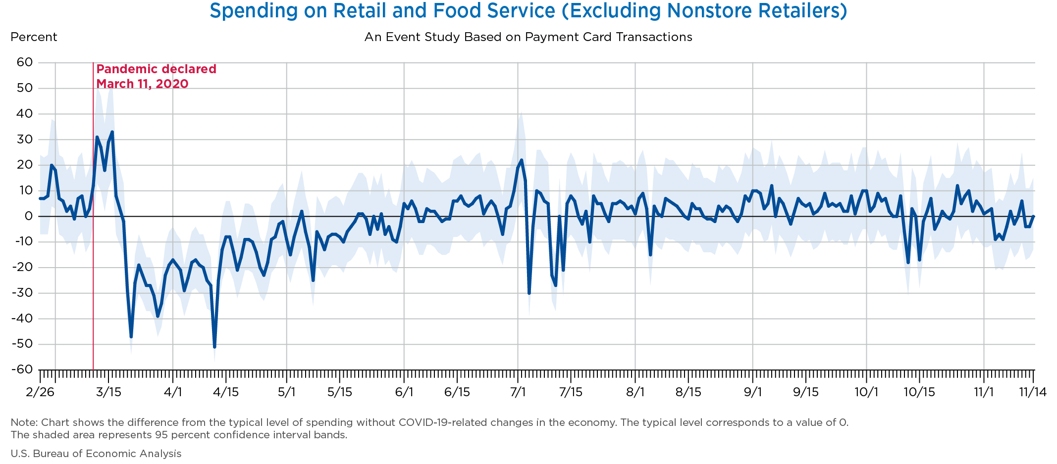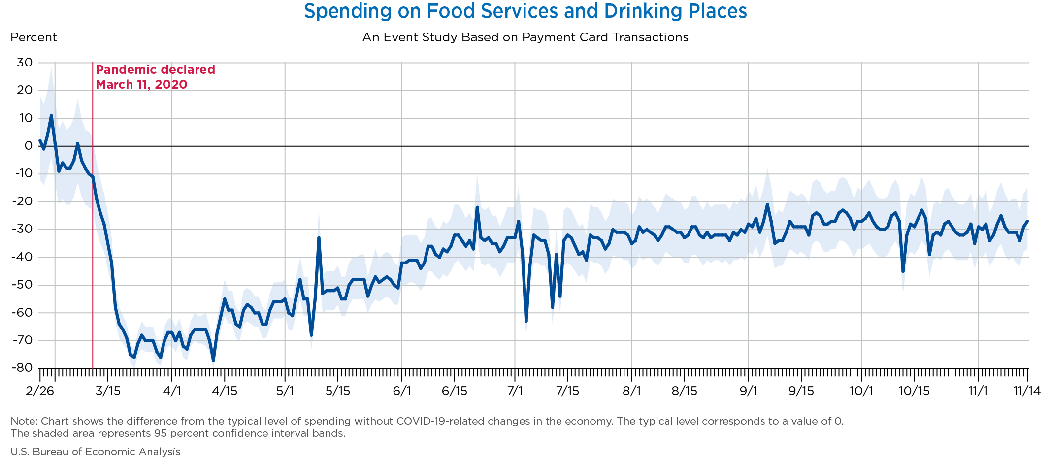 Nov 19, 2020 Daily Spending by Industry Spending on Food Services and Drinking Places Spending on Accommodation Spending at Clothing and Clothing Accessories Stores Spending on Gasoline Stations Spending on Food and Beverages Spending on Ambulatory Health Care Services Spending on Retail and Food Services (Excluding Nonstore Retailers) Data Weekly Event Study of Estimates Using Card Transactions XLSX Monthly Event Study of Estimates Using Card Transactions XLSX