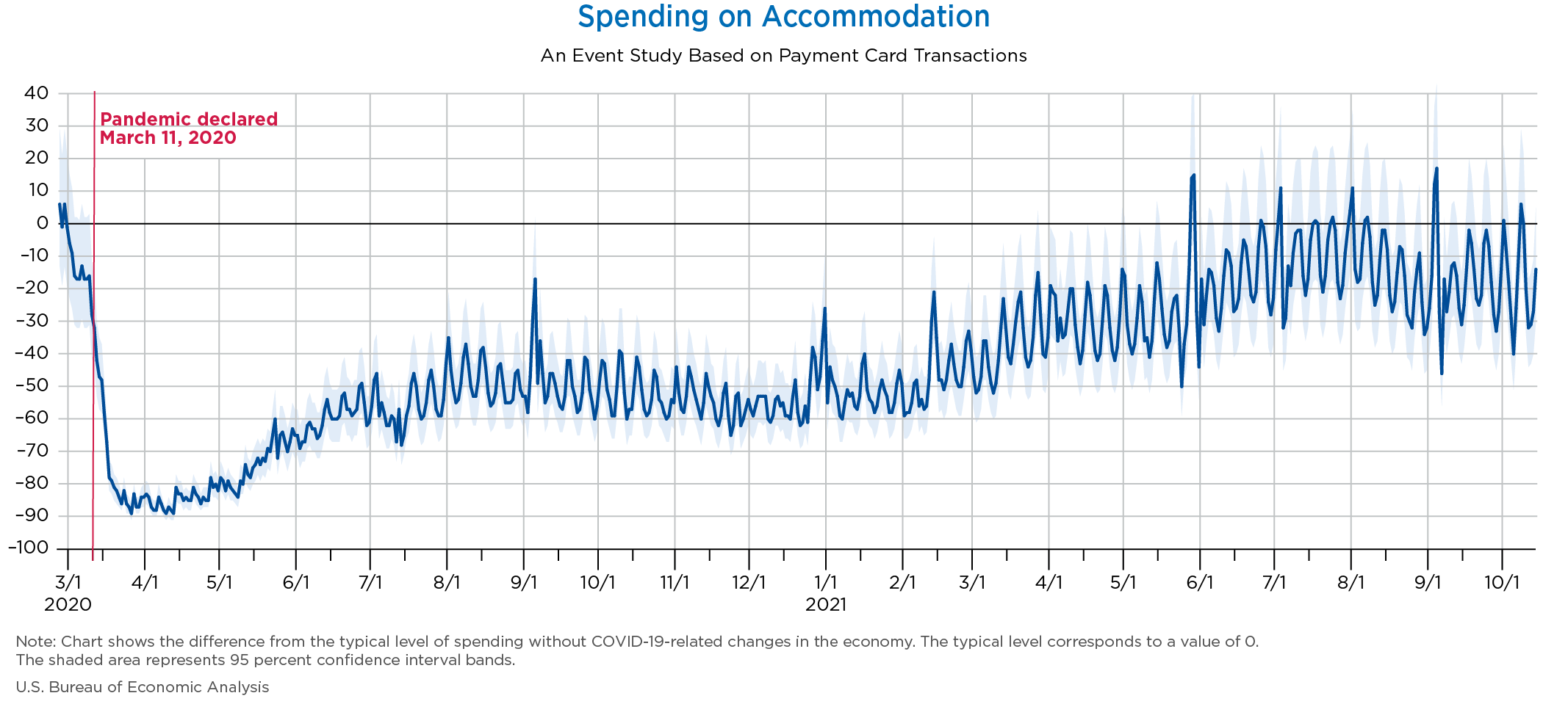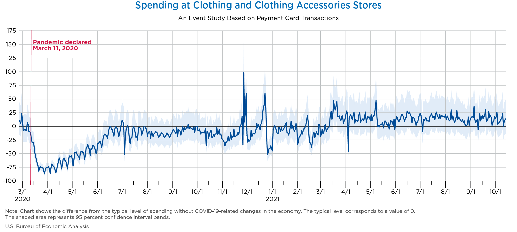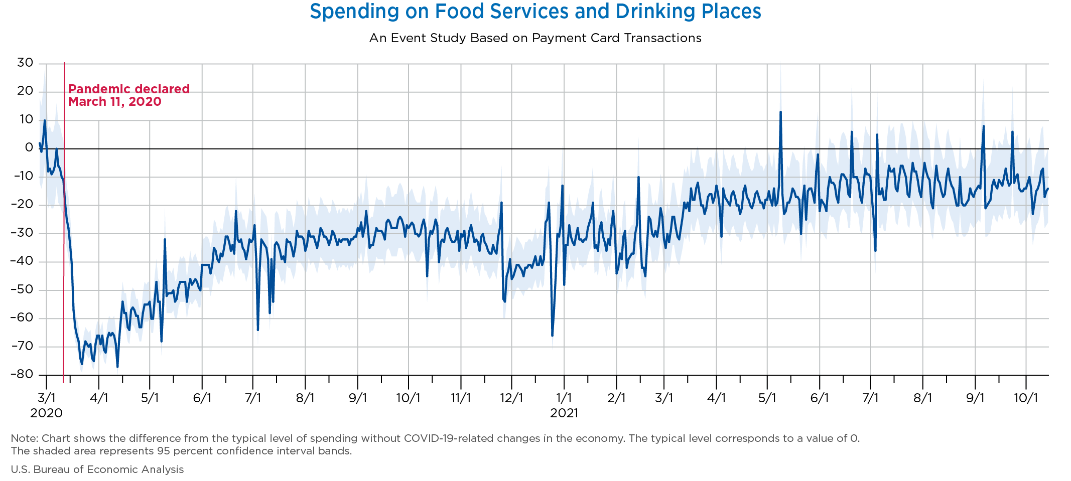 October 19, 2021 Daily Spending by Industry Spending on Food Services and Drinking Places Spending on Accommodation Spending at Clothing and Clothing Accessories Stores Spending on Gasoline Stations Spending on Food and Beverages Spending on Ambulatory Health Care Services Spending on Retail and Food Services (Excluding Nonstore Retailers) Data Weekly Event Study of Estimates Using Card Transactions XLSX Monthly Event Study of Estimates Using Card Transactions XLSX