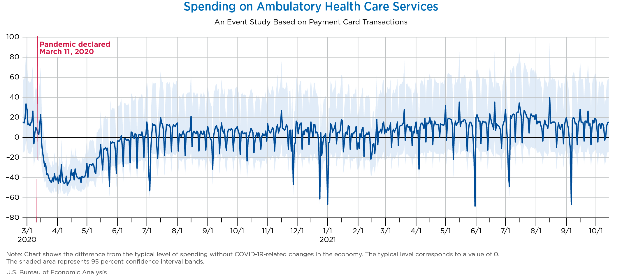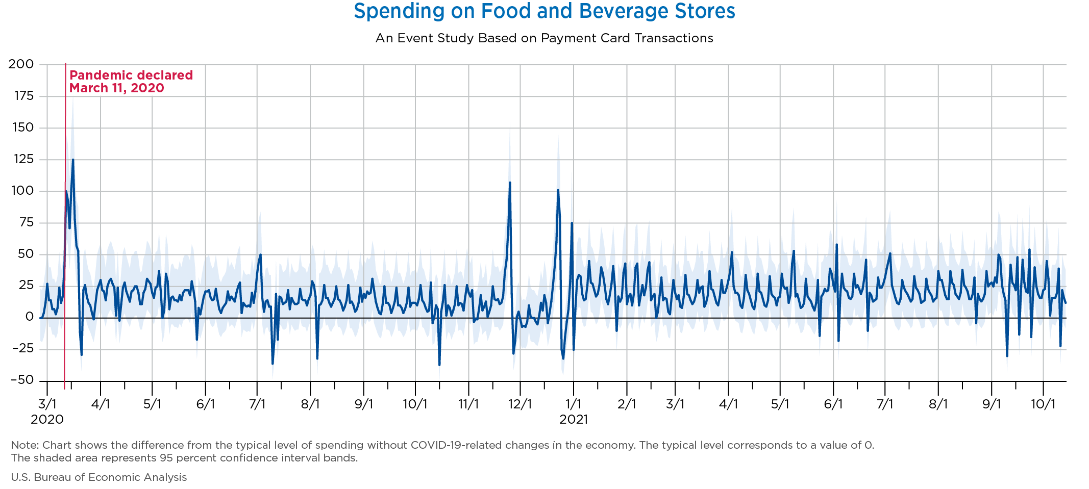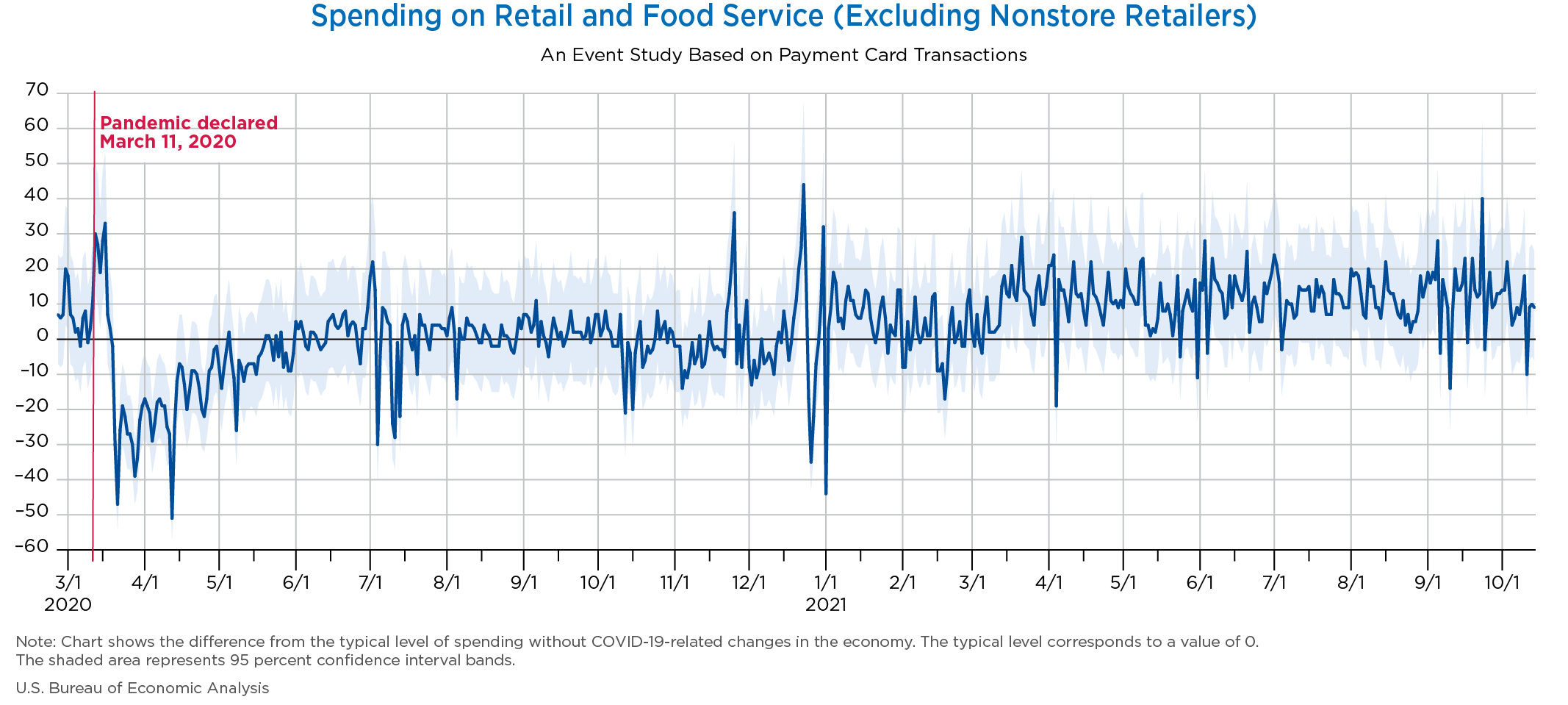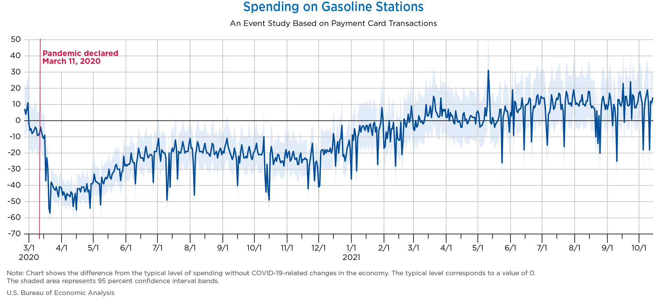 October 19, 2021 Daily Spending by Industry Spending on Food Services and Drinking Places Spending on Accommodation Spending at Clothing and Clothing Accessories Stores Spending on Gasoline Stations Spending on Food and Beverages Spending on Ambulatory Health Care Services Spending on Retail and Food Services (Excluding Nonstore Retailers) Data Weekly Event Study of Estimates Using Card Transactions XLSX Monthly Event Study of Estimates Using Card Transactions XLSX