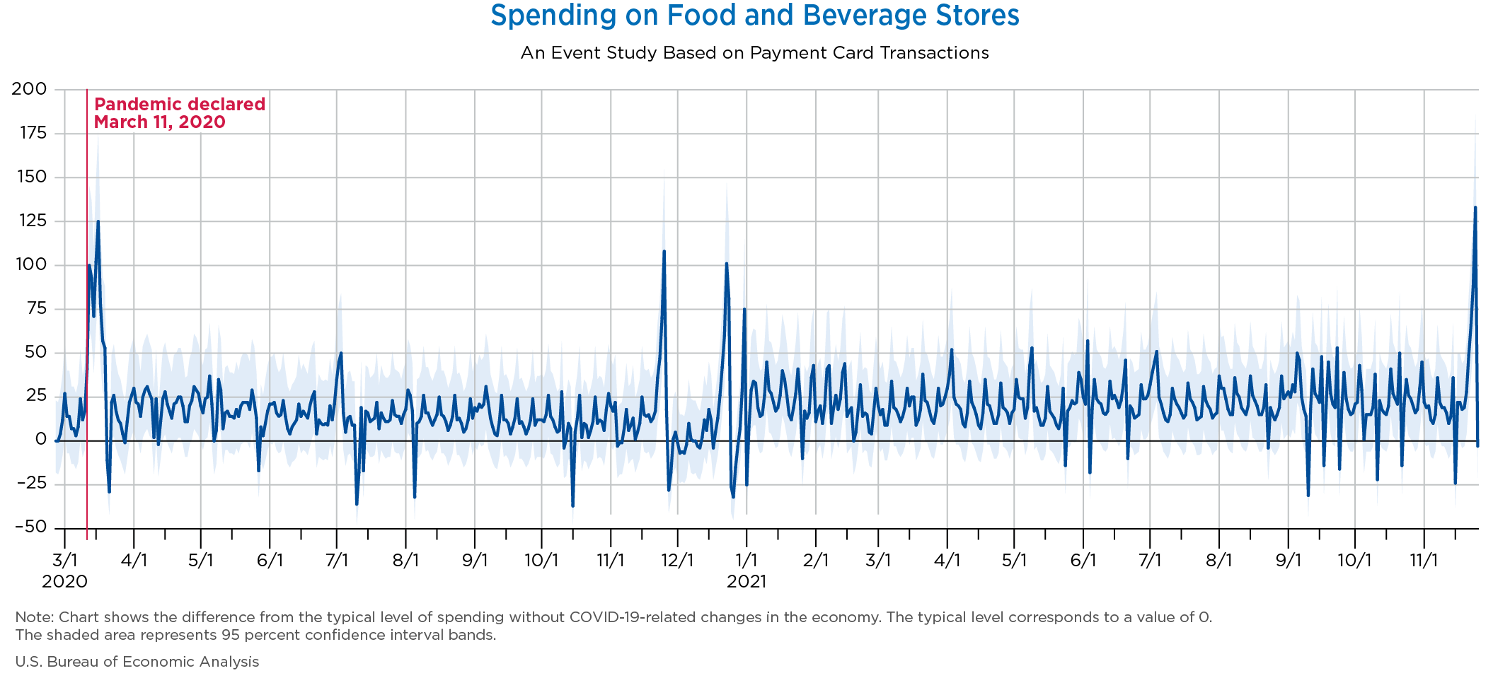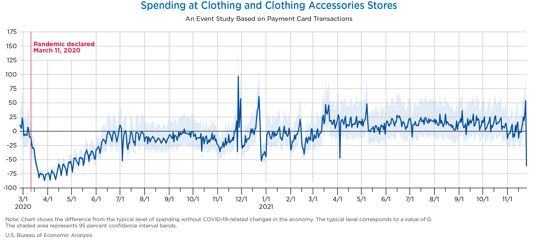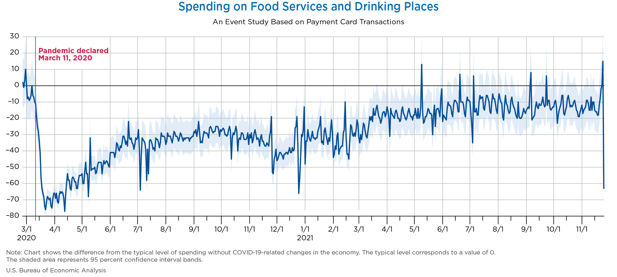 November 30, 2021 Daily Spending by Industry Spending on Food Services and Drinking Places Spending on Accommodation Spending at Clothing and Clothing Accessories Stores Spending on Gasoline Stations Spending on Food and Beverages Spending on Ambulatory Health Care Services Spending on Retail and Food Services (Excluding Nonstore Retailers) Data Weekly Event Study of Estimates Using Card Transactions XLSX Monthly Event Study of Estimates Using Card Transactions XLSX