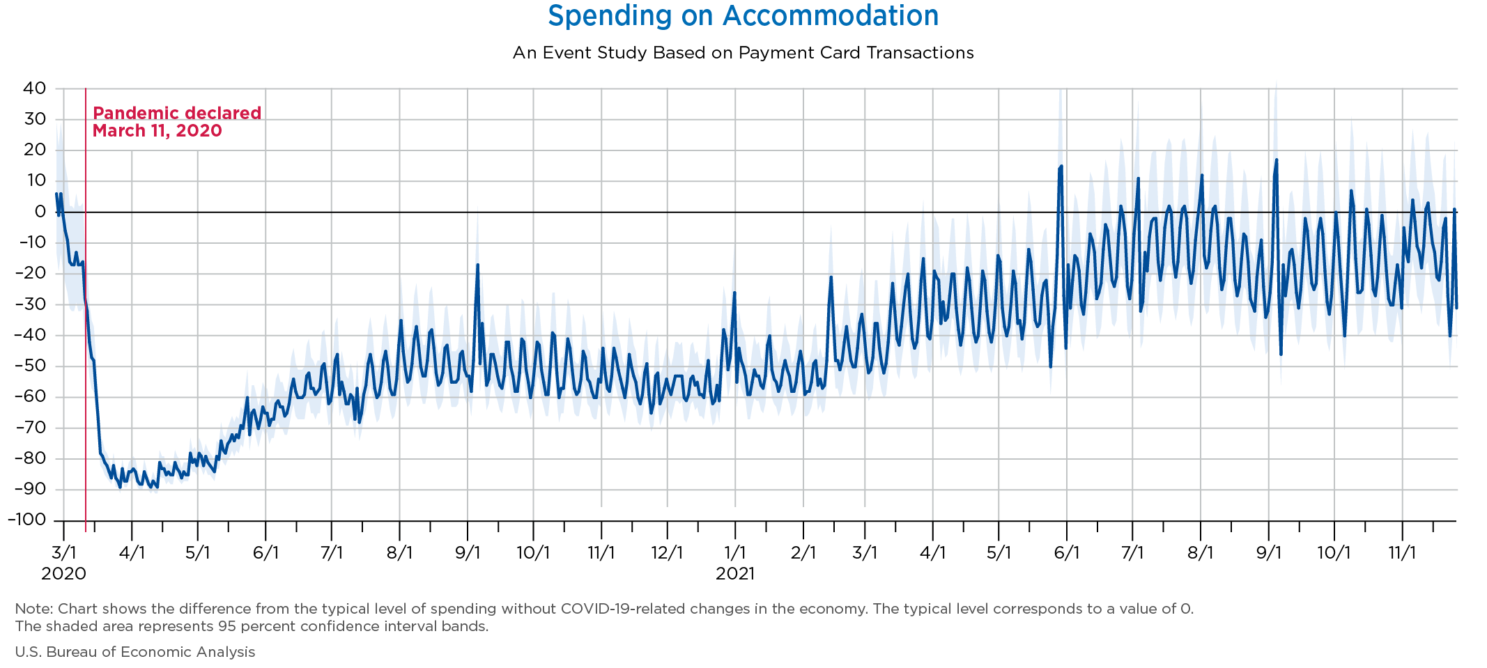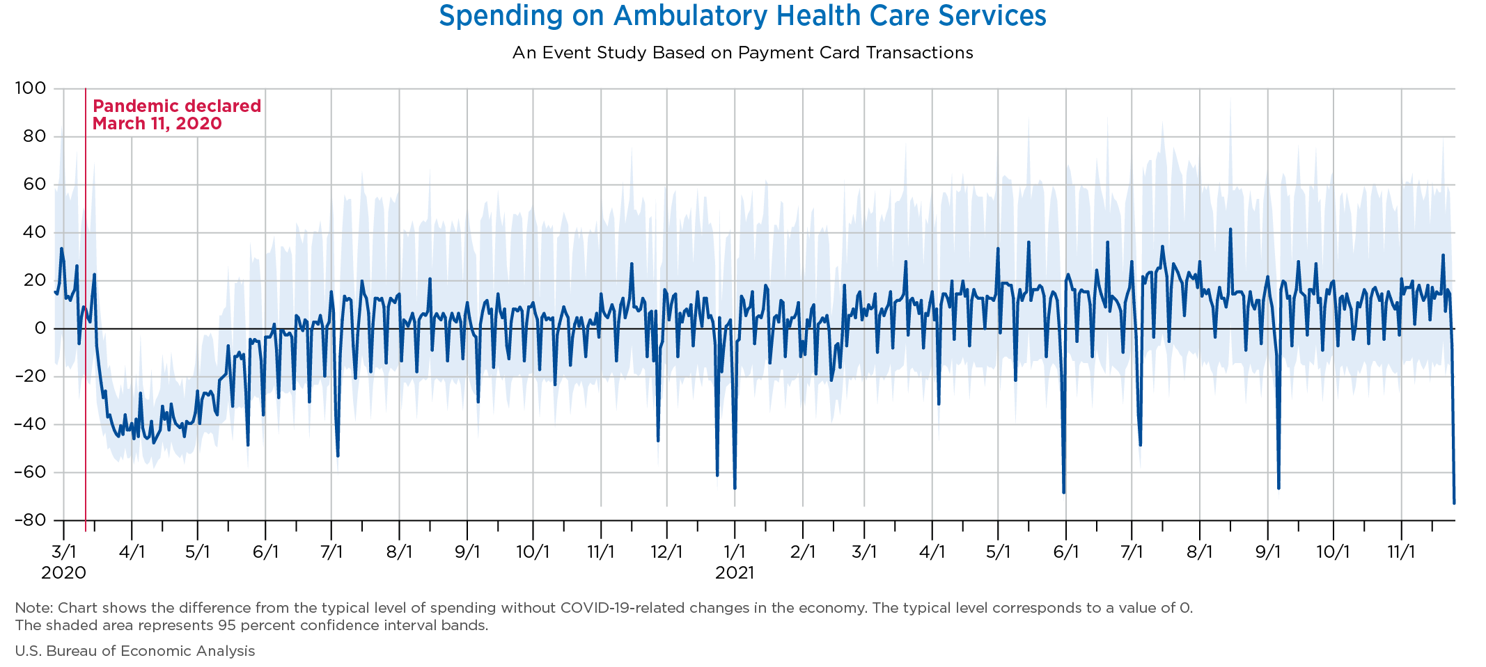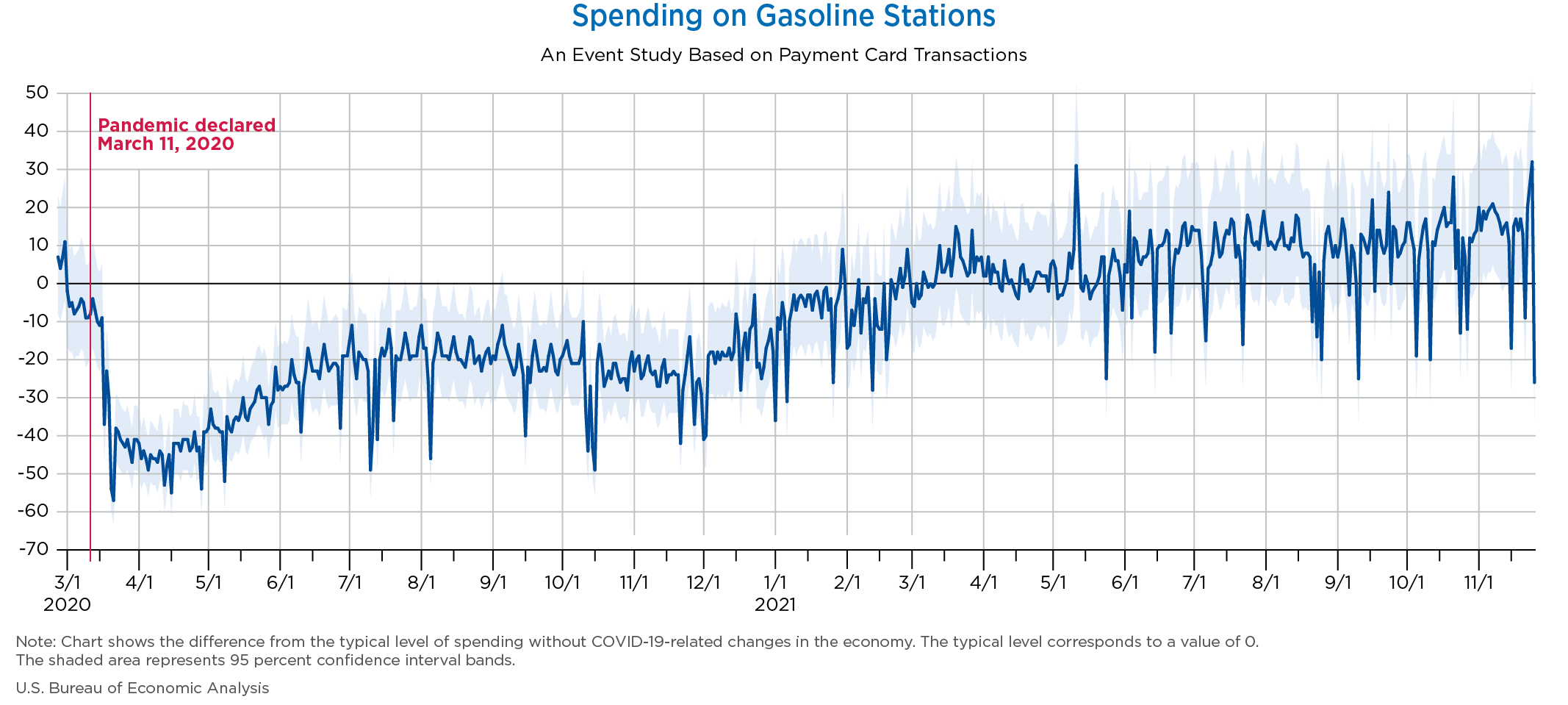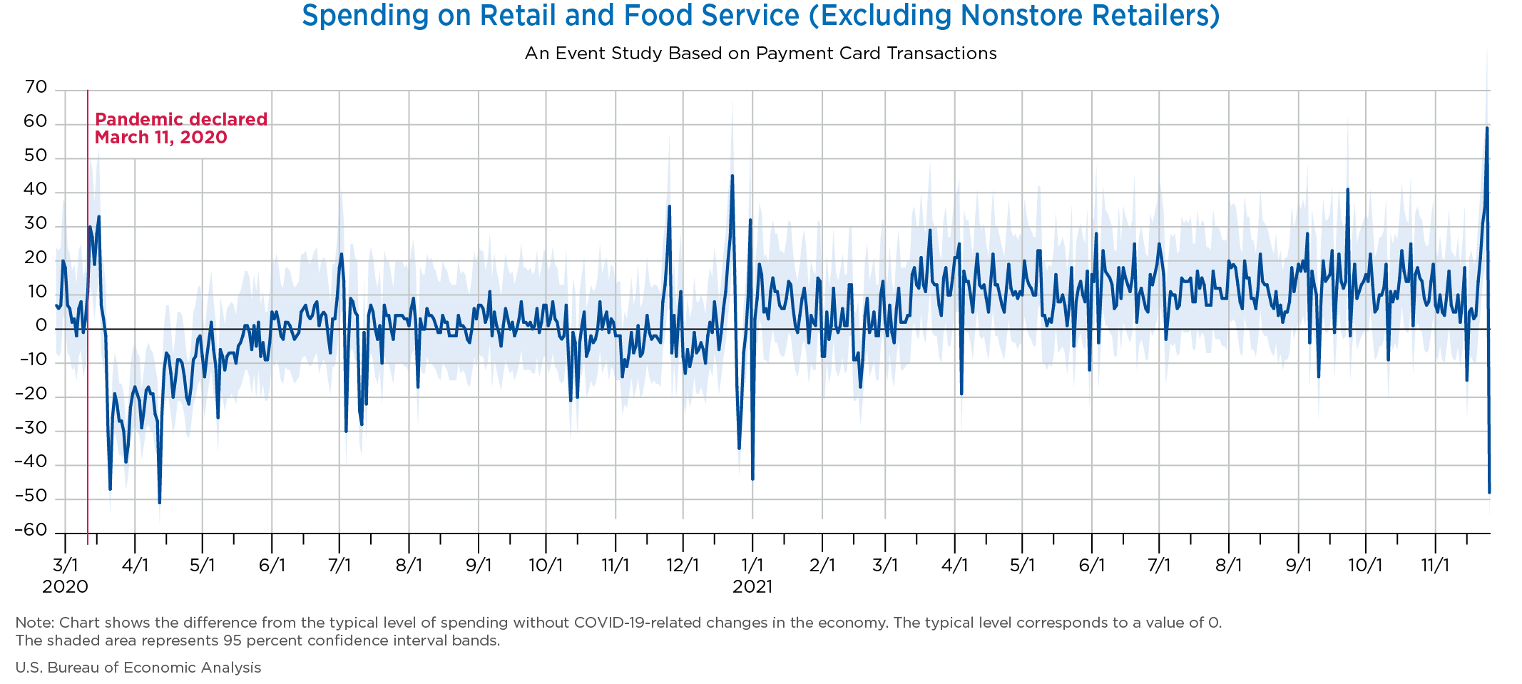 November 30, 2021 Daily Spending by Industry Spending on Food Services and Drinking Places Spending on Accommodation Spending at Clothing and Clothing Accessories Stores Spending on Gasoline Stations Spending on Food and Beverages Spending on Ambulatory Health Care Services Spending on Retail and Food Services (Excluding Nonstore Retailers) Data Weekly Event Study of Estimates Using Card Transactions XLSX Monthly Event Study of Estimates Using Card Transactions XLSX
