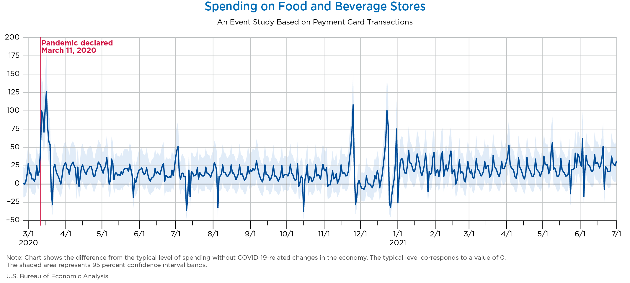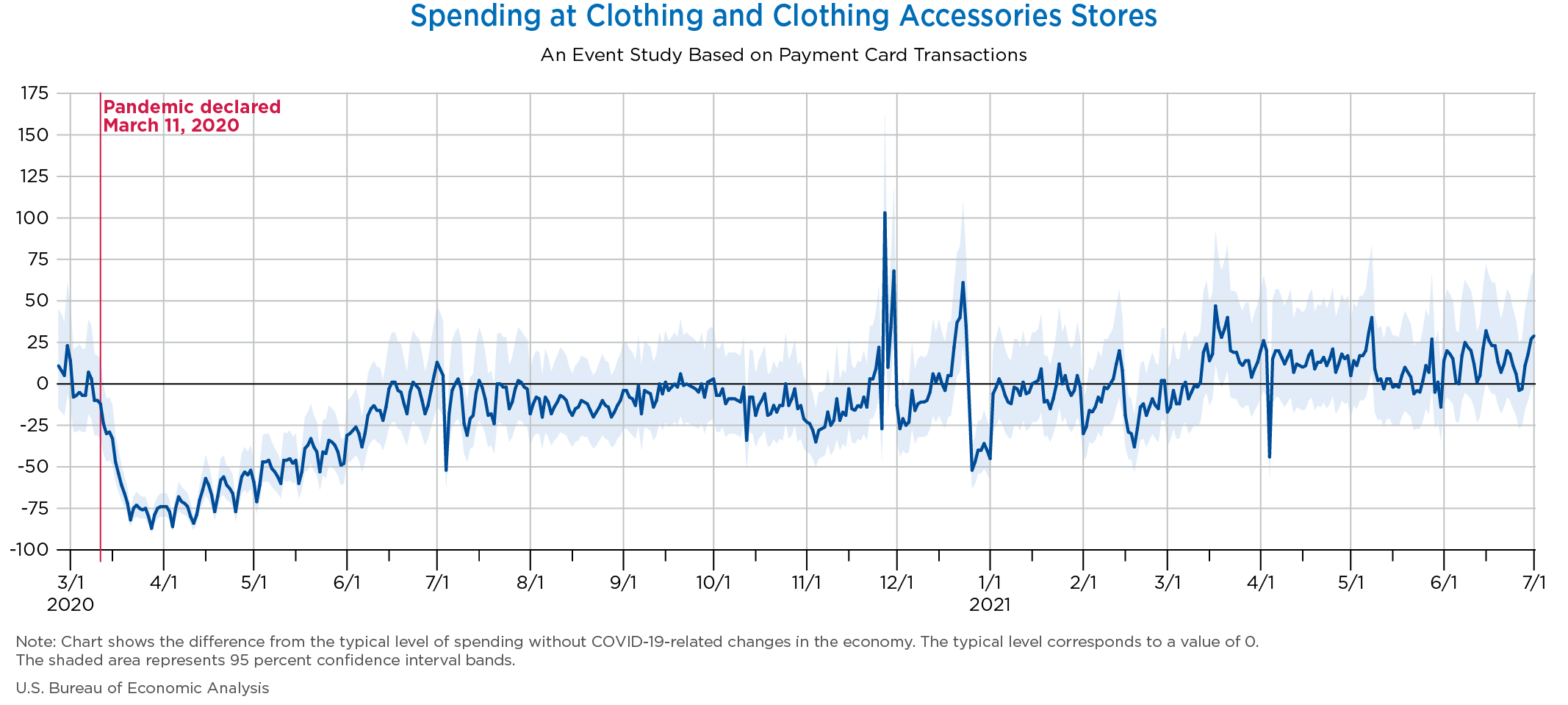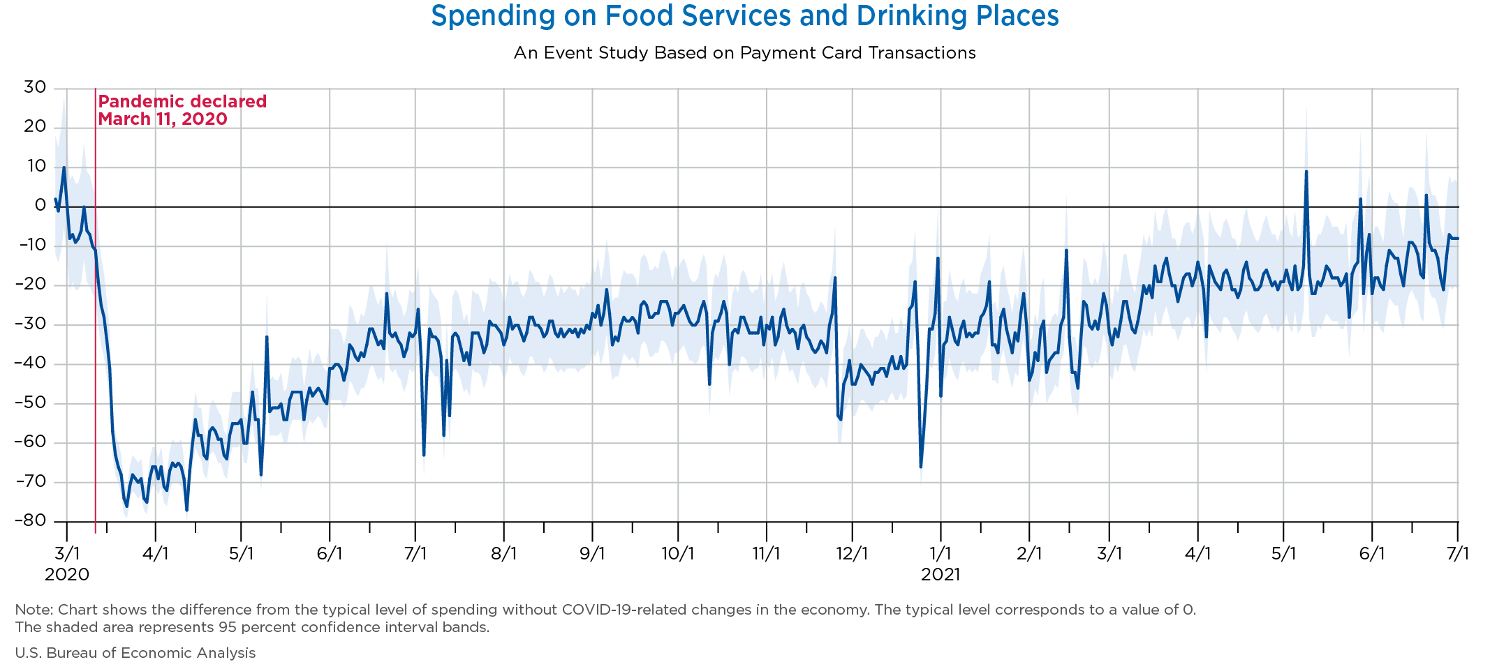 July 6, 2021 Daily Spending by Industry Spending on Food Services and Drinking Places Spending on Accommodation Spending at Clothing and Clothing Accessories Stores Spending on Gasoline Stations Spending on Food and Beverages Spending on Ambulatory Health Care Services Spending on Retail and Food Services (Excluding Nonstore Retailers) Data Weekly Event Study of Estimates Using Card Transactions XLSX Monthly Event Study of Estimates Using Card Transactions XLSX