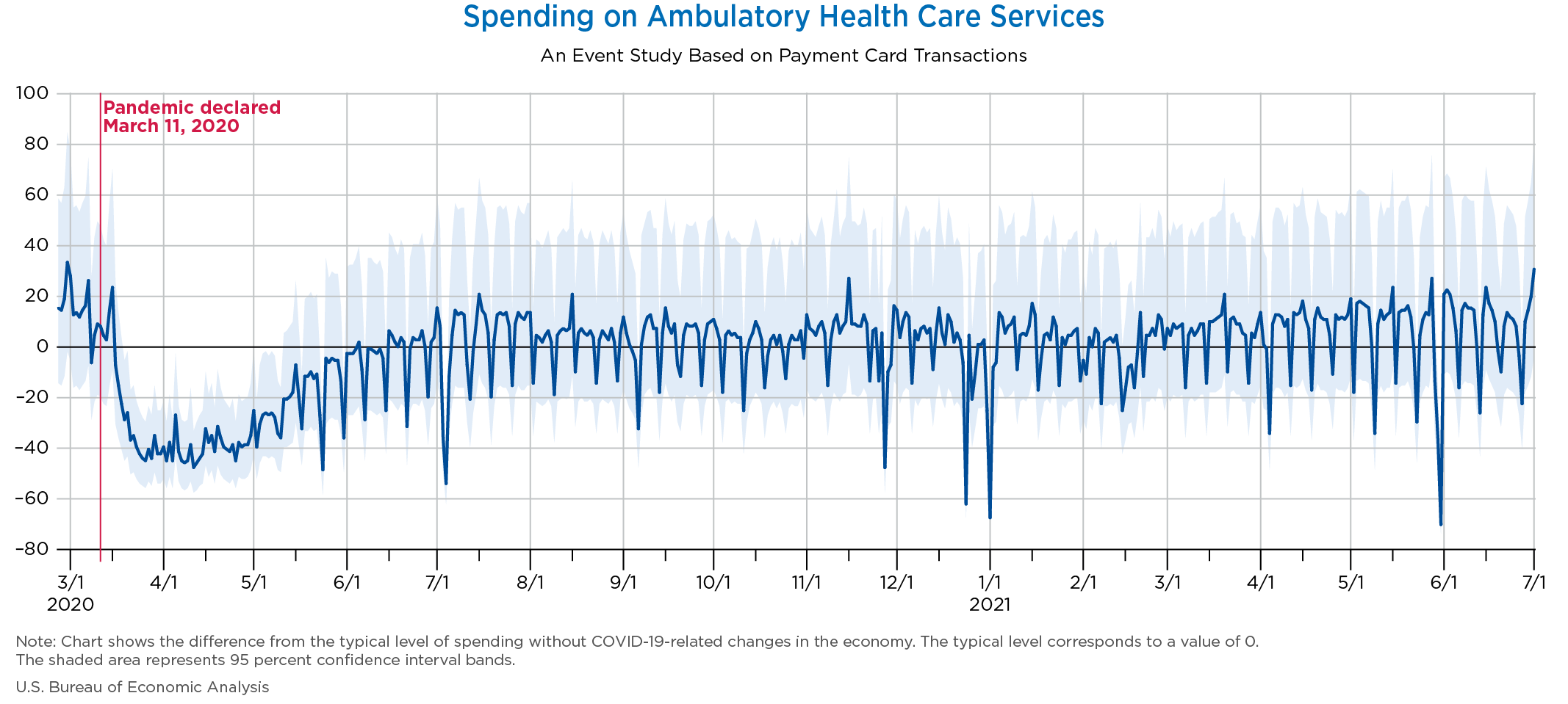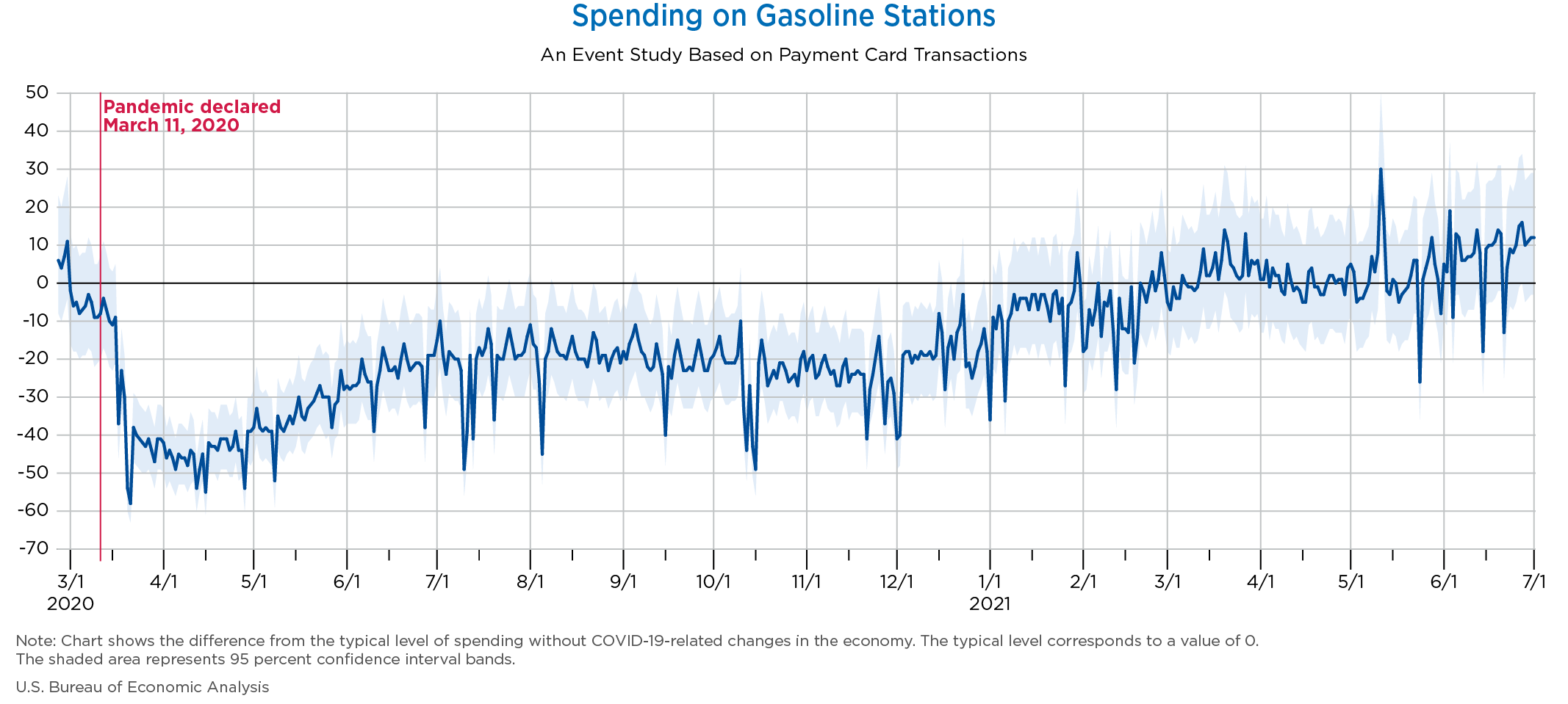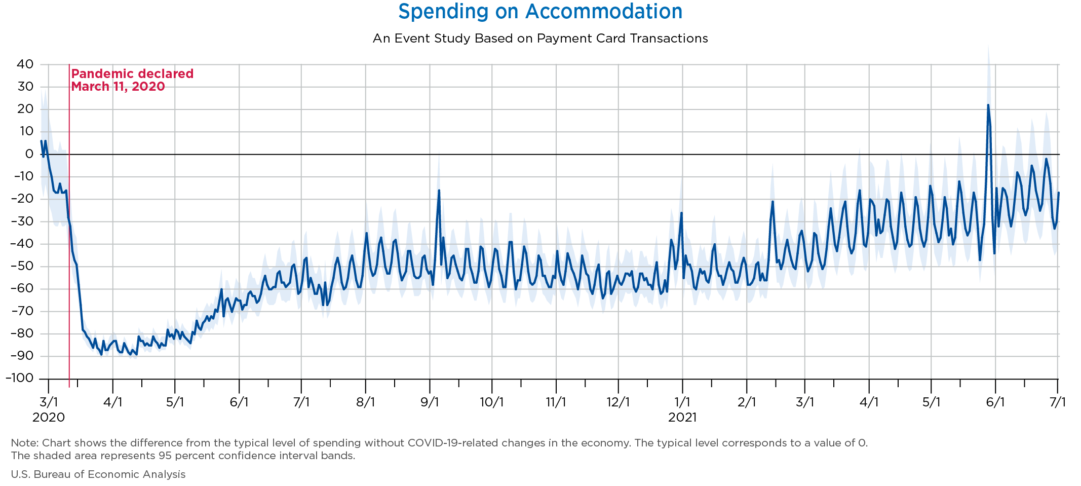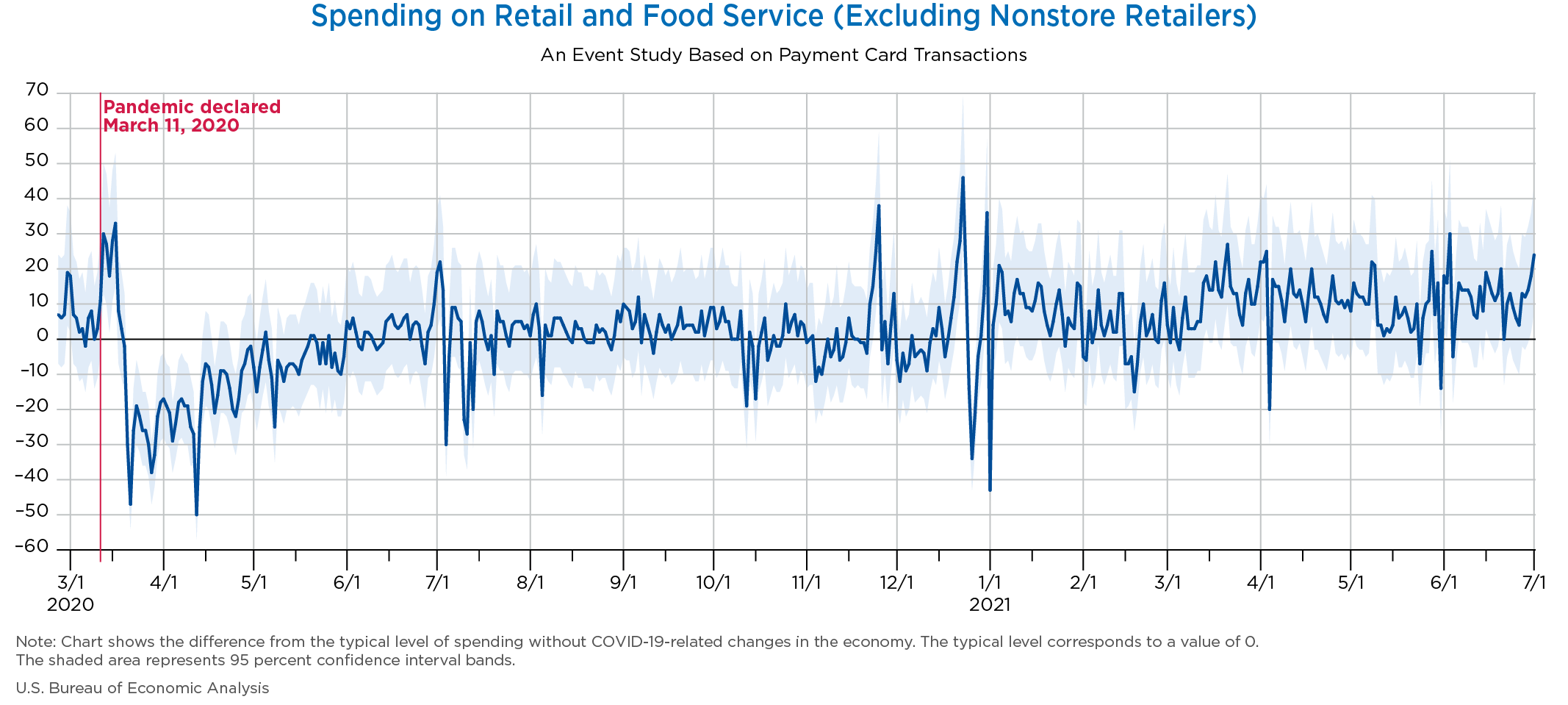 July 6, 2021 Daily Spending by Industry Spending on Food Services and Drinking Places Spending on Accommodation Spending at Clothing and Clothing Accessories Stores Spending on Gasoline Stations Spending on Food and Beverages Spending on Ambulatory Health Care Services Spending on Retail and Food Services (Excluding Nonstore Retailers) Data Weekly Event Study of Estimates Using Card Transactions XLSX Monthly Event Study of Estimates Using Card Transactions XLSX