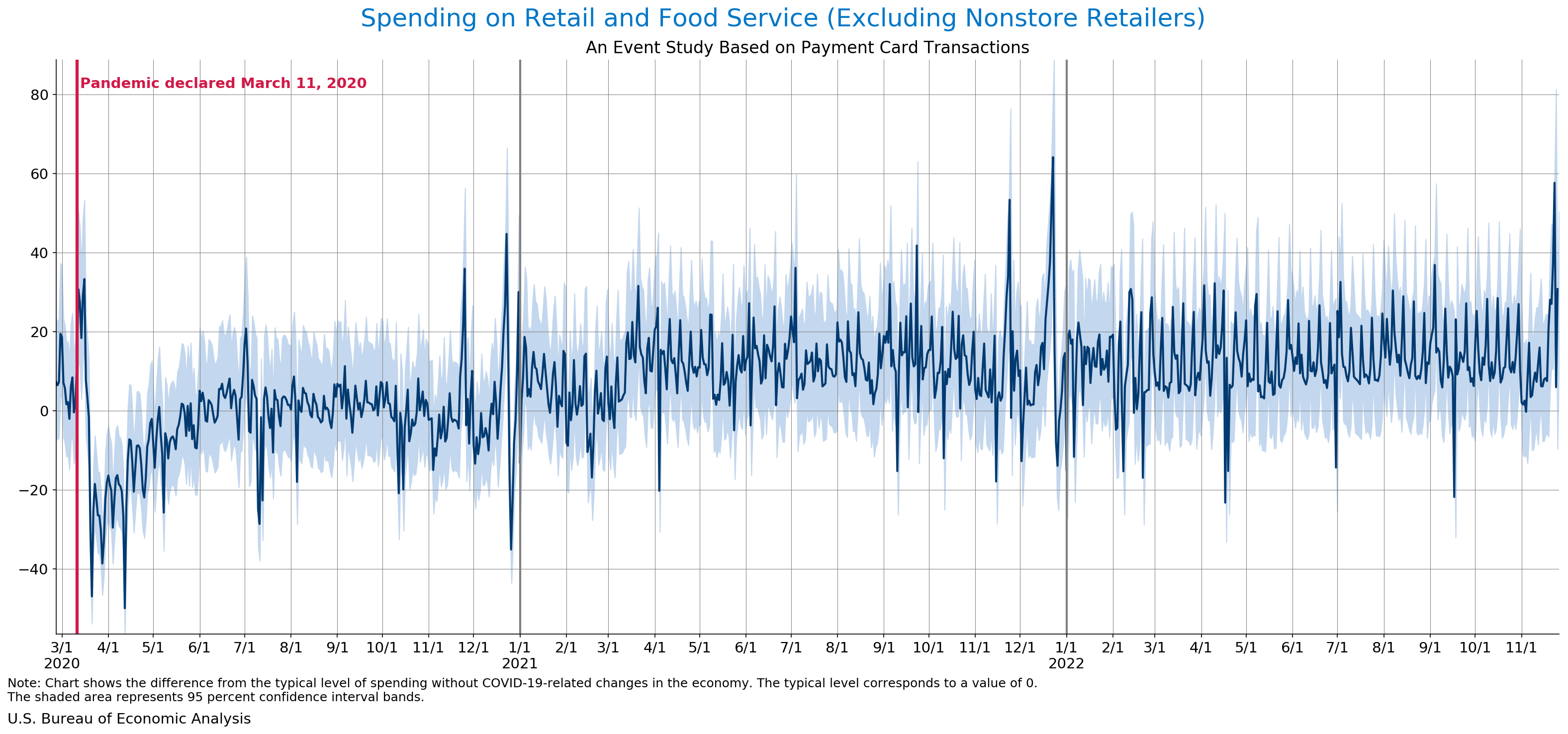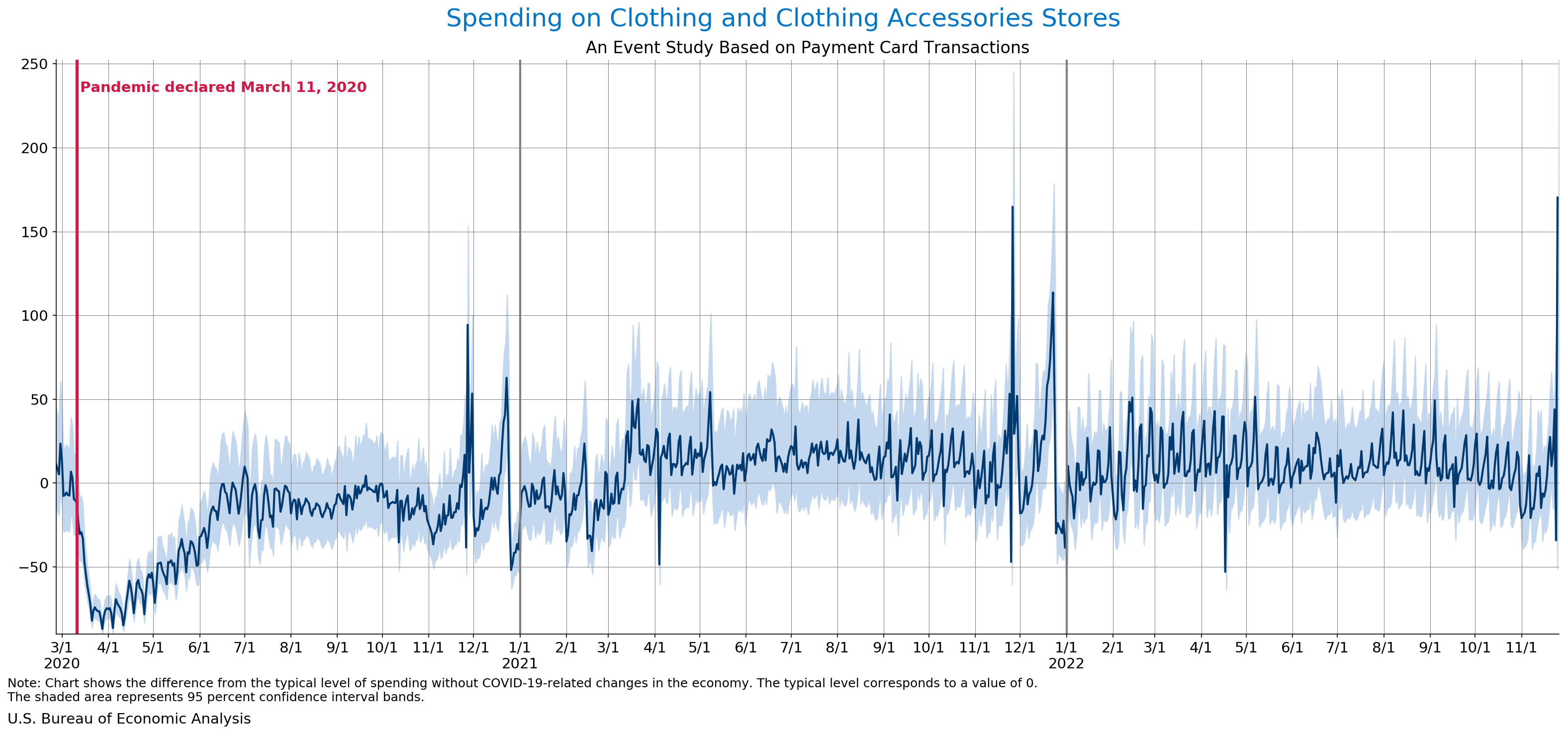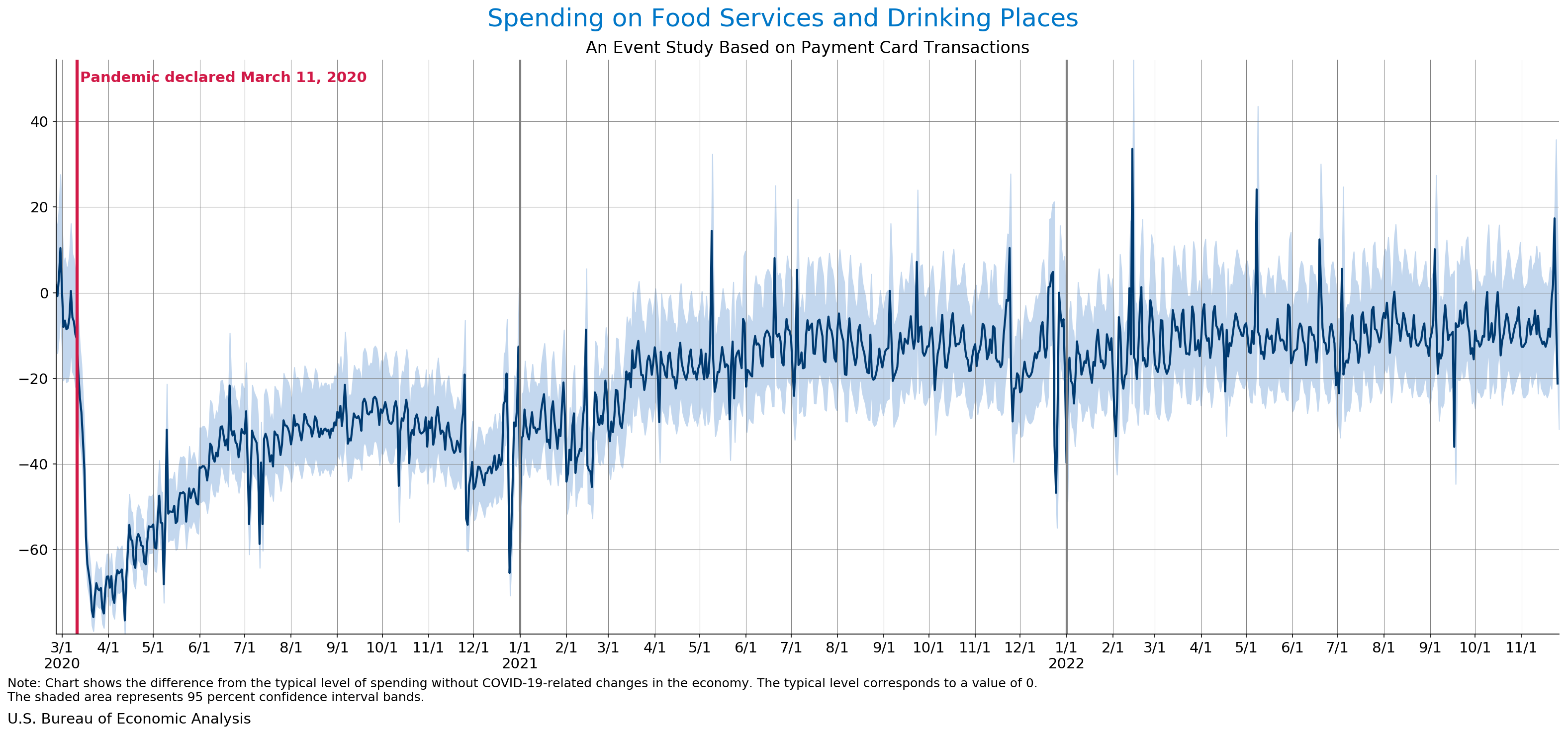 November 30, 2022 Daily Spending by Industry Spending on Food Services and Drinking Places Spending on Accommodation Spending at Clothing and Clothing Accessories Stores Spending on Gasoline Stations Spending on Food and Beverages Spending on Ambulatory Health Care Services Spending on Retail and Food Services (Excluding Nonstore Retailers) Data Weekly Event Study of Estimates Using Card Transactions XLSX Weekly Event Study of Spending Estimates Using Card Transactions CSV Monthly Event Study of Estimates Using Card Transactions XLSX