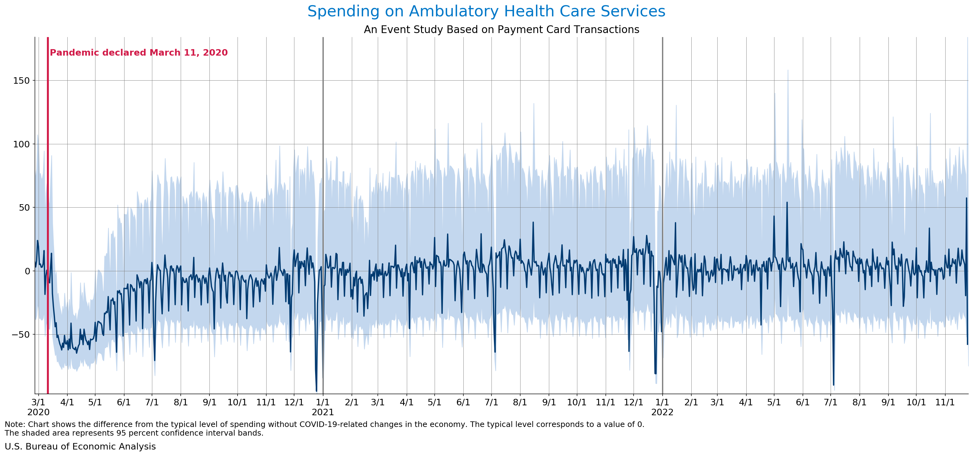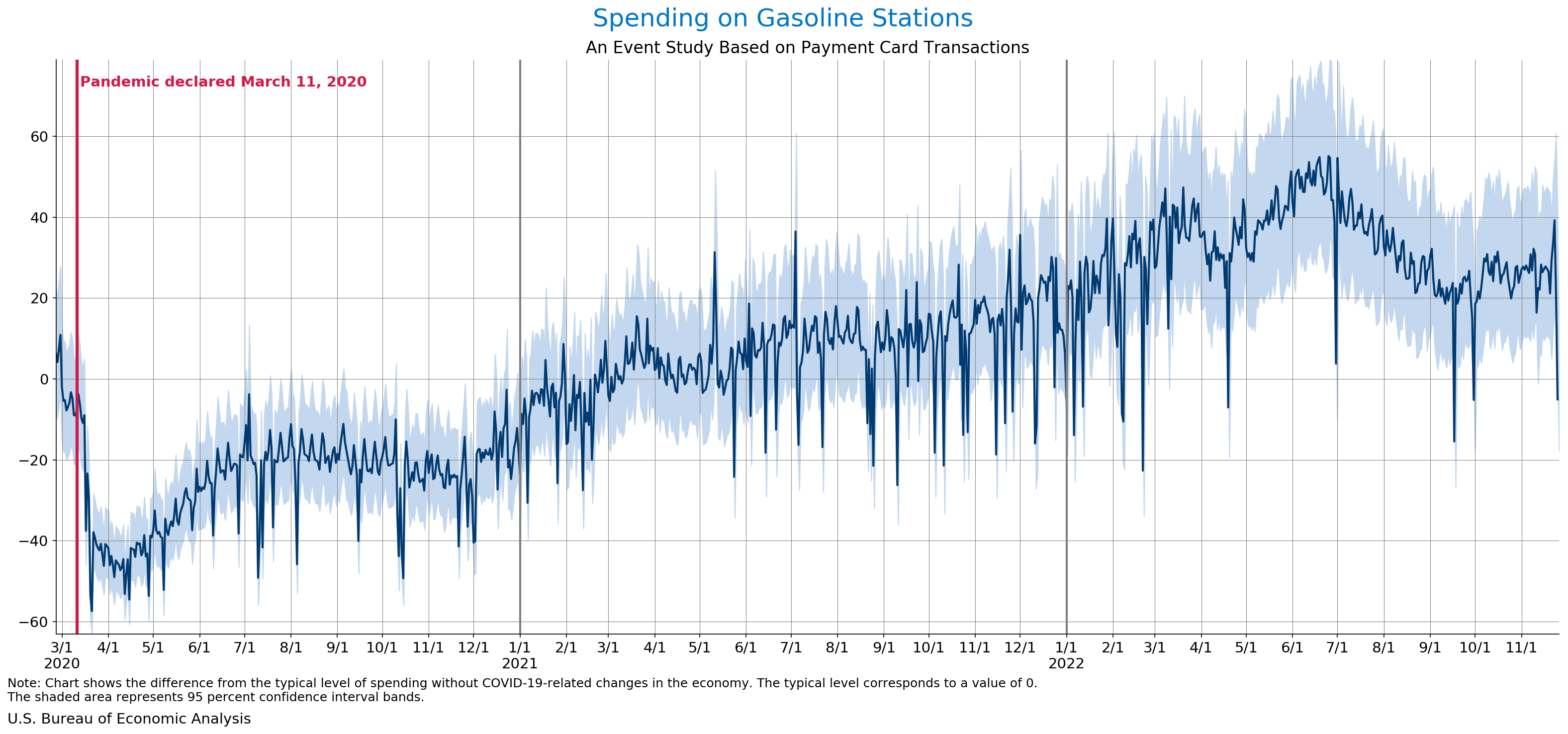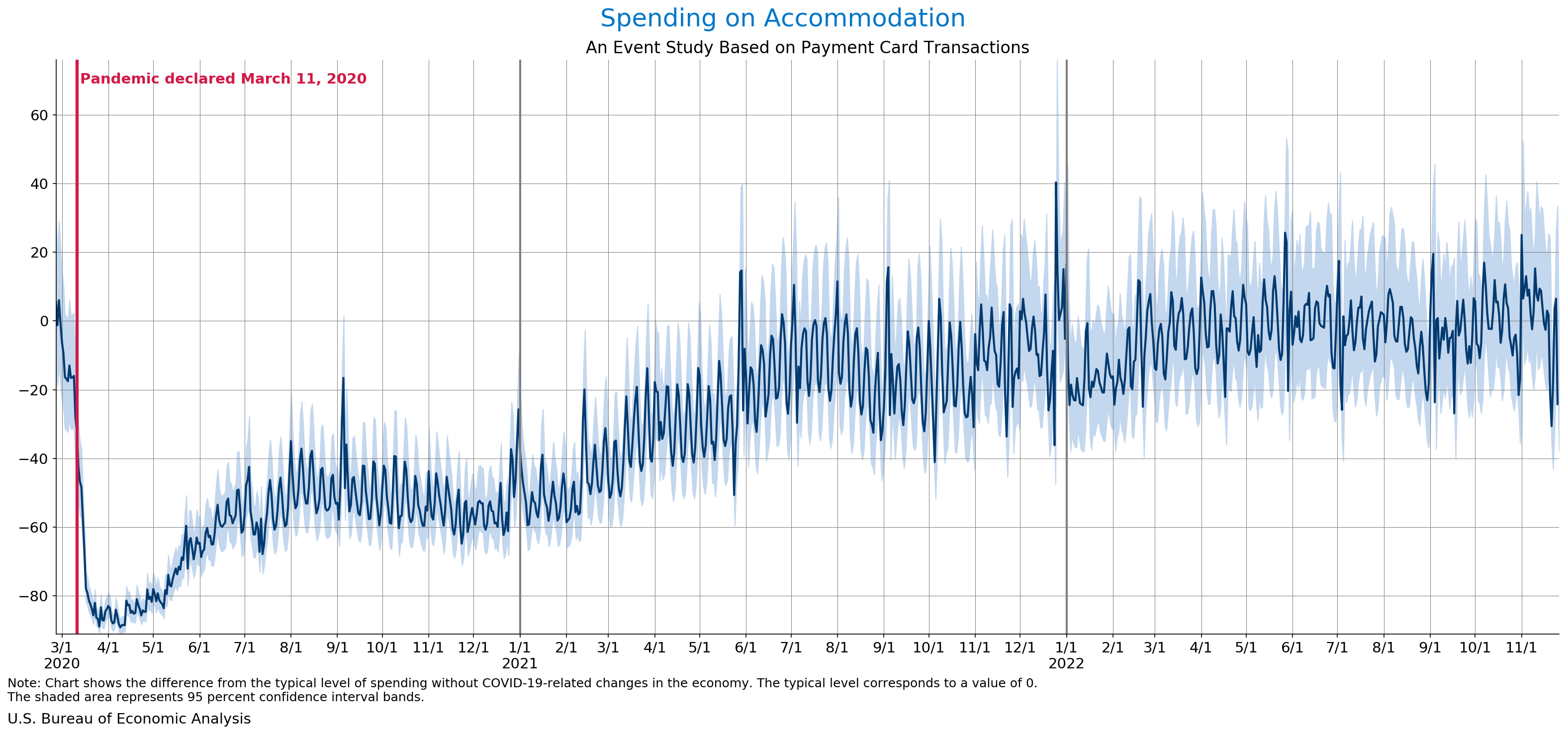 November 30, 2022 Daily Spending by Industry Spending on Food Services and Drinking Places Spending on Accommodation Spending at Clothing and Clothing Accessories Stores Spending on Gasoline Stations Spending on Food and Beverages Spending on Ambulatory Health Care Services Spending on Retail and Food Services (Excluding Nonstore Retailers) Data Weekly Event Study of Estimates Using Card Transactions XLSX Weekly Event Study of Spending Estimates Using Card Transactions CSV Monthly Event Study of Estimates Using Card Transactions XLSX