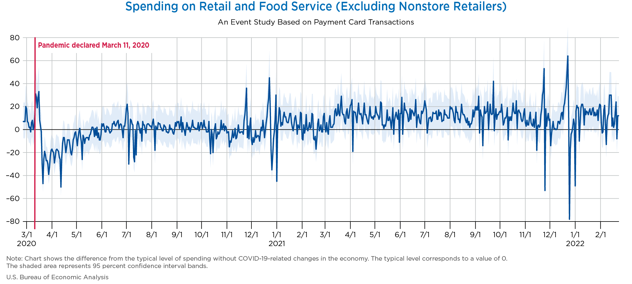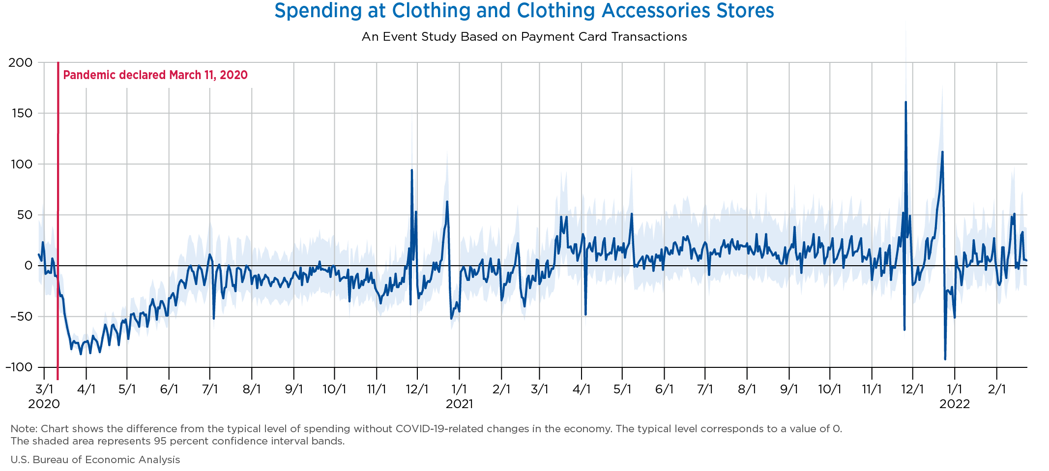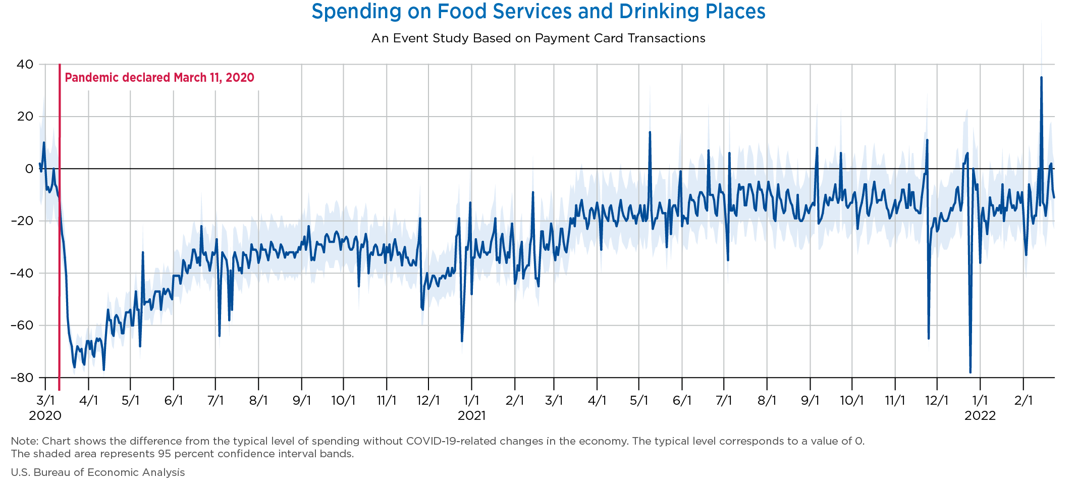 February 28, 2022 Daily Spending by Industry Spending on Food Services and Drinking Places Spending on Accommodation Spending at Clothing and Clothing Accessories Stores Spending on Gasoline Stations Spending on Food and Beverages Spending on Ambulatory Health Care Services Spending on Retail and Food Services (Excluding Nonstore Retailers) Data Weekly Event Study of Estimates Using Card Transactions XLSX Monthly Event Study of Estimates Using Card Transactions XLSX