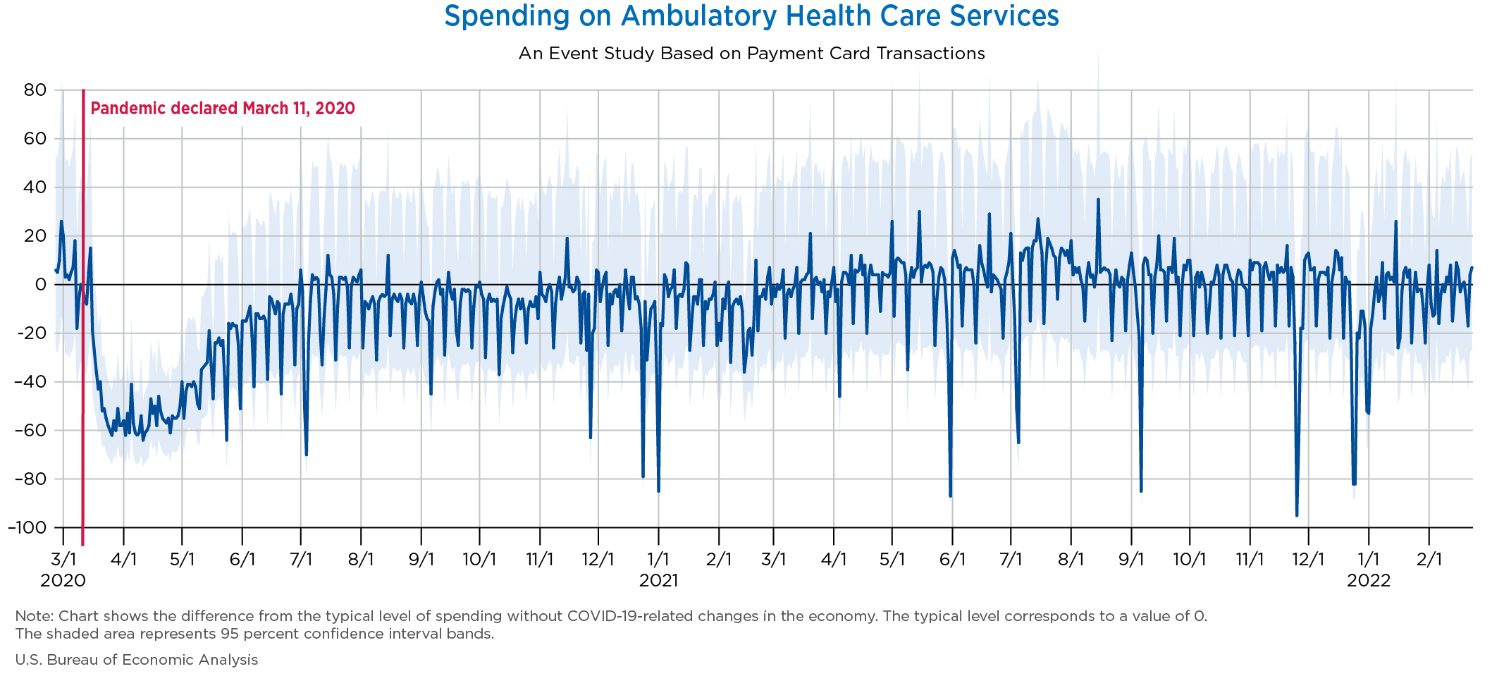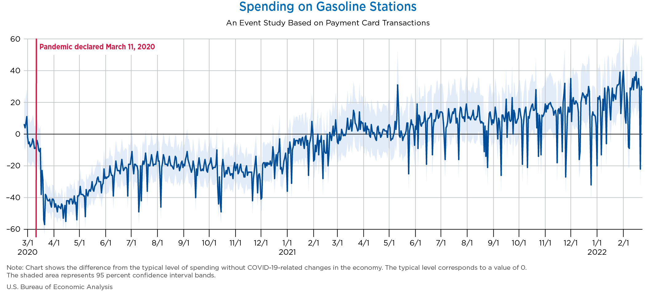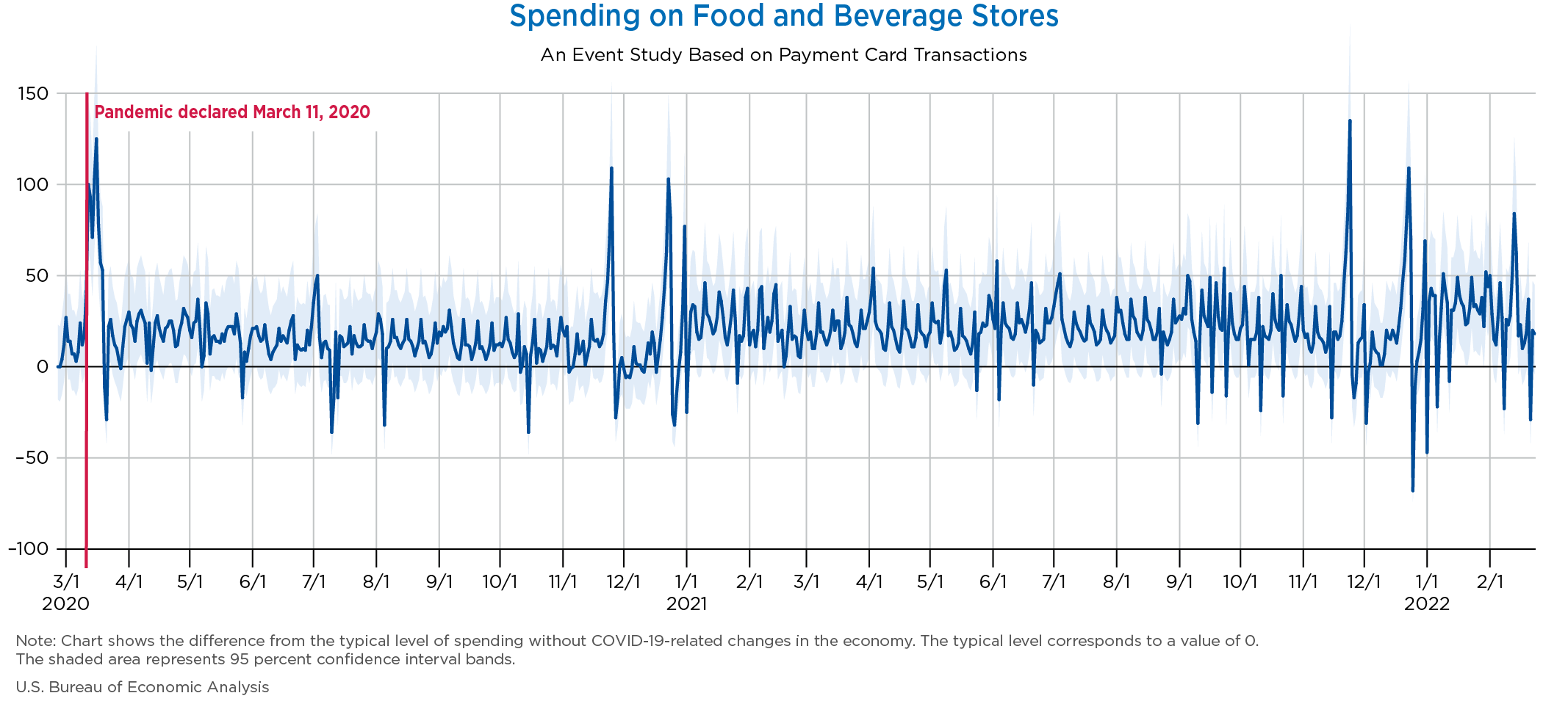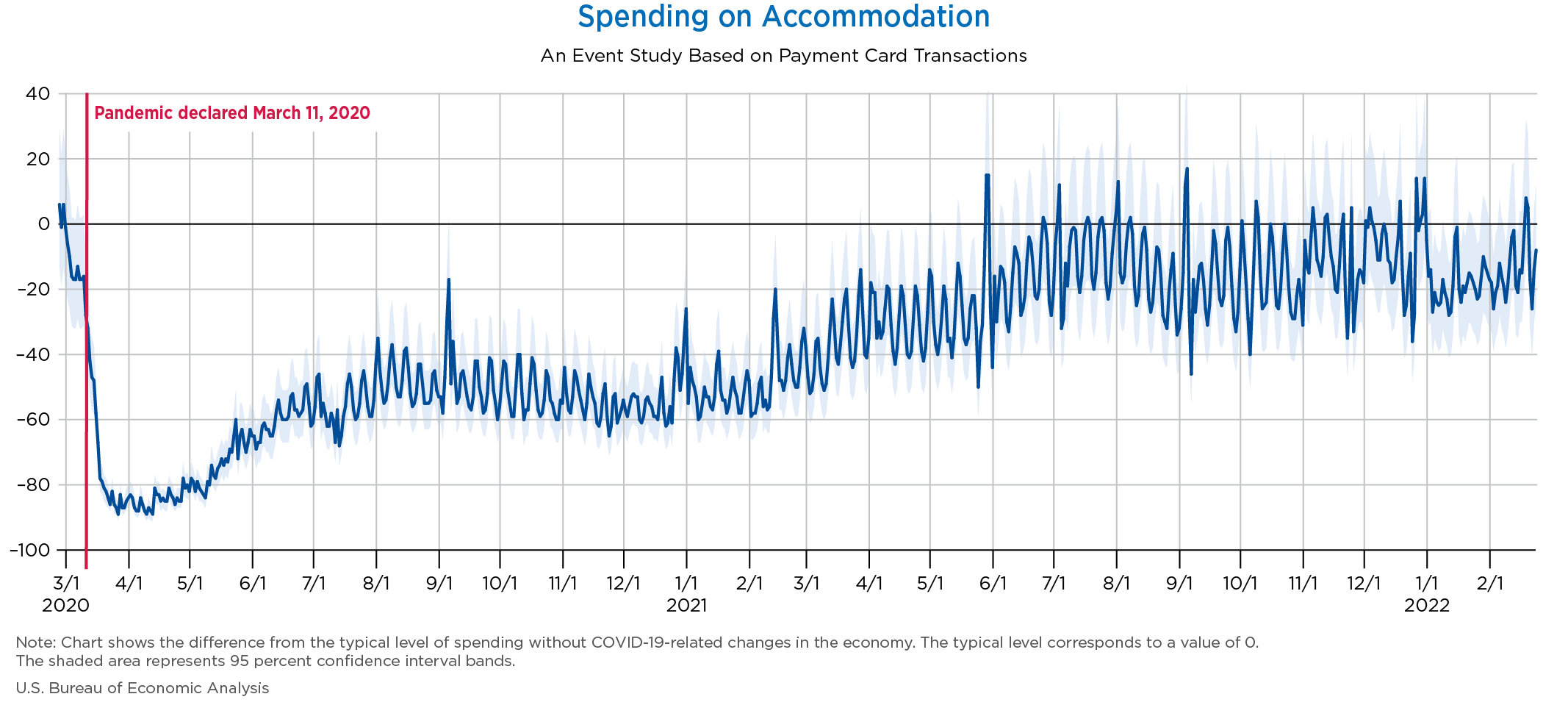 February 28, 2022 Daily Spending by Industry Spending on Food Services and Drinking Places Spending on Accommodation Spending at Clothing and Clothing Accessories Stores Spending on Gasoline Stations Spending on Food and Beverages Spending on Ambulatory Health Care Services Spending on Retail and Food Services (Excluding Nonstore Retailers) Data Weekly Event Study of Estimates Using Card Transactions XLSX Monthly Event Study of Estimates Using Card Transactions XLSX