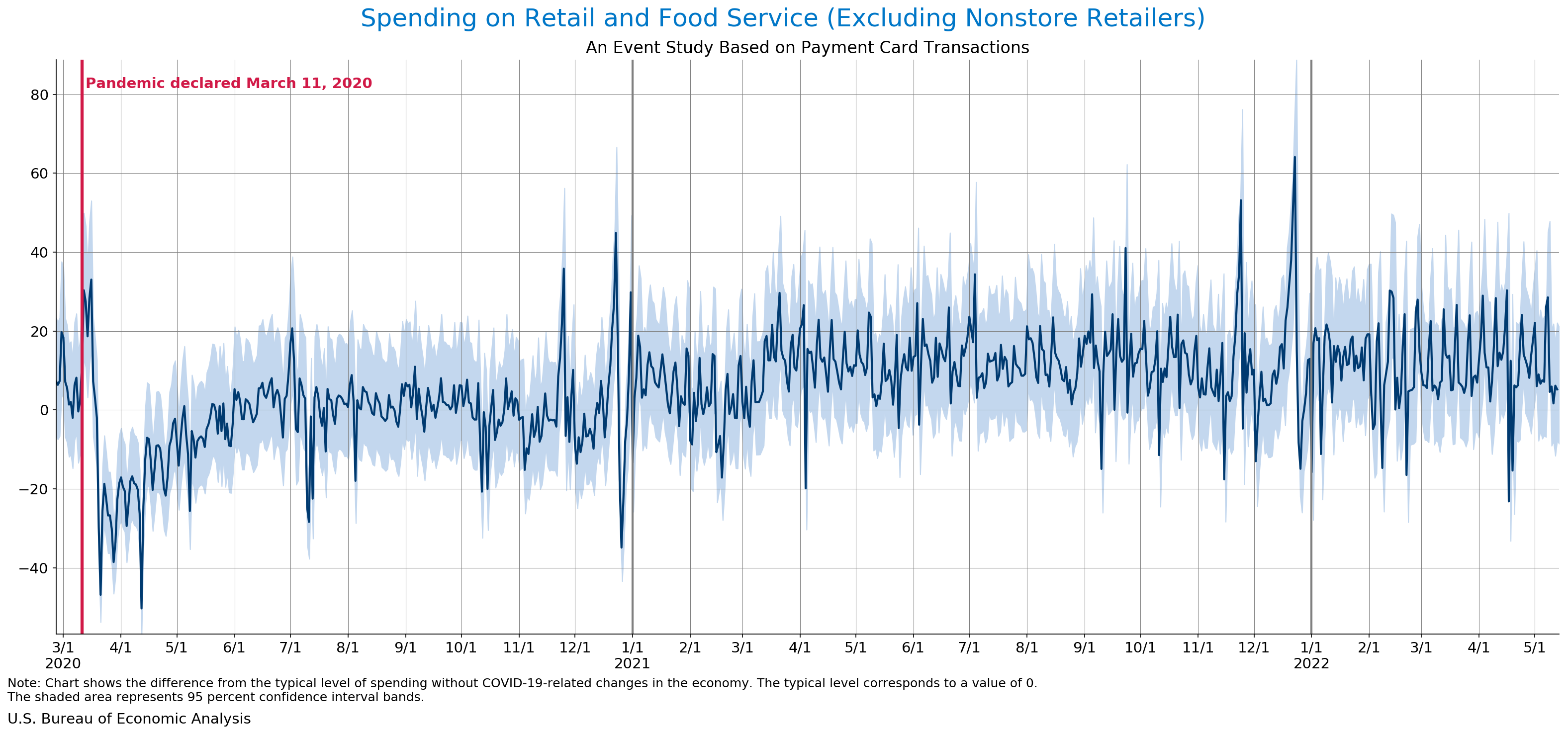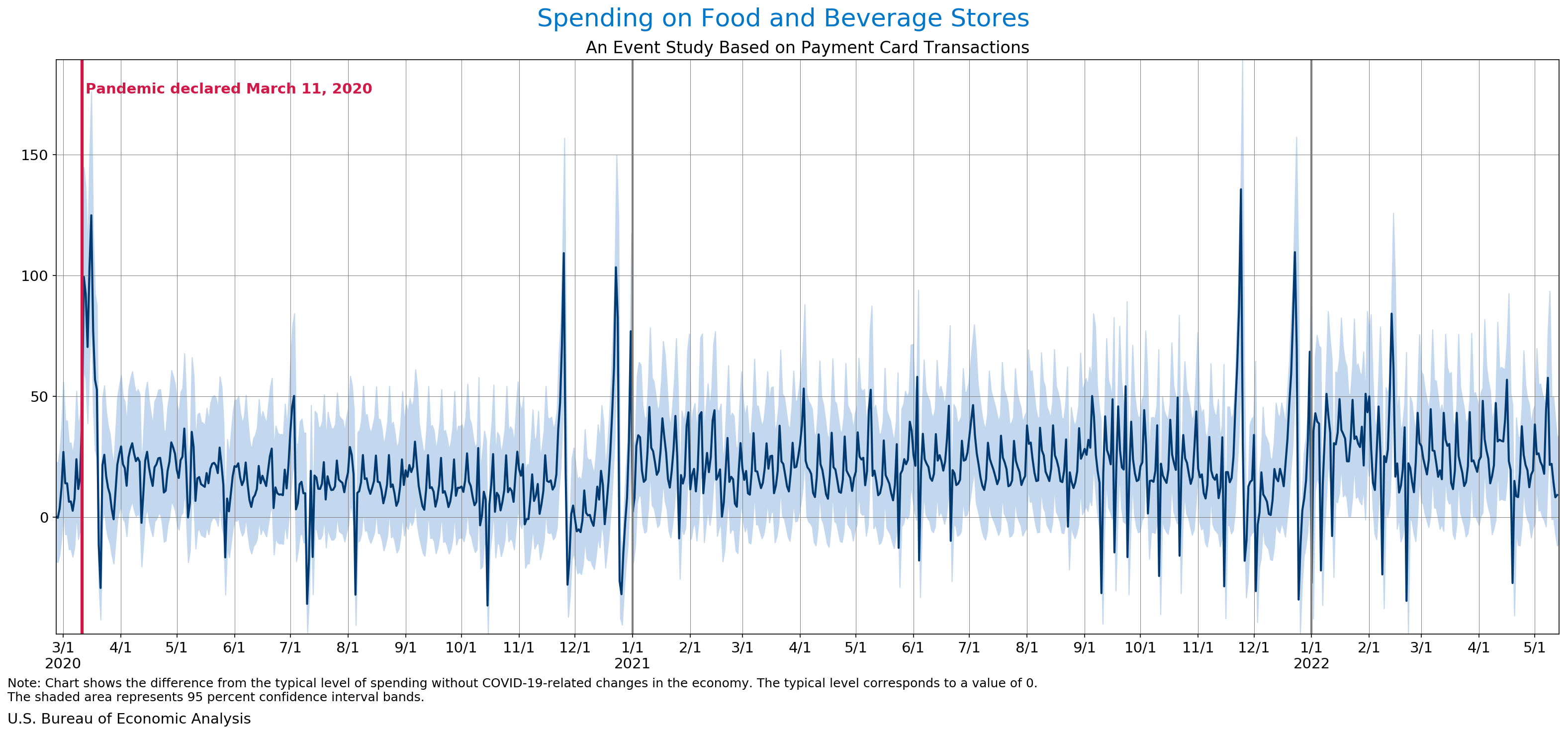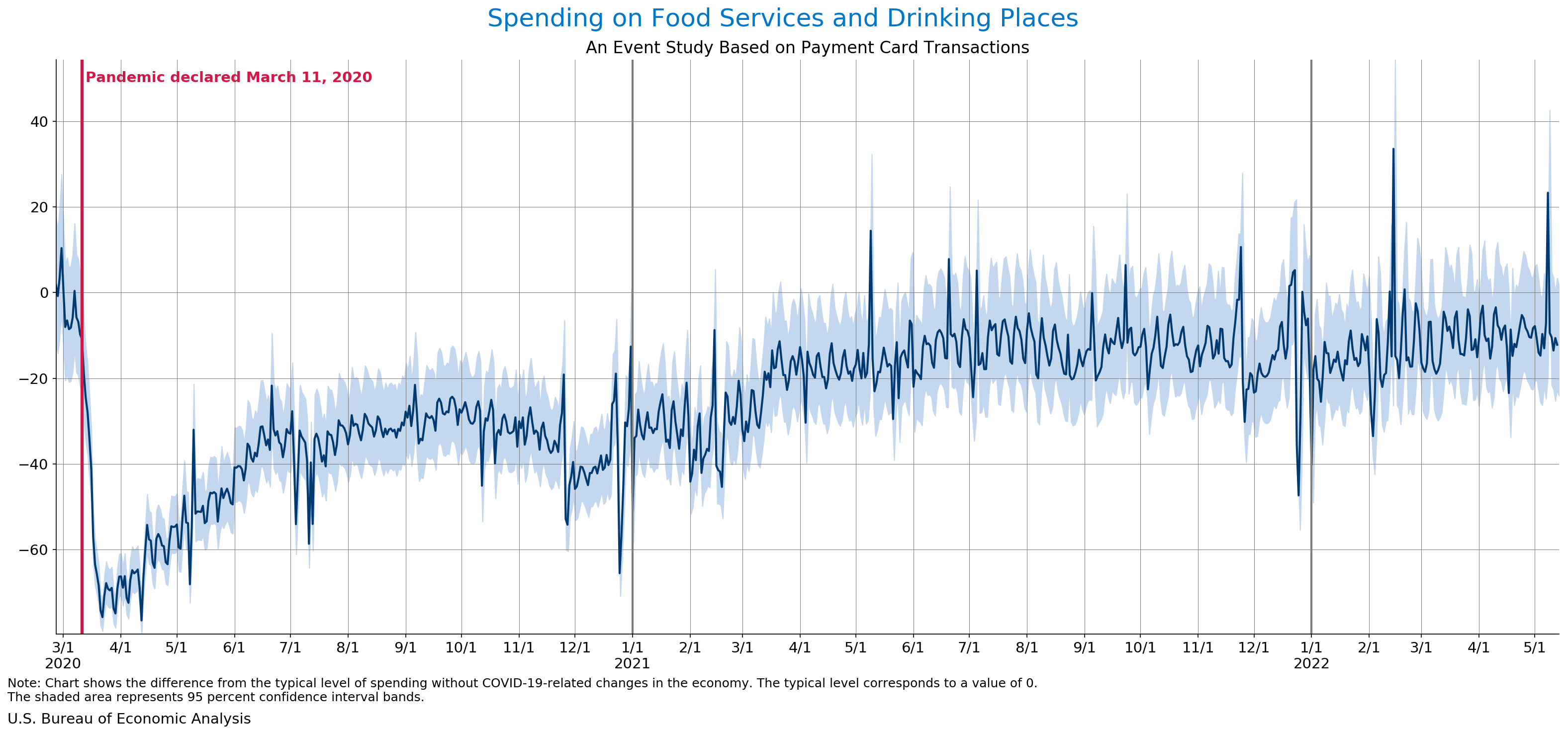 May 18, 2022 Daily Spending by Industry Spending on Food Services and Drinking Places Spending on Accommodation Spending at Clothing and Clothing Accessories Stores Spending on Gasoline Stations Spending on Food and Beverages Spending on Ambulatory Health Care Services Spending on Retail and Food Services (Excluding Nonstore Retailers) Data Weekly Event Study of Estimates Using Card Transactions XLSX Monthly Event Study of Estimates Using Card Transactions XLSX
