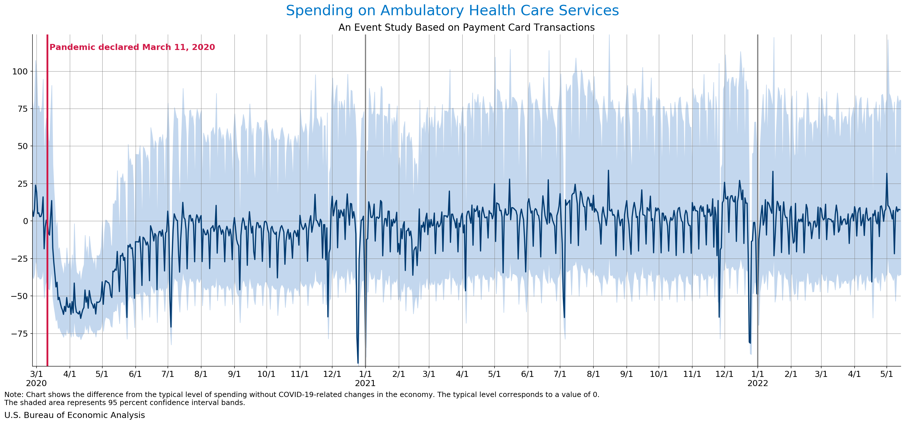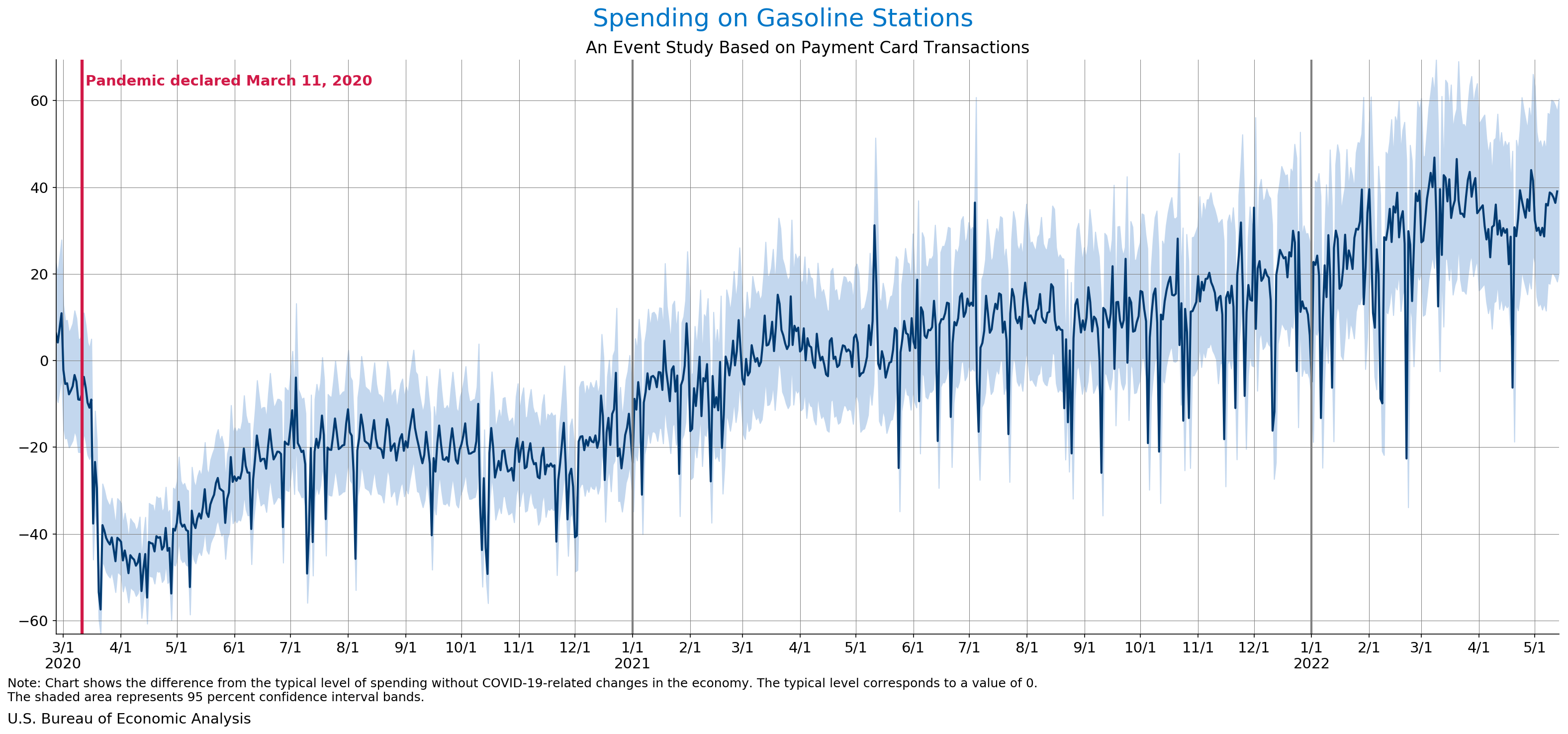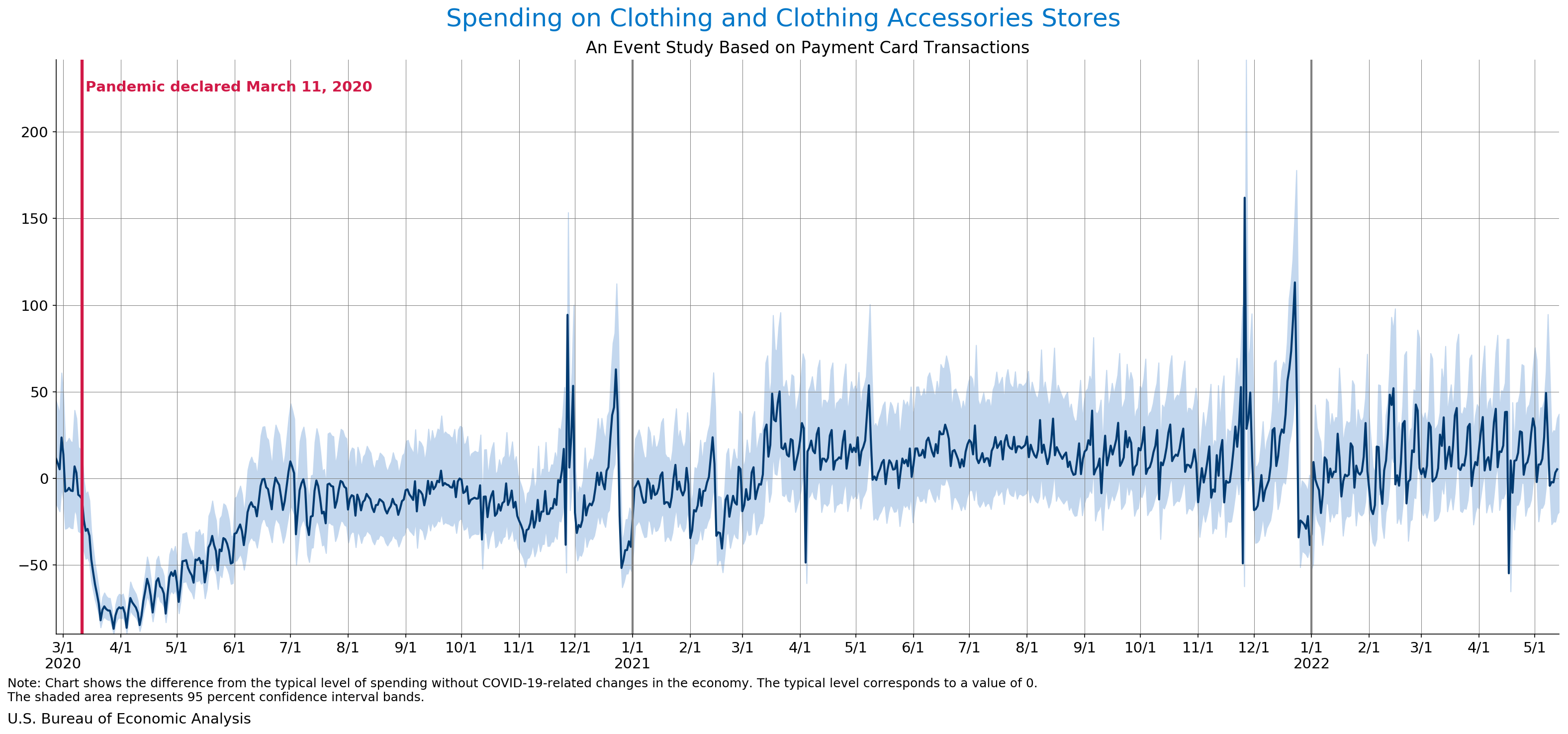 May 18, 2022 Daily Spending by Industry Spending on Food Services and Drinking Places Spending on Accommodation Spending at Clothing and Clothing Accessories Stores Spending on Gasoline Stations Spending on Food and Beverages Spending on Ambulatory Health Care Services Spending on Retail and Food Services (Excluding Nonstore Retailers) Data Weekly Event Study of Estimates Using Card Transactions XLSX Monthly Event Study of Estimates Using Card Transactions XLSX