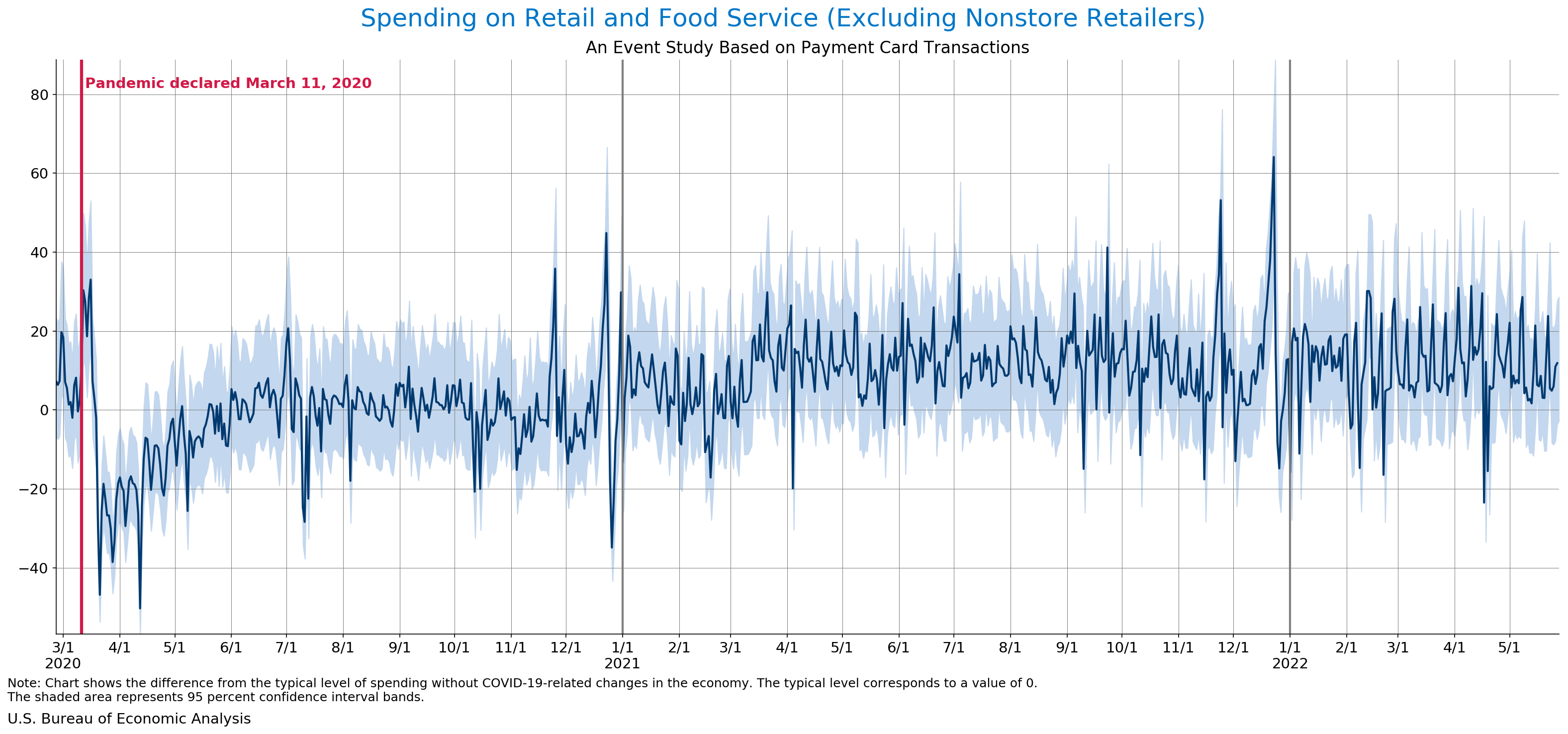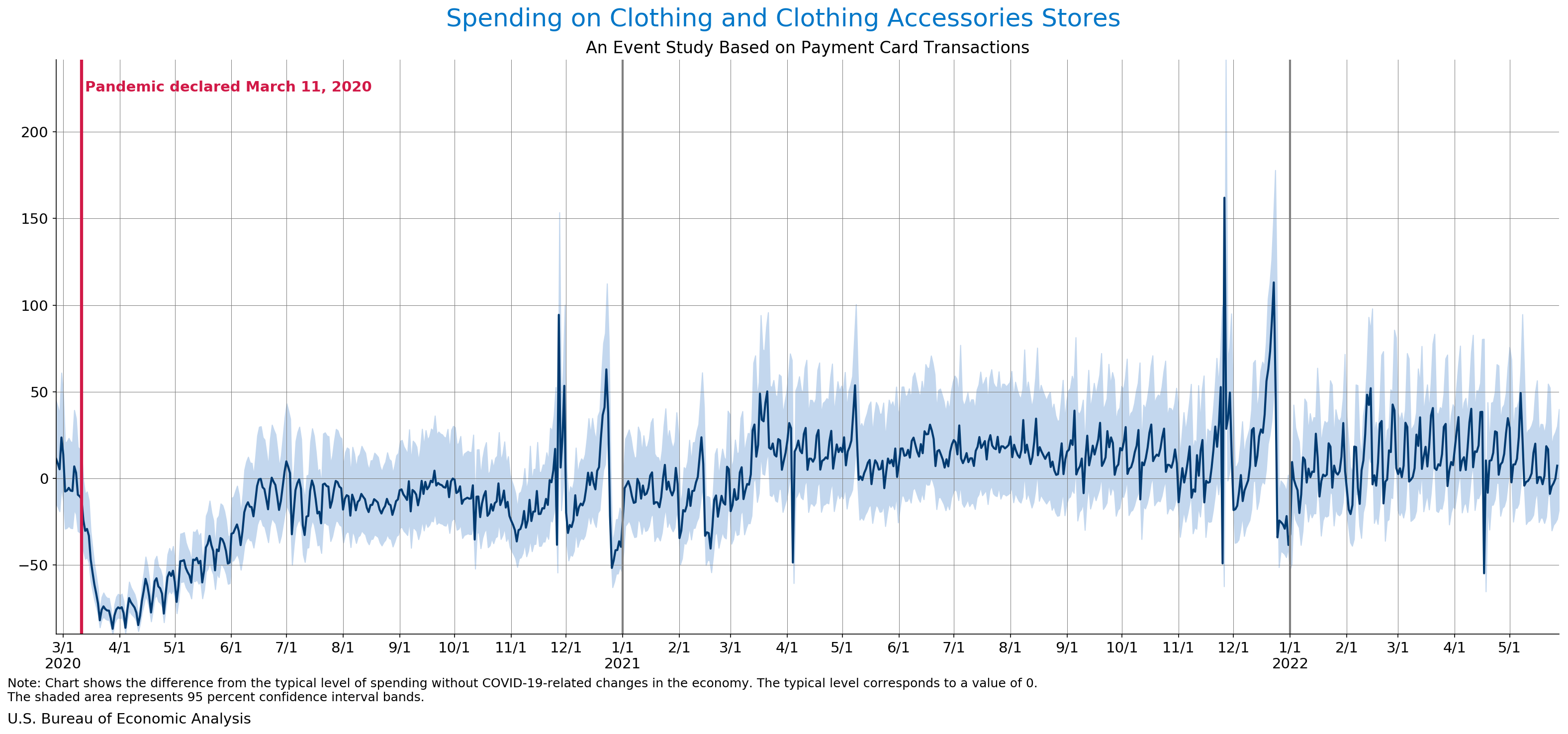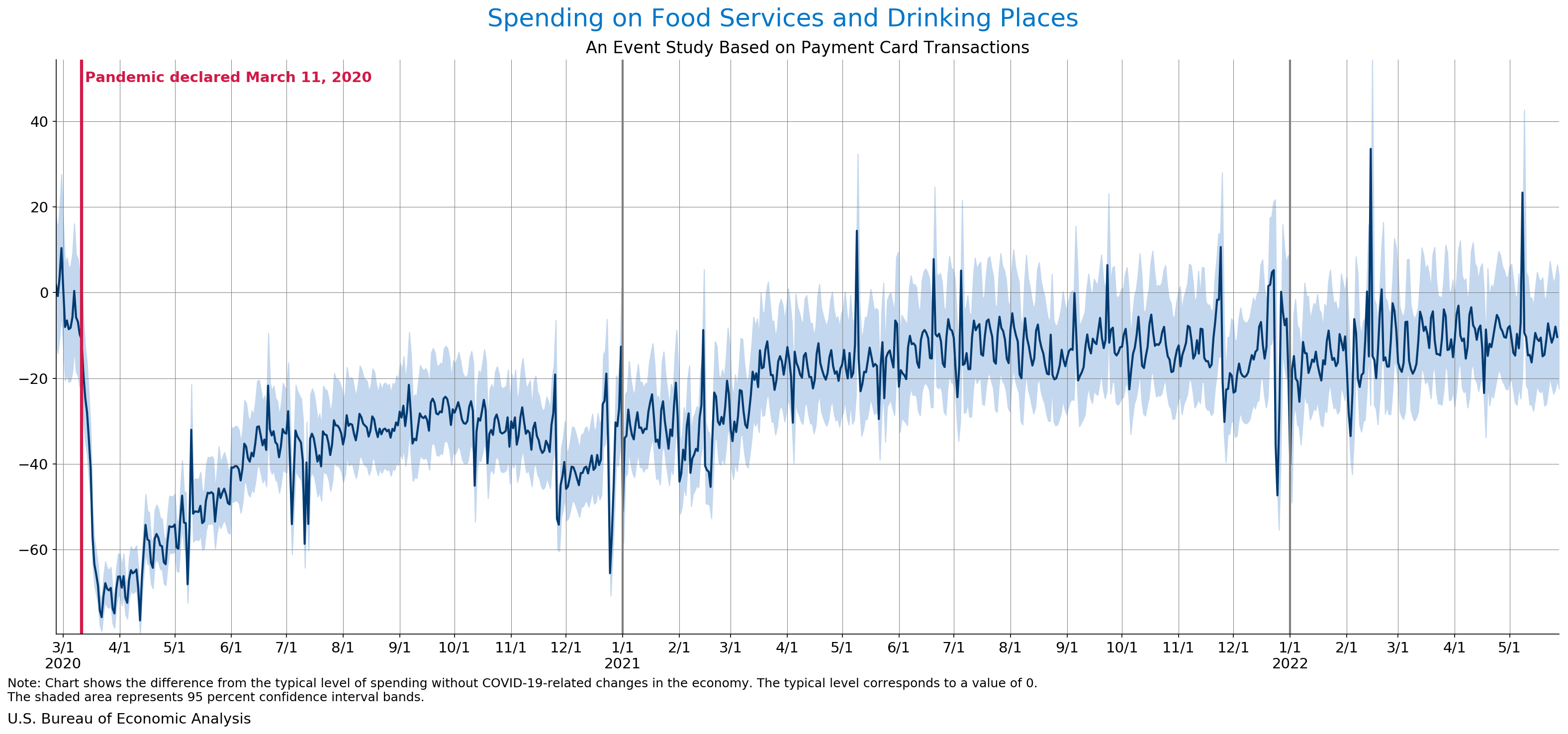 June 1, 2022 Daily Spending by Industry Spending on Food Services and Drinking Places Spending on Accommodation Spending at Clothing and Clothing Accessories Stores Spending on Gasoline Stations Spending on Food and Beverages Spending on Ambulatory Health Care Services Spending on Retail and Food Services (Excluding Nonstore Retailers) Data Weekly Event Study of Estimates Using Card Transactions XLSX Monthly Event Study of Estimates Using Card Transactions XLSX