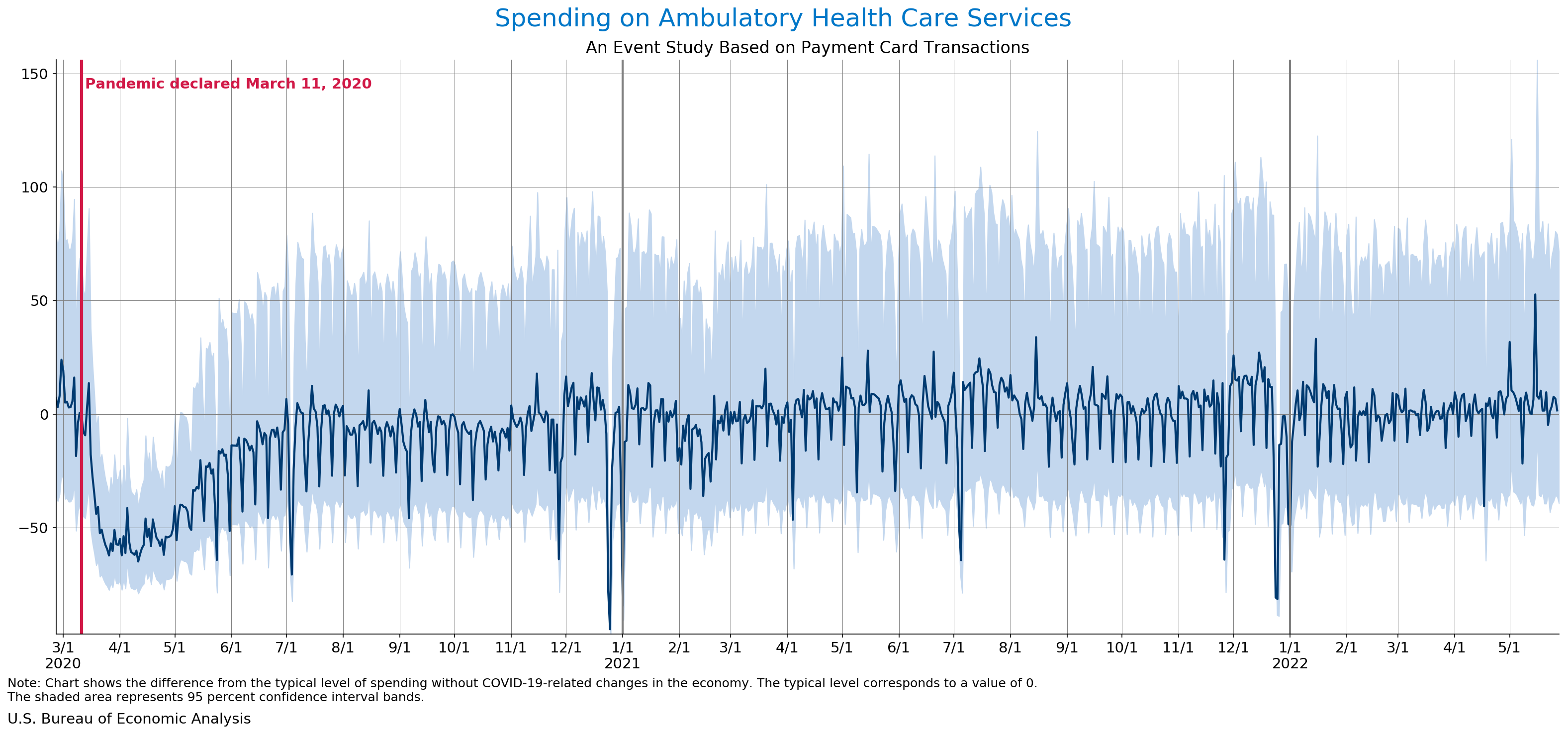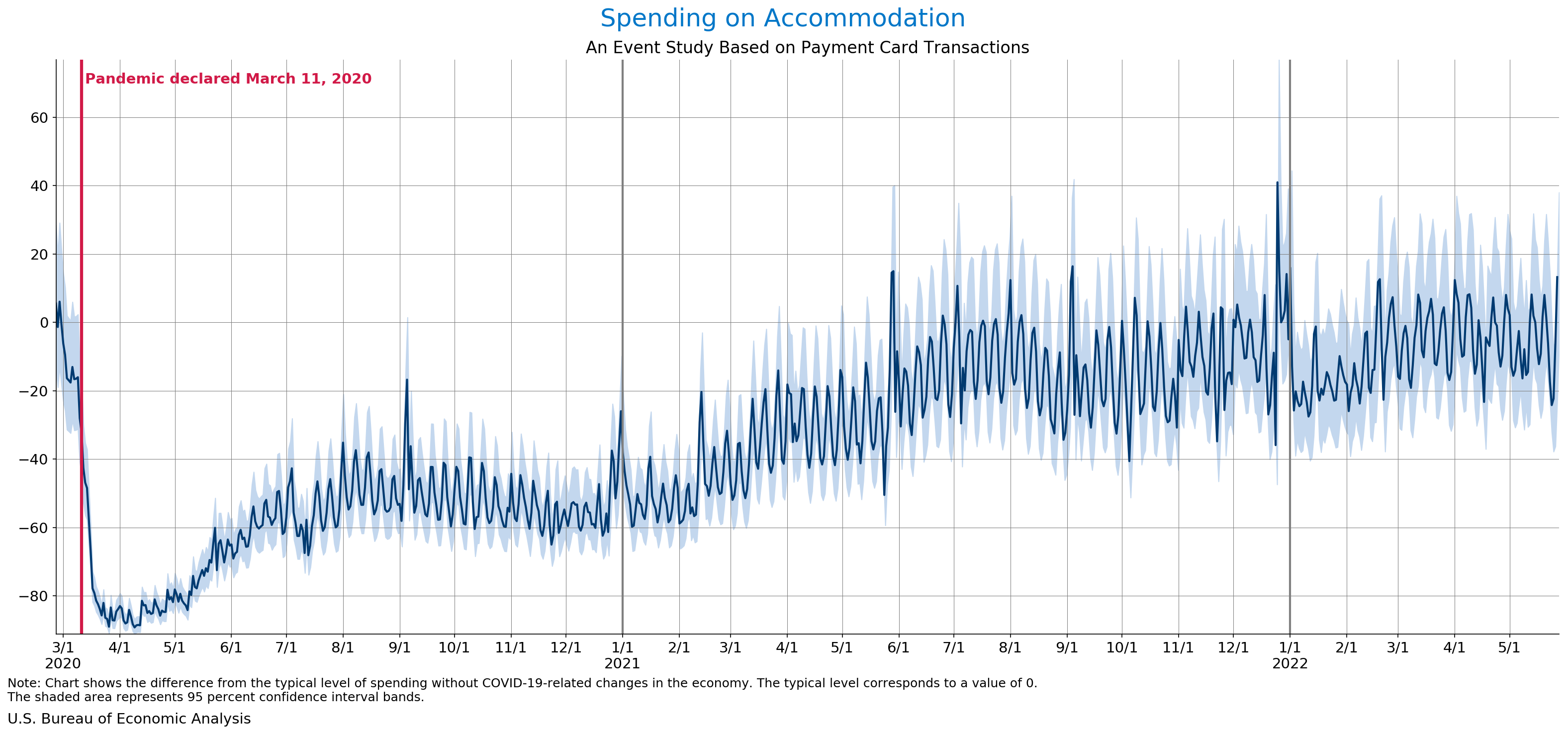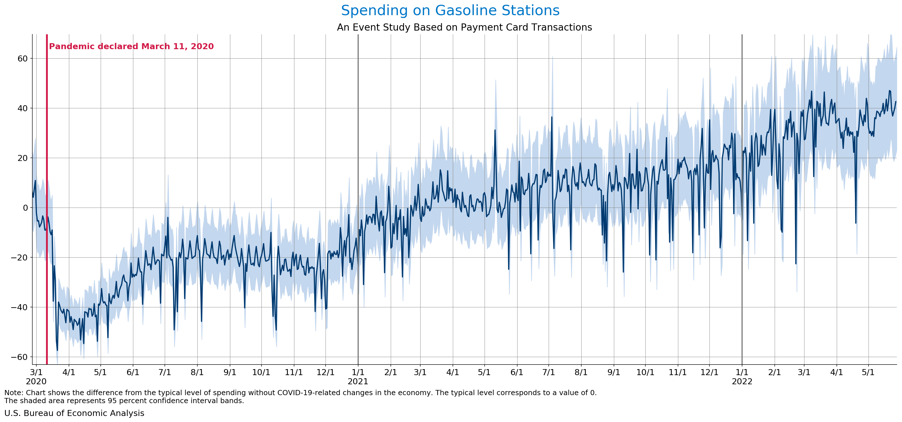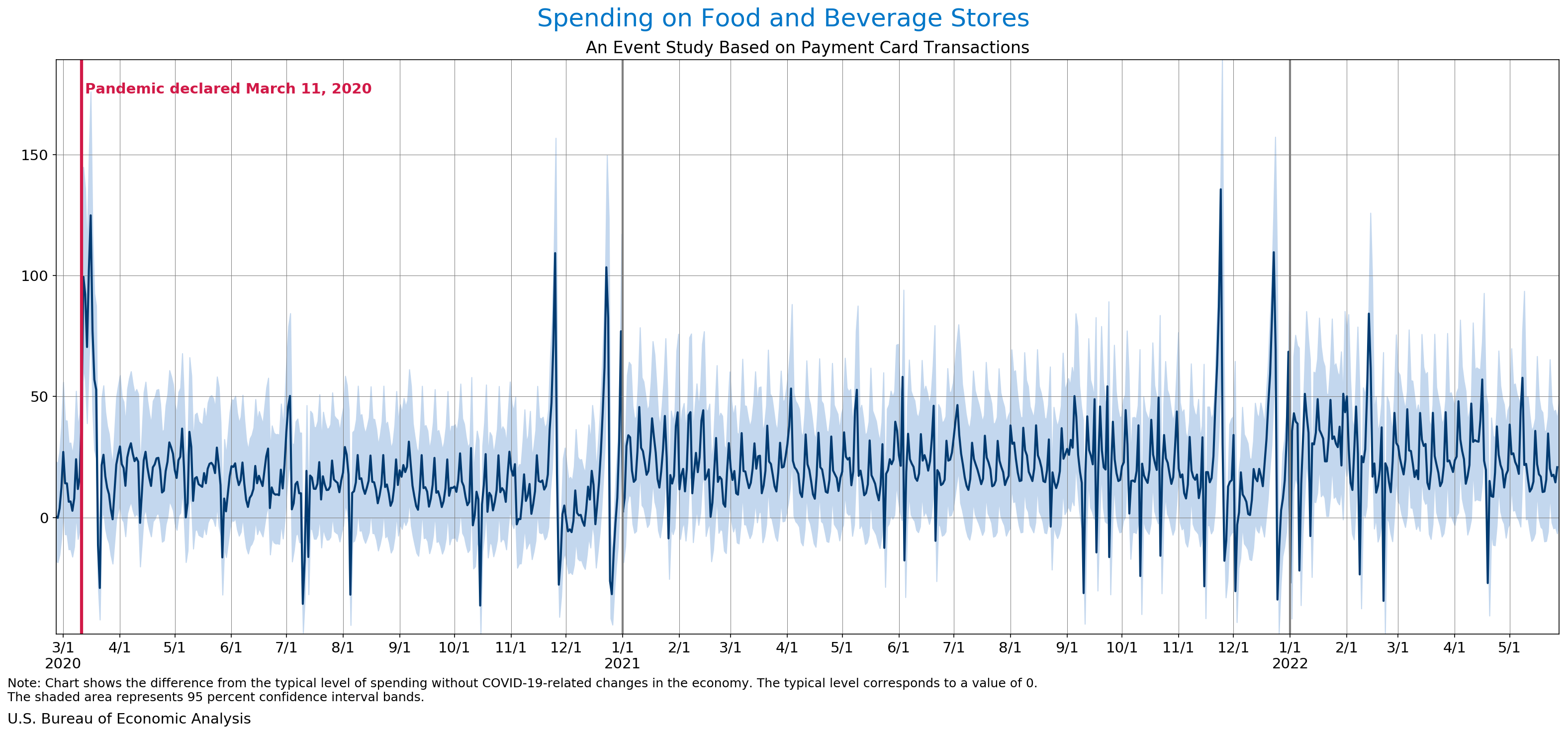 June 1, 2022 Daily Spending by Industry Spending on Food Services and Drinking Places Spending on Accommodation Spending at Clothing and Clothing Accessories Stores Spending on Gasoline Stations Spending on Food and Beverages Spending on Ambulatory Health Care Services Spending on Retail and Food Services (Excluding Nonstore Retailers) Data Weekly Event Study of Estimates Using Card Transactions XLSX Monthly Event Study of Estimates Using Card Transactions XLSX
