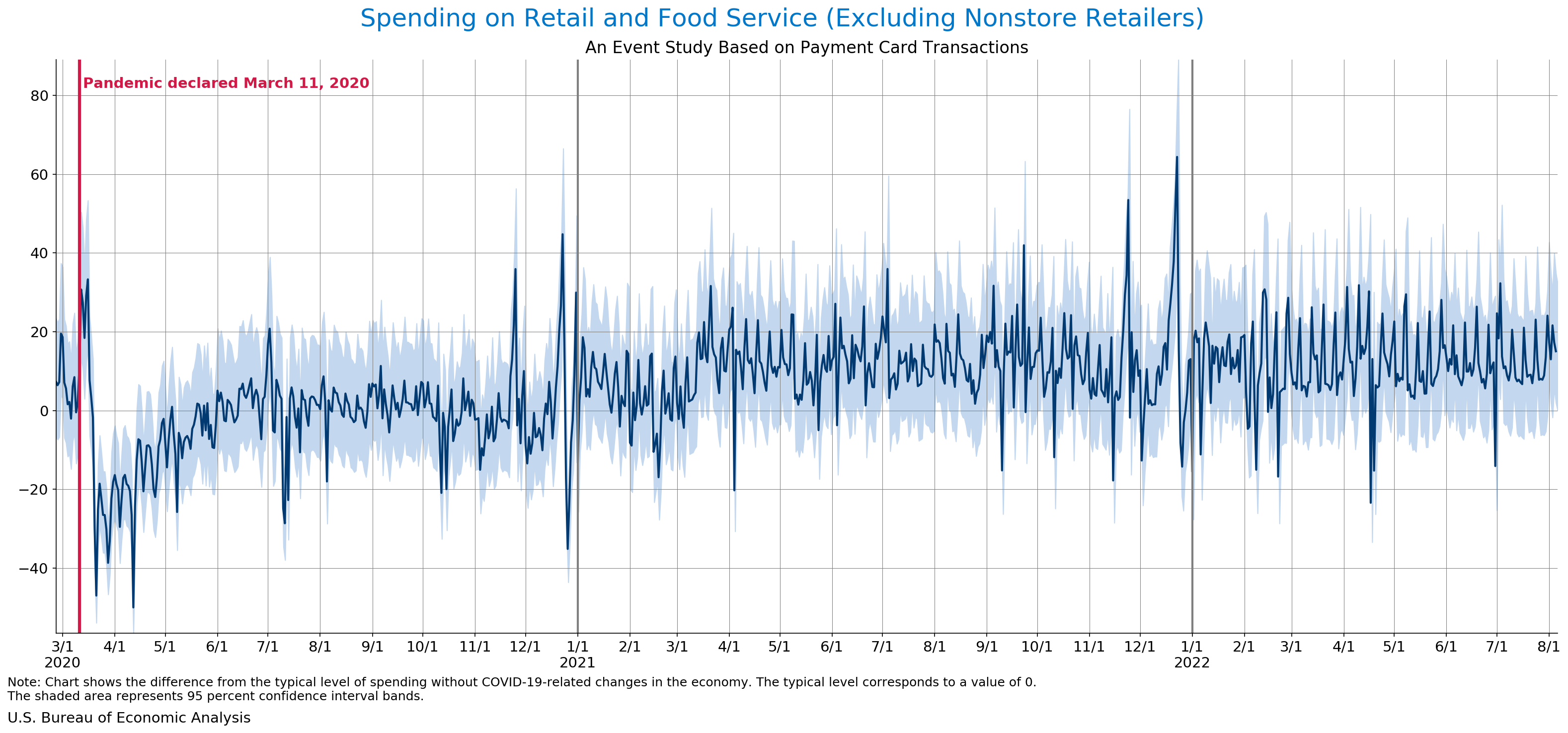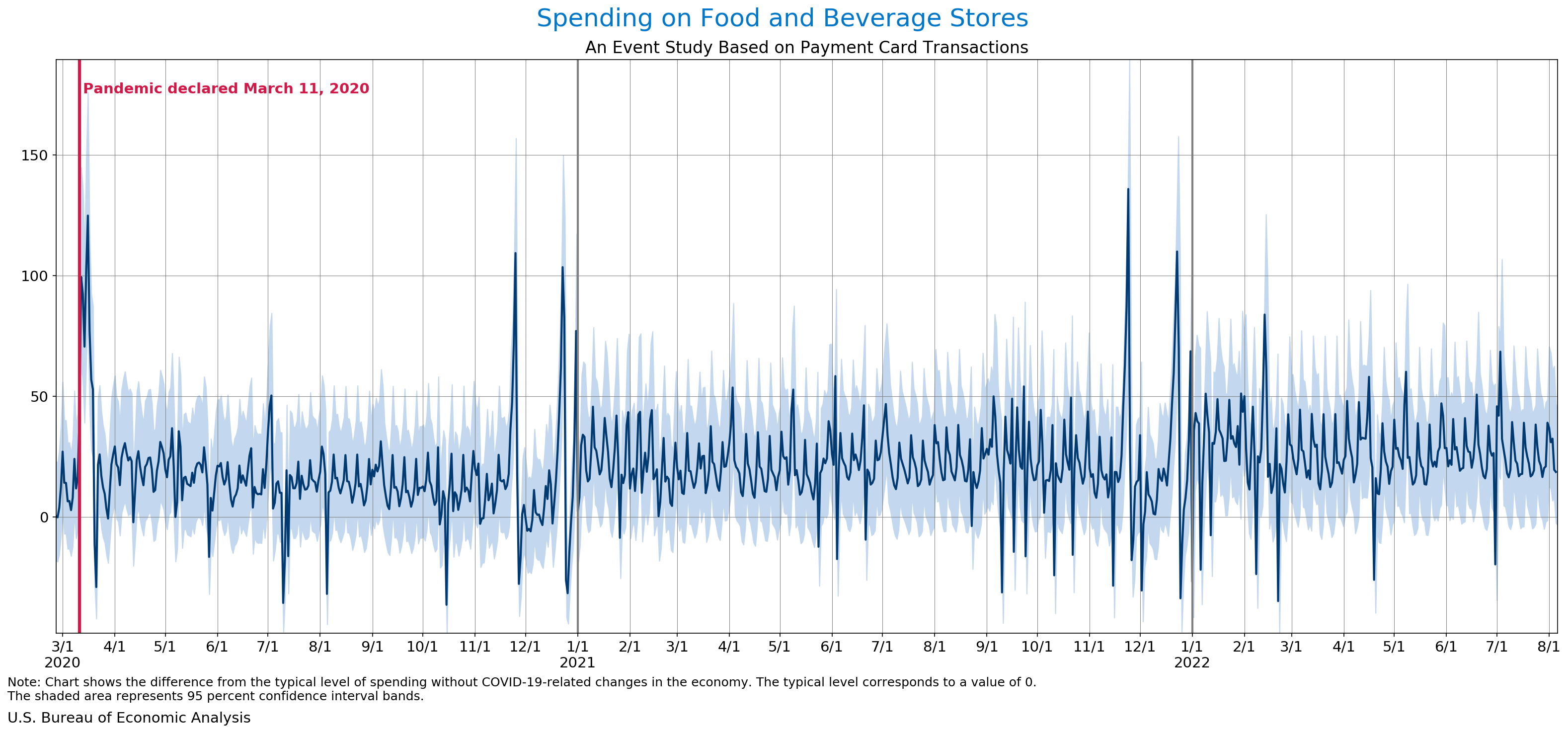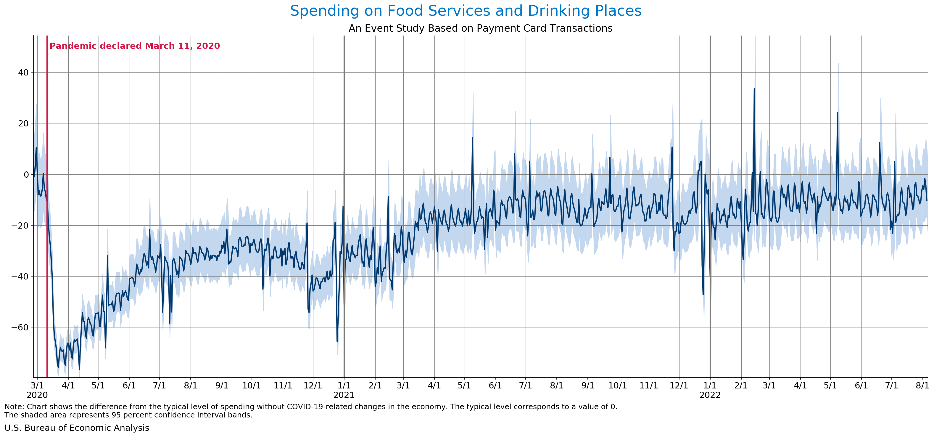 August 10, 2022 Daily Spending by Industry Spending on Food Services and Drinking Places Spending on Accommodation Spending at Clothing and Clothing Accessories Stores Spending on Gasoline Stations Spending on Food and Beverages Spending on Ambulatory Health Care Services Spending on Retail and Food Services (Excluding Nonstore Retailers) Data Weekly Event Study of Estimates Using Card Transactions XLSX Monthly Event Study of Estimates Using Card Transactions XLSX