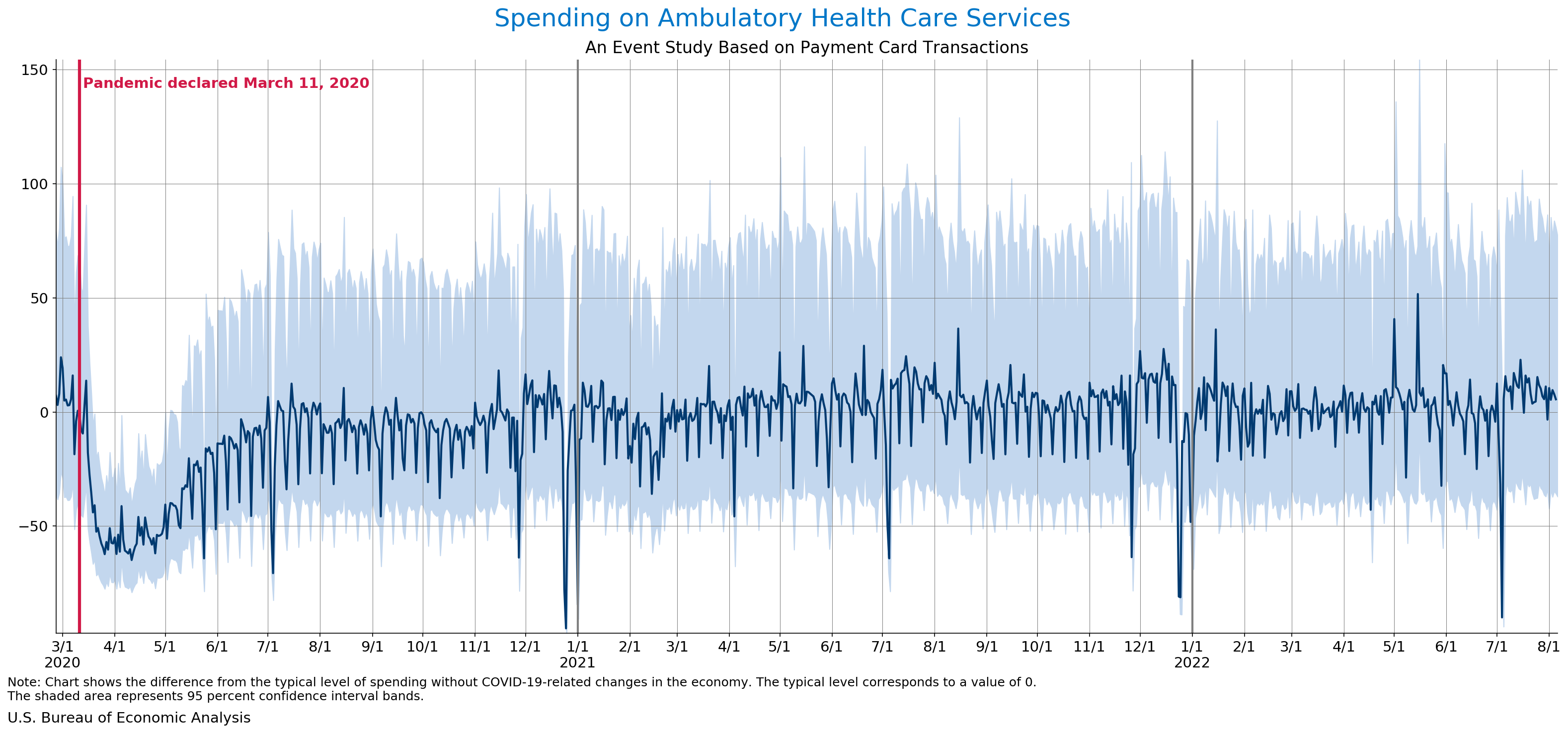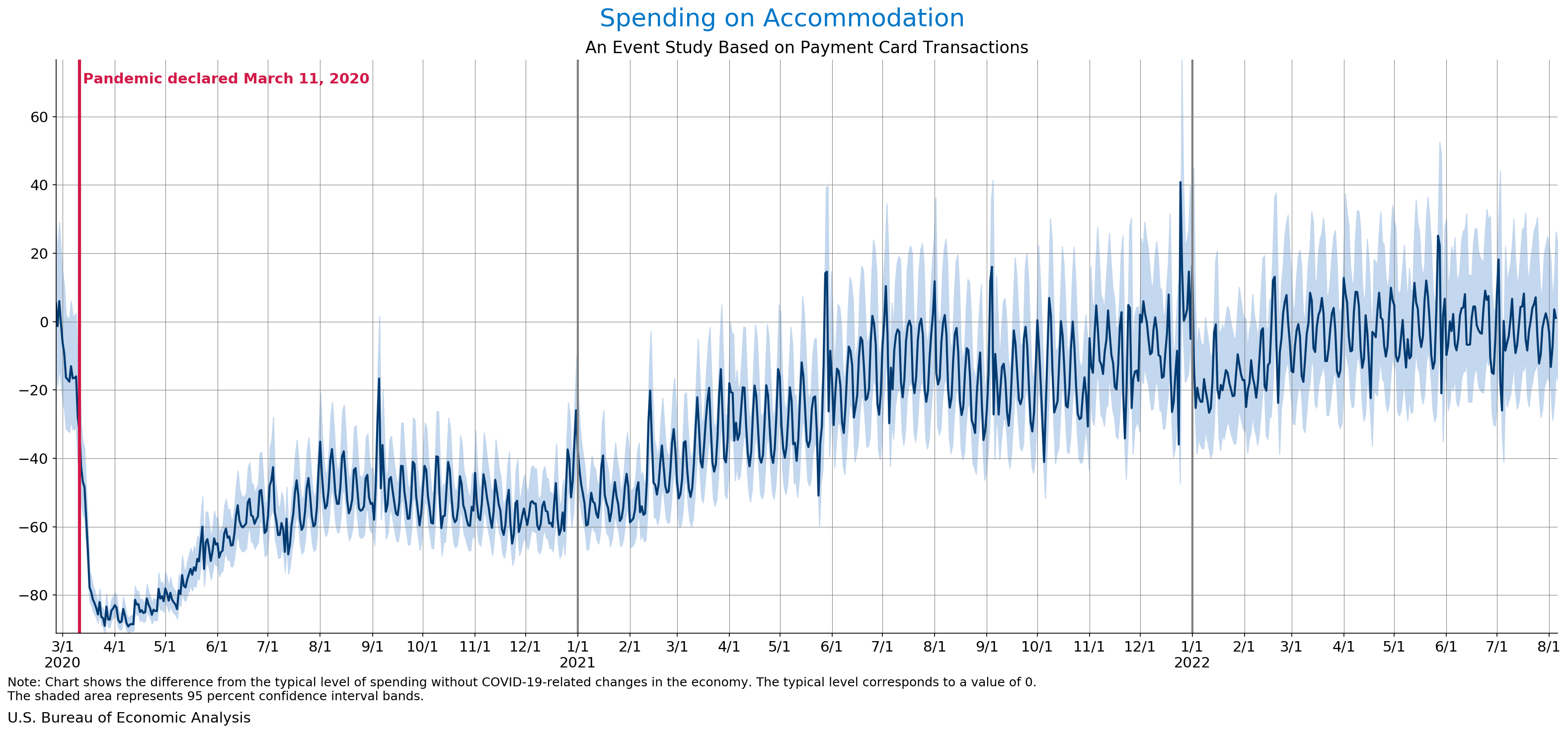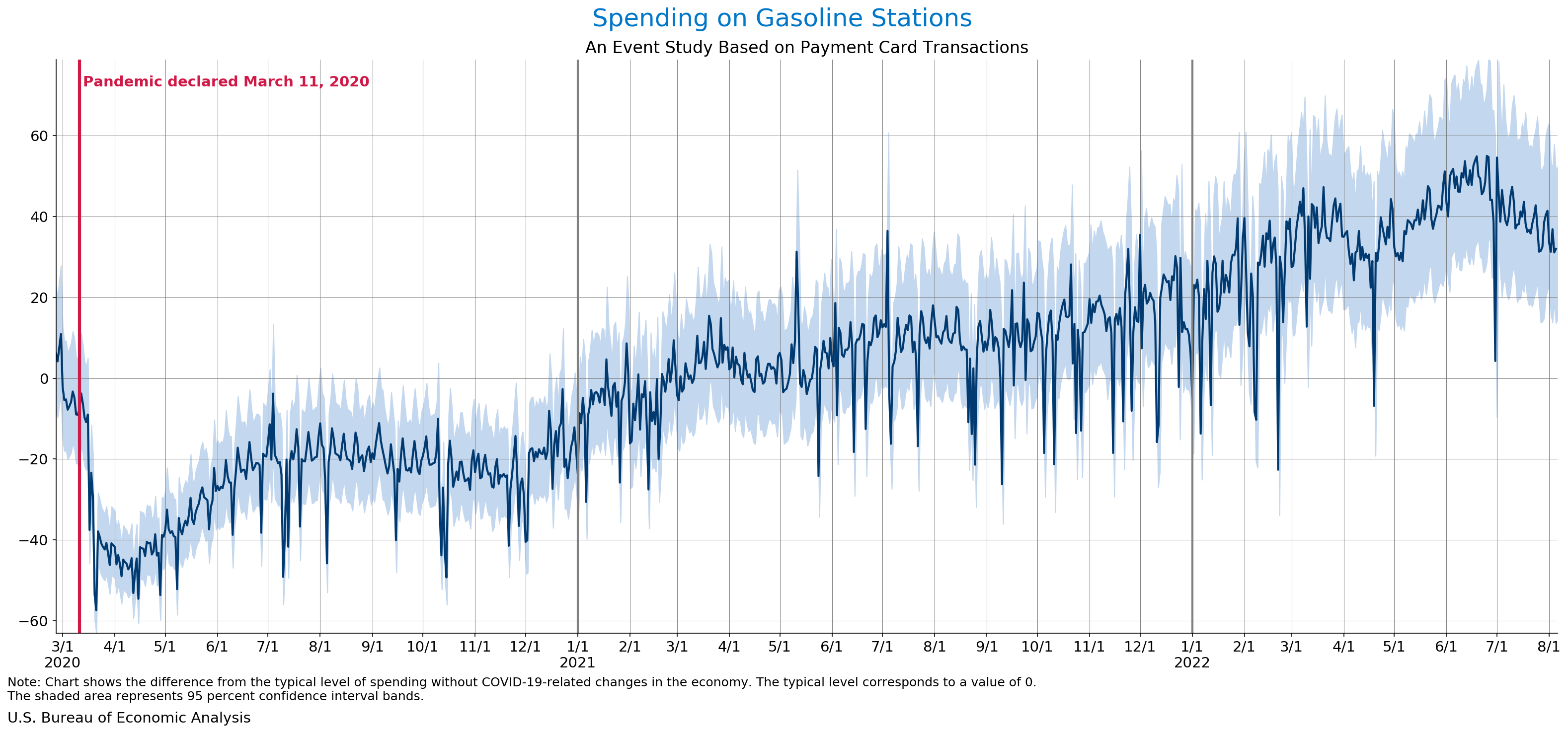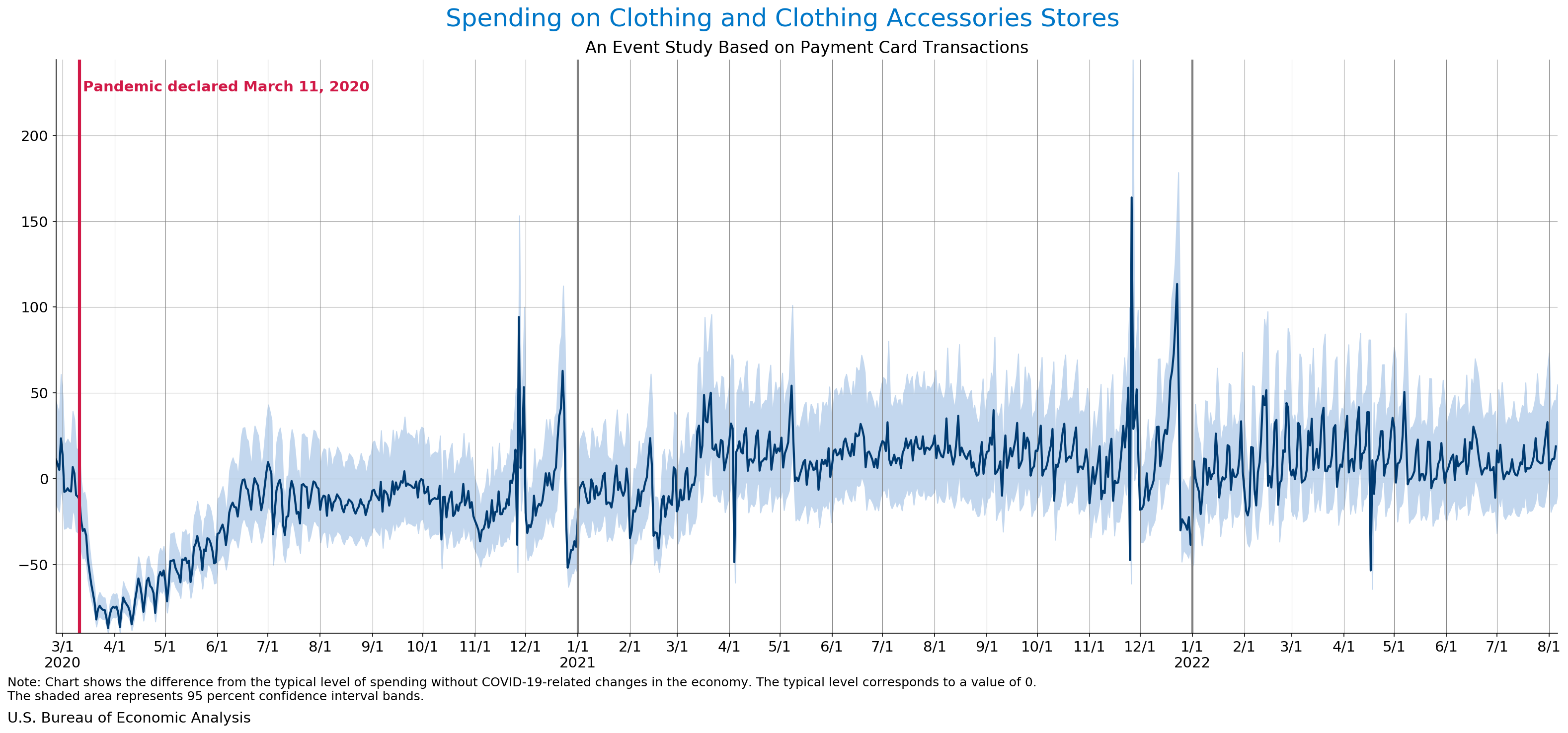 August 10, 2022 Daily Spending by Industry Spending on Food Services and Drinking Places Spending on Accommodation Spending at Clothing and Clothing Accessories Stores Spending on Gasoline Stations Spending on Food and Beverages Spending on Ambulatory Health Care Services Spending on Retail and Food Services (Excluding Nonstore Retailers) Data Weekly Event Study of Estimates Using Card Transactions XLSX Monthly Event Study of Estimates Using Card Transactions XLSX