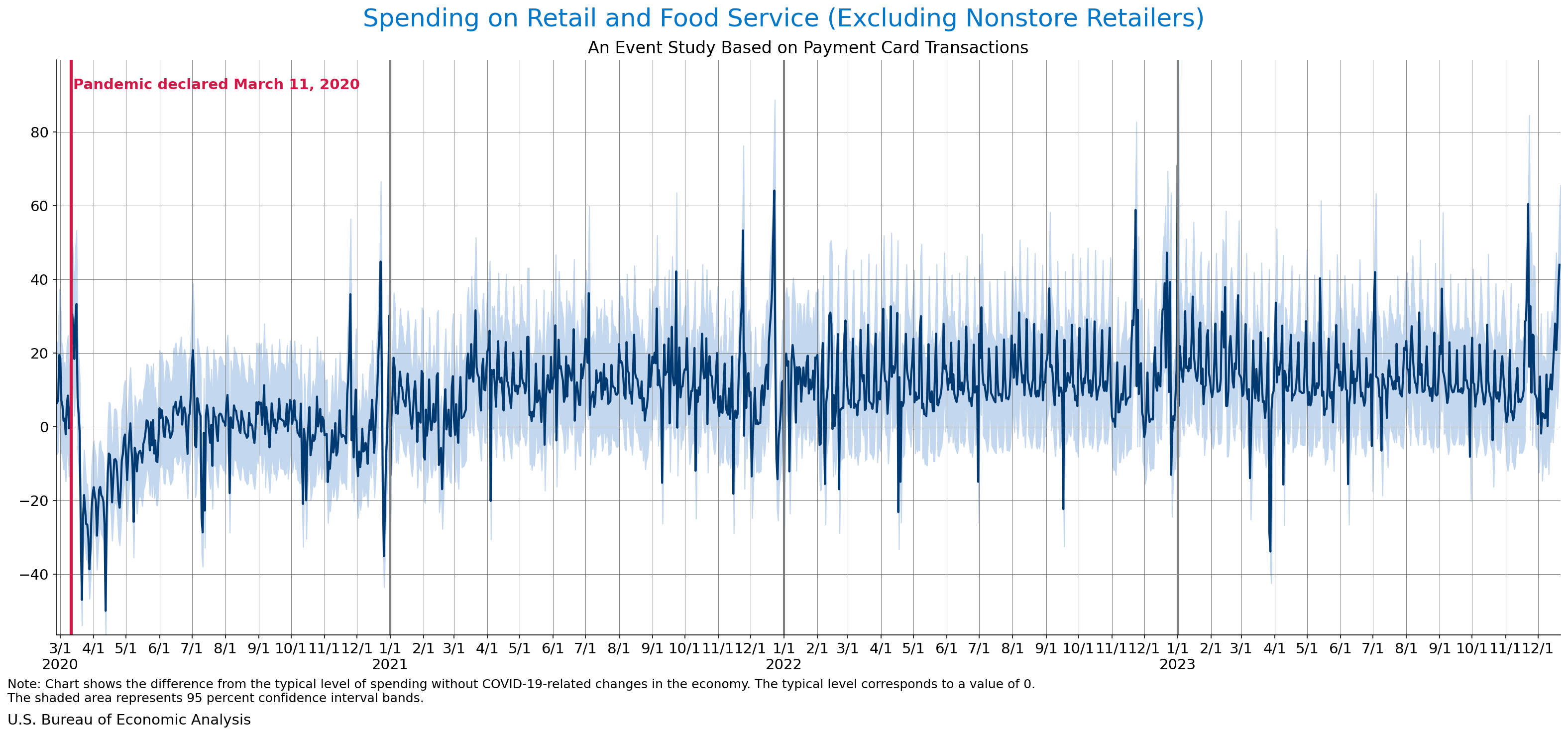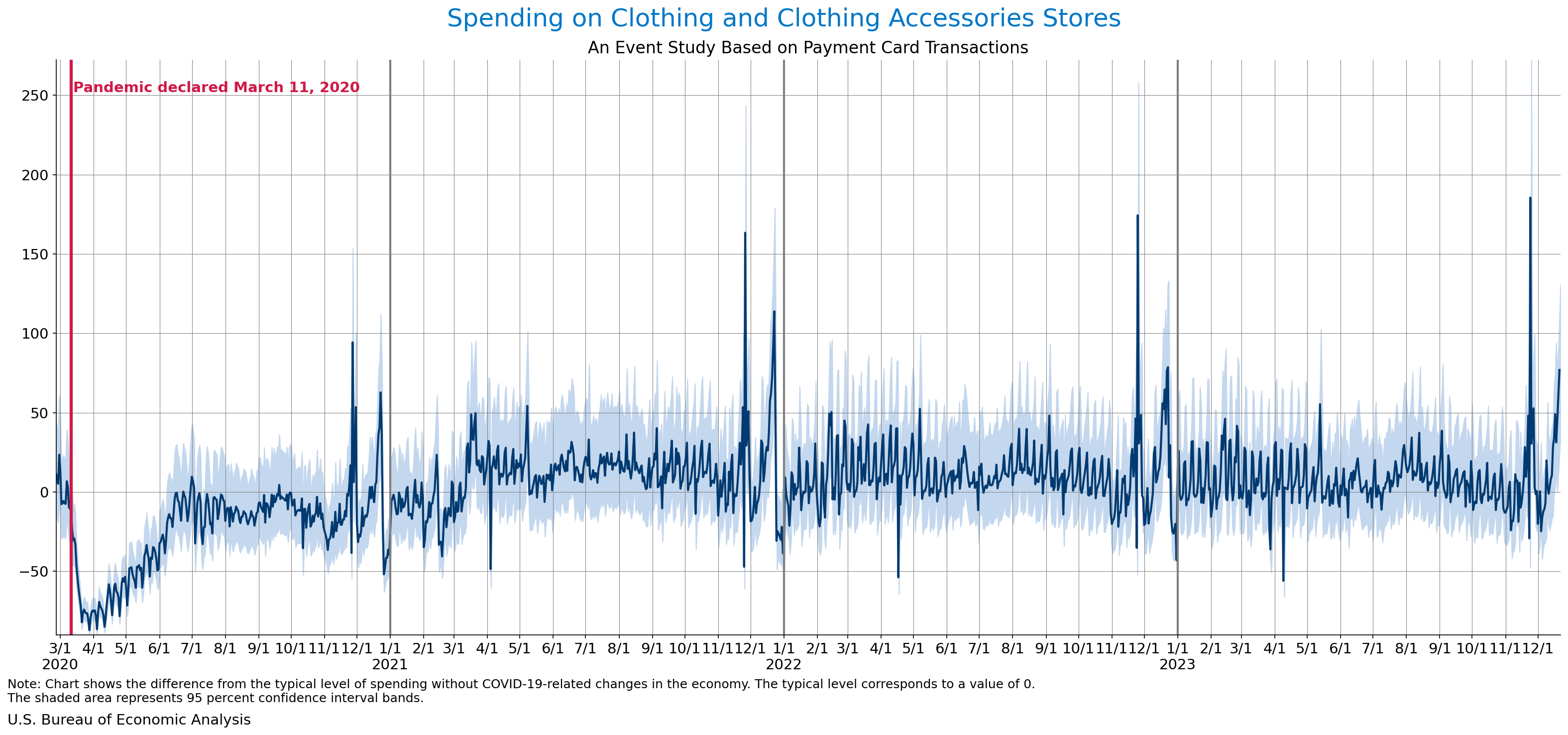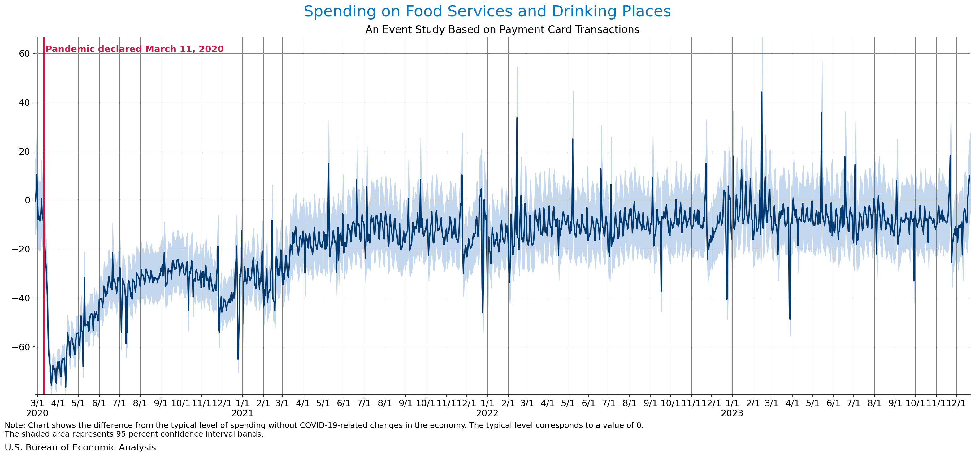 December 26, 2023 Daily Spending by Industry Spending on Food Services and Drinking Places Spending on Accommodation Spending at Clothing and Clothing Accessories Stores Spending on Gasoline Stations Spending on Food and Beverages Spending on Ambulatory Health Care Services Spending on Retail and Food Services (Excluding Nonstore Retailers) Data Weekly Event Study of Estimates Using Card Transactions XLSX Weekly Event Study of Spending Estimates Using Card Transactions CSV Monthly Event Study of Estimates Using Card Transactions XLSX