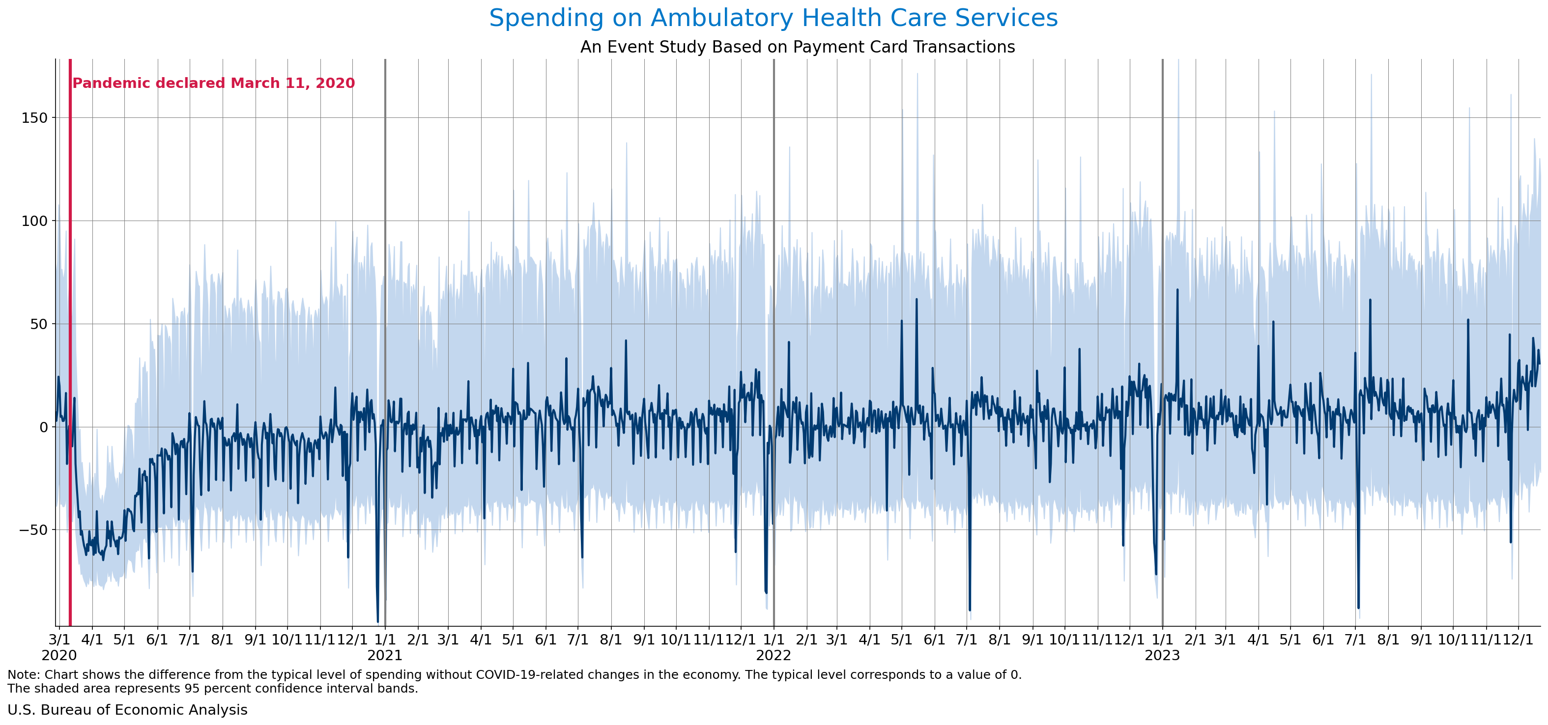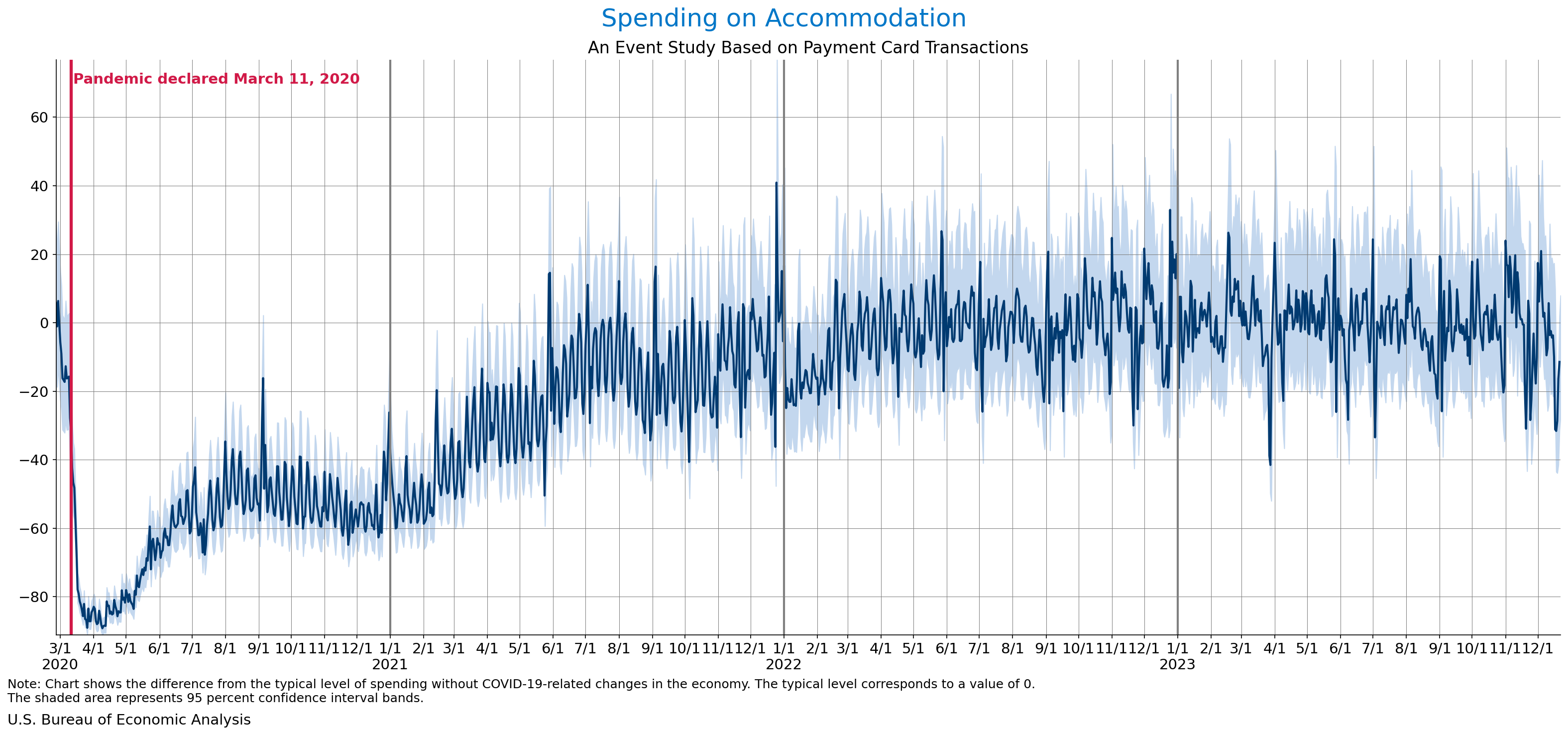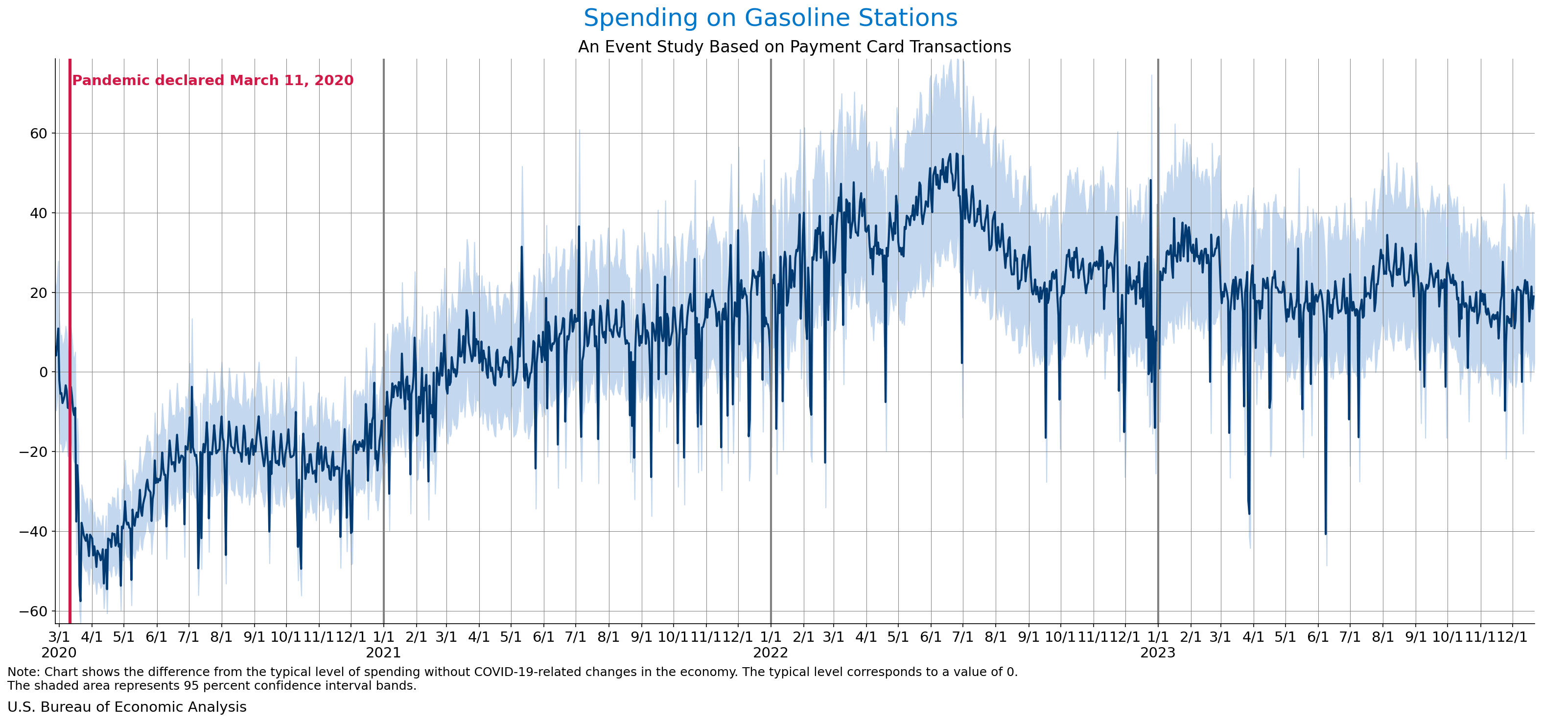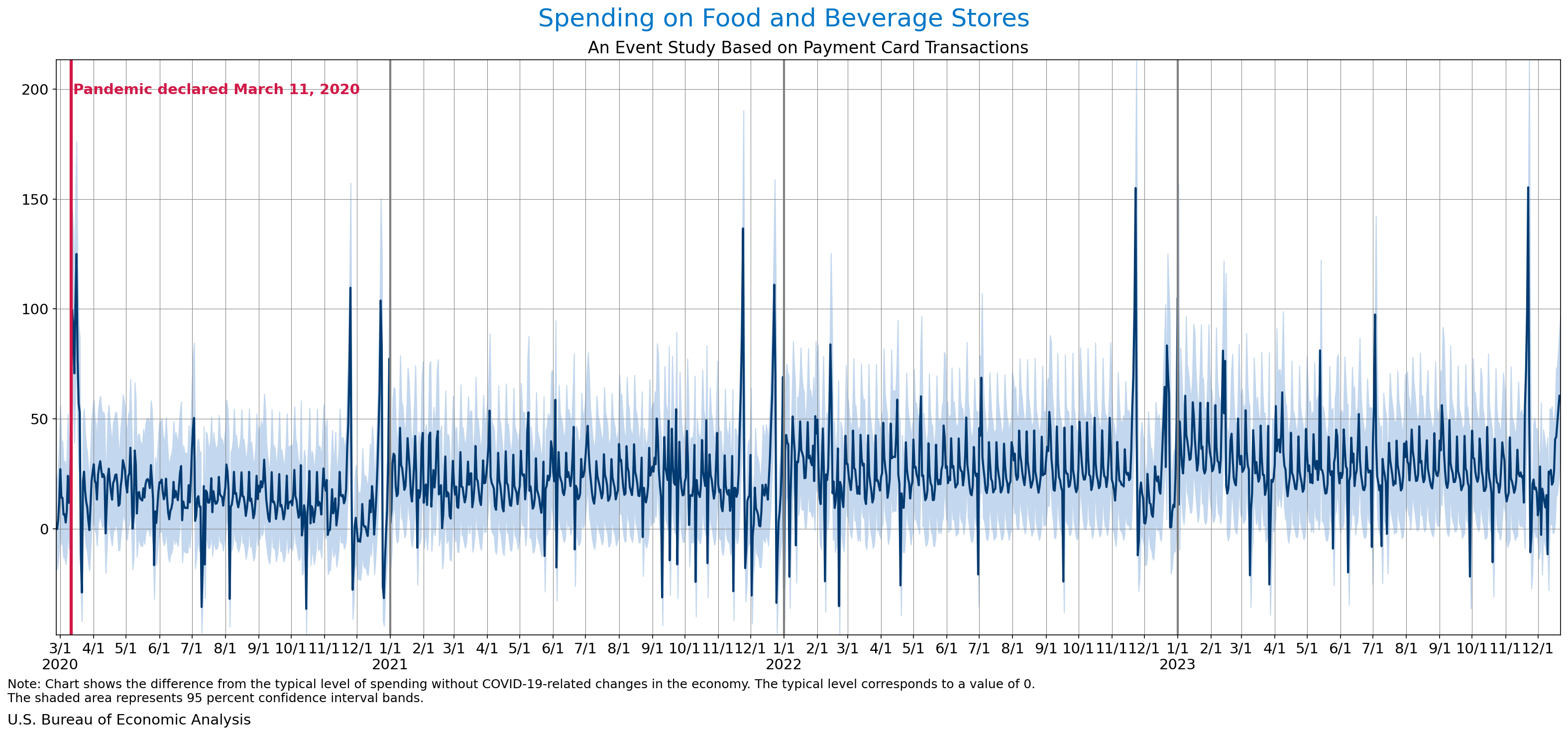 December 26, 2023 Daily Spending by Industry Spending on Food Services and Drinking Places Spending on Accommodation Spending at Clothing and Clothing Accessories Stores Spending on Gasoline Stations Spending on Food and Beverages Spending on Ambulatory Health Care Services Spending on Retail and Food Services (Excluding Nonstore Retailers) Data Weekly Event Study of Estimates Using Card Transactions XLSX Weekly Event Study of Spending Estimates Using Card Transactions CSV Monthly Event Study of Estimates Using Card Transactions XLSX