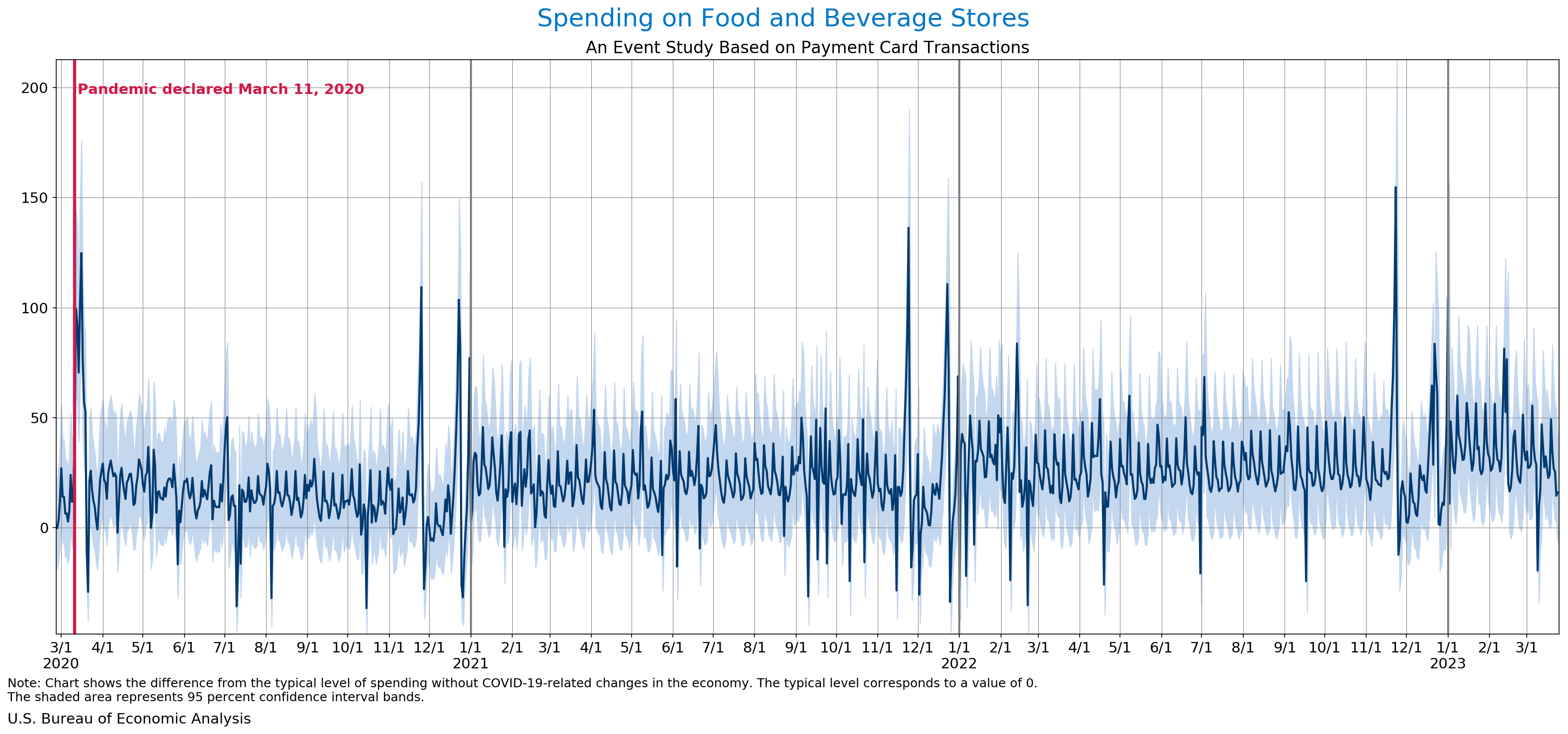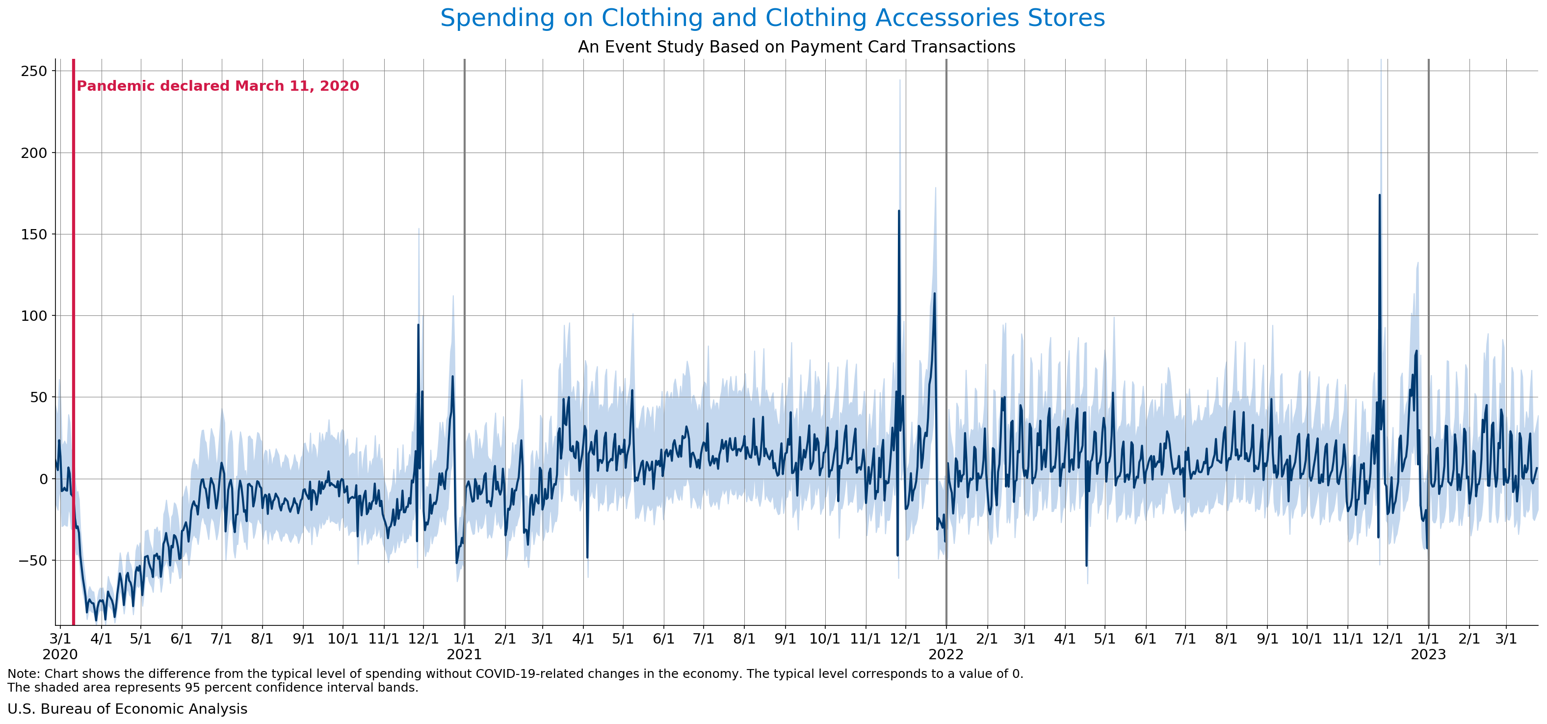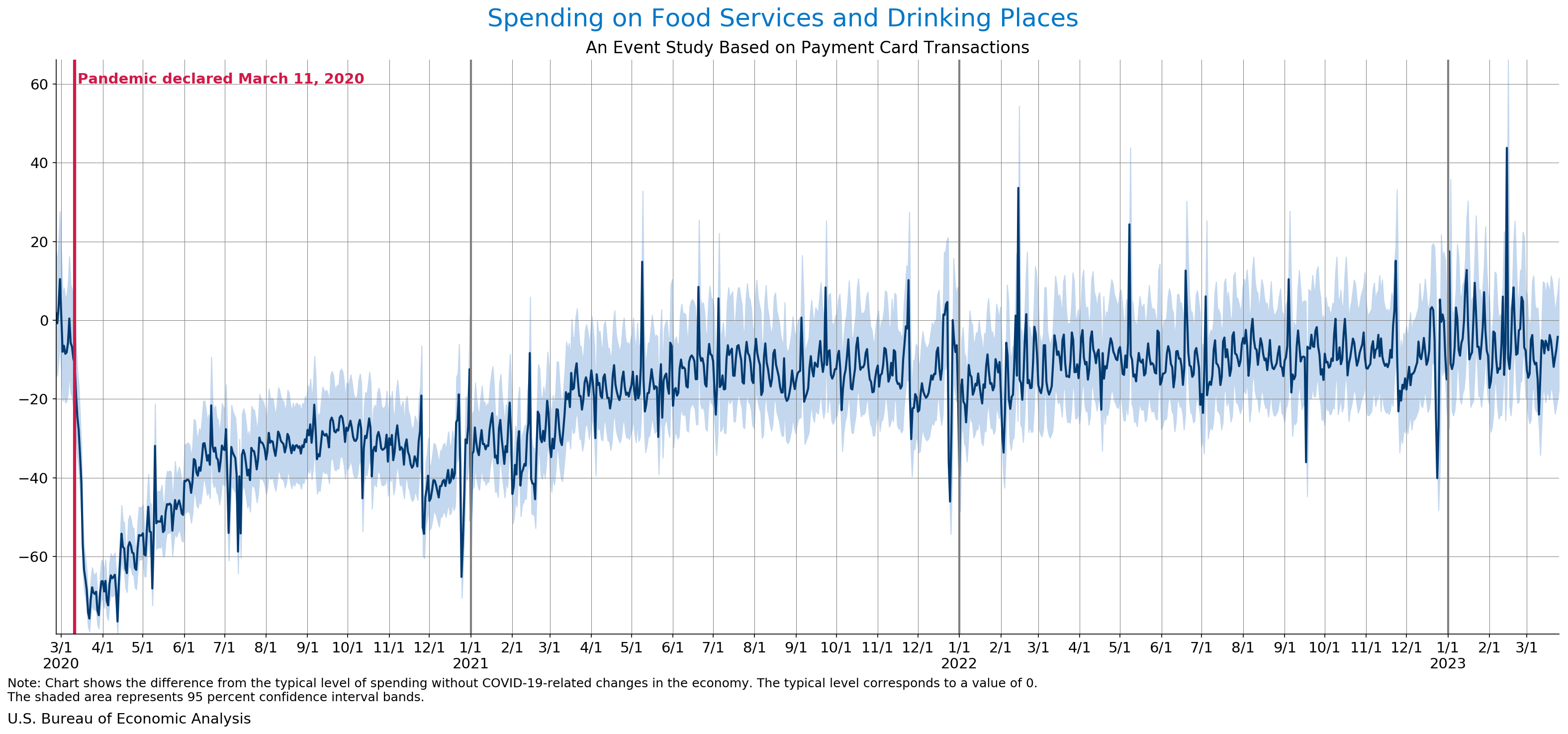 March 29, 2023 Daily Spending by Industry Spending on Food Services and Drinking Places Spending on Accommodation Spending at Clothing and Clothing Accessories Stores Spending on Gasoline Stations Spending on Food and Beverages Spending on Ambulatory Health Care Services Spending on Retail and Food Services (Excluding Nonstore Retailers) Data Weekly Event Study of Estimates Using Card Transactions XLSX Weekly Event Study of Spending Estimates Using Card Transactions CSV Monthly Event Study of Estimates Using Card Transactions XLSX