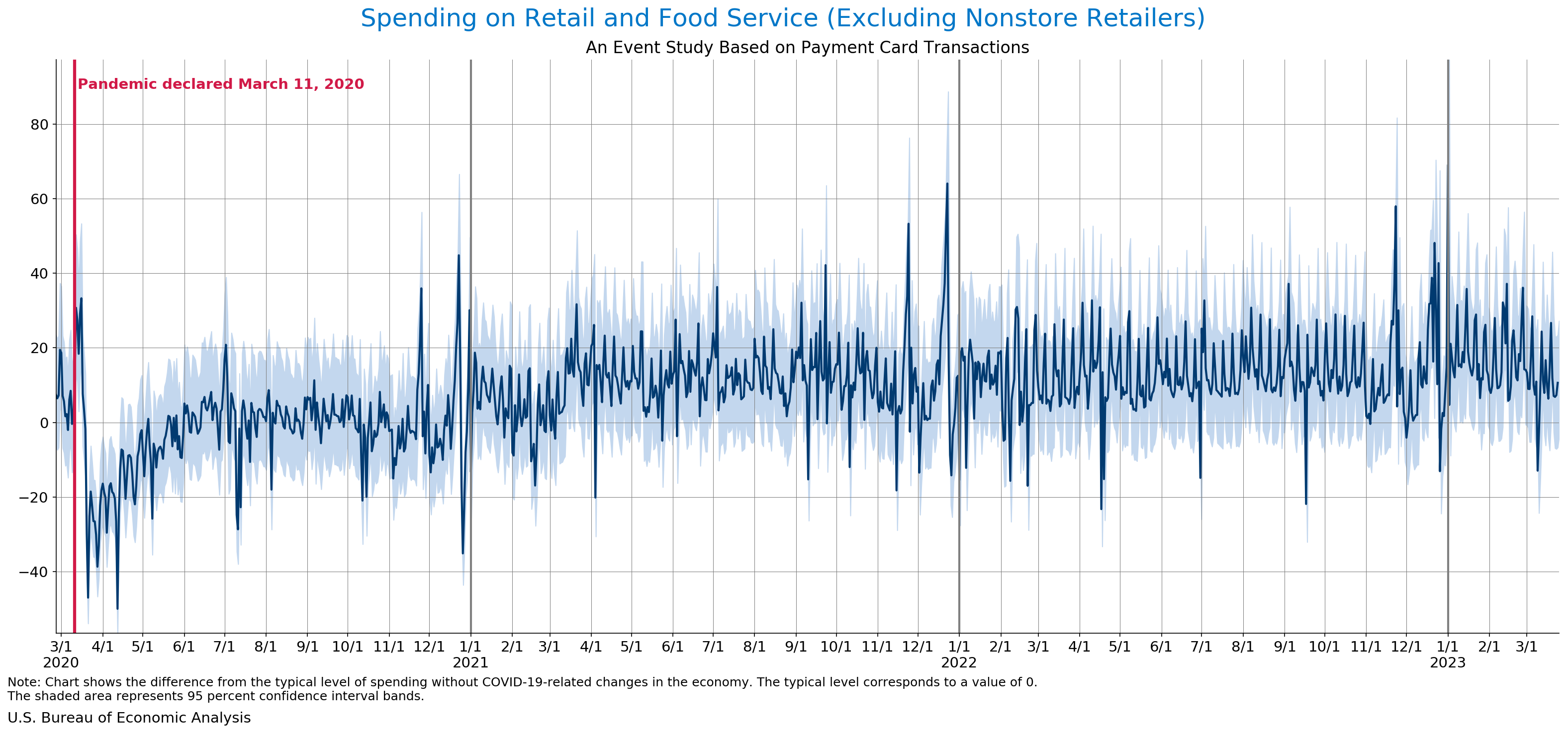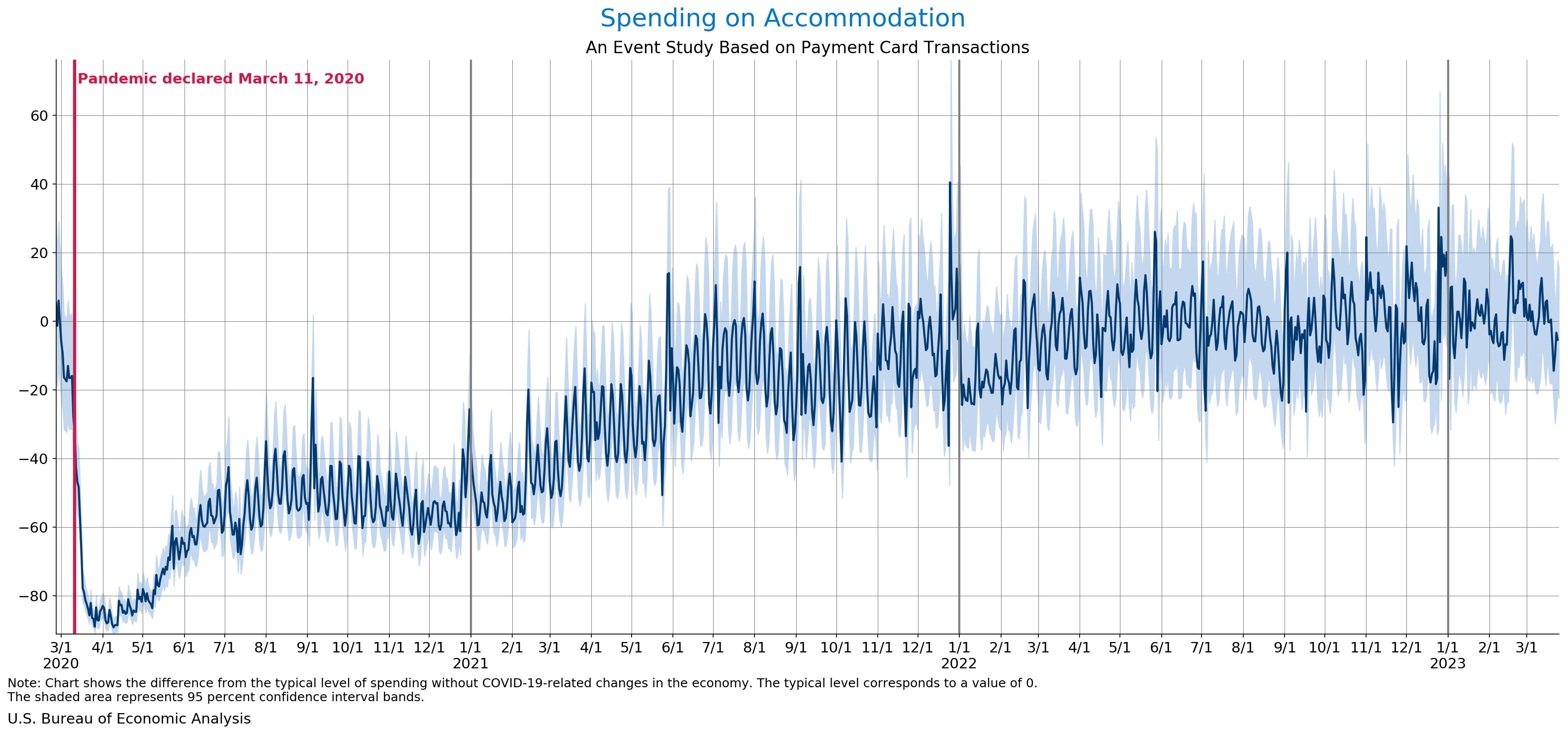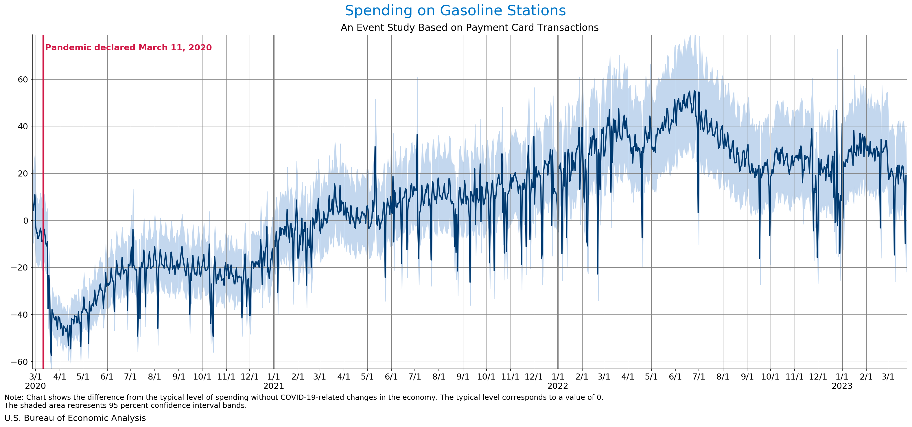 March 29, 2023 Daily Spending by Industry Spending on Food Services and Drinking Places Spending on Accommodation Spending at Clothing and Clothing Accessories Stores Spending on Gasoline Stations Spending on Food and Beverages Spending on Ambulatory Health Care Services Spending on Retail and Food Services (Excluding Nonstore Retailers) Data Weekly Event Study of Estimates Using Card Transactions XLSX Weekly Event Study of Spending Estimates Using Card Transactions CSV Monthly Event Study of Estimates Using Card Transactions XLSX