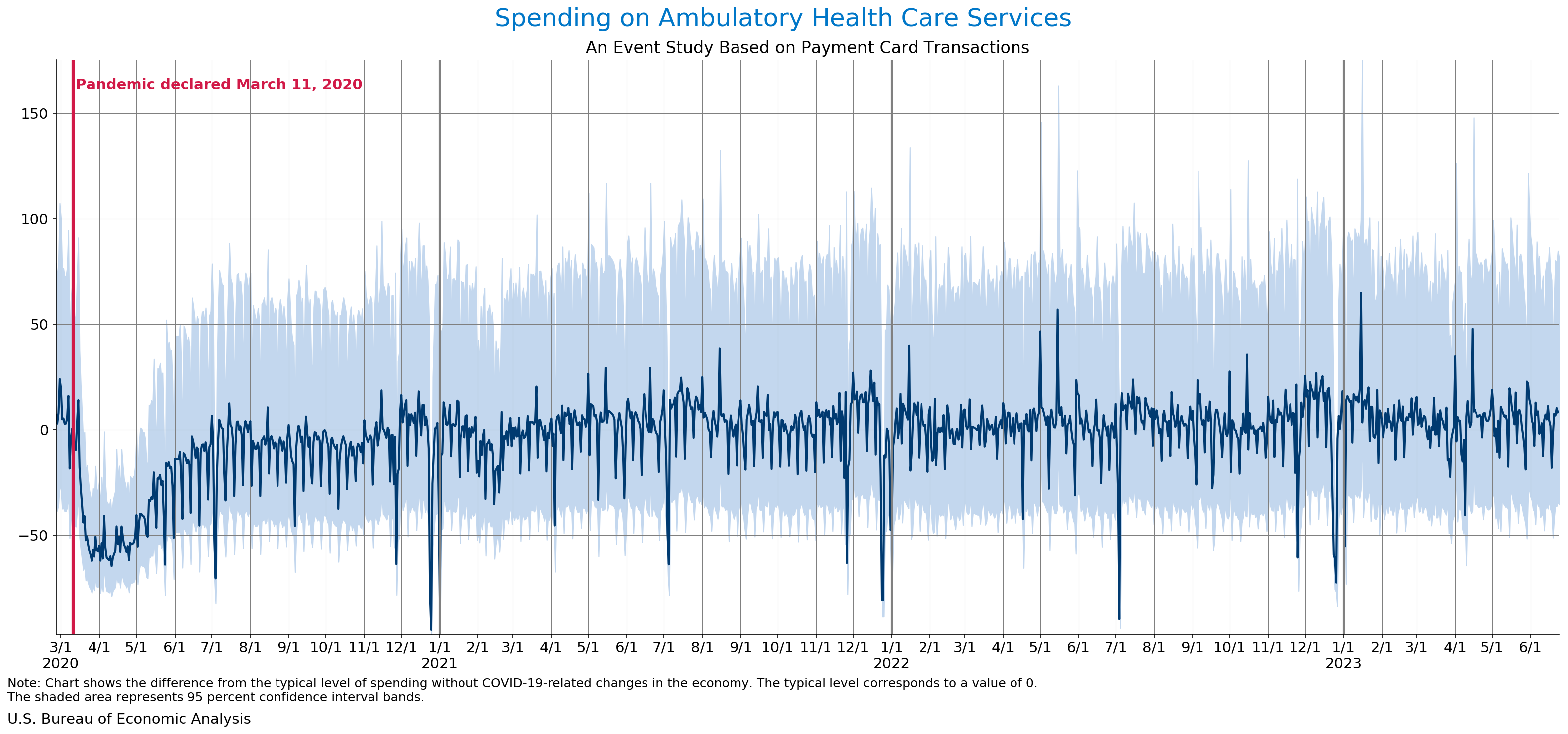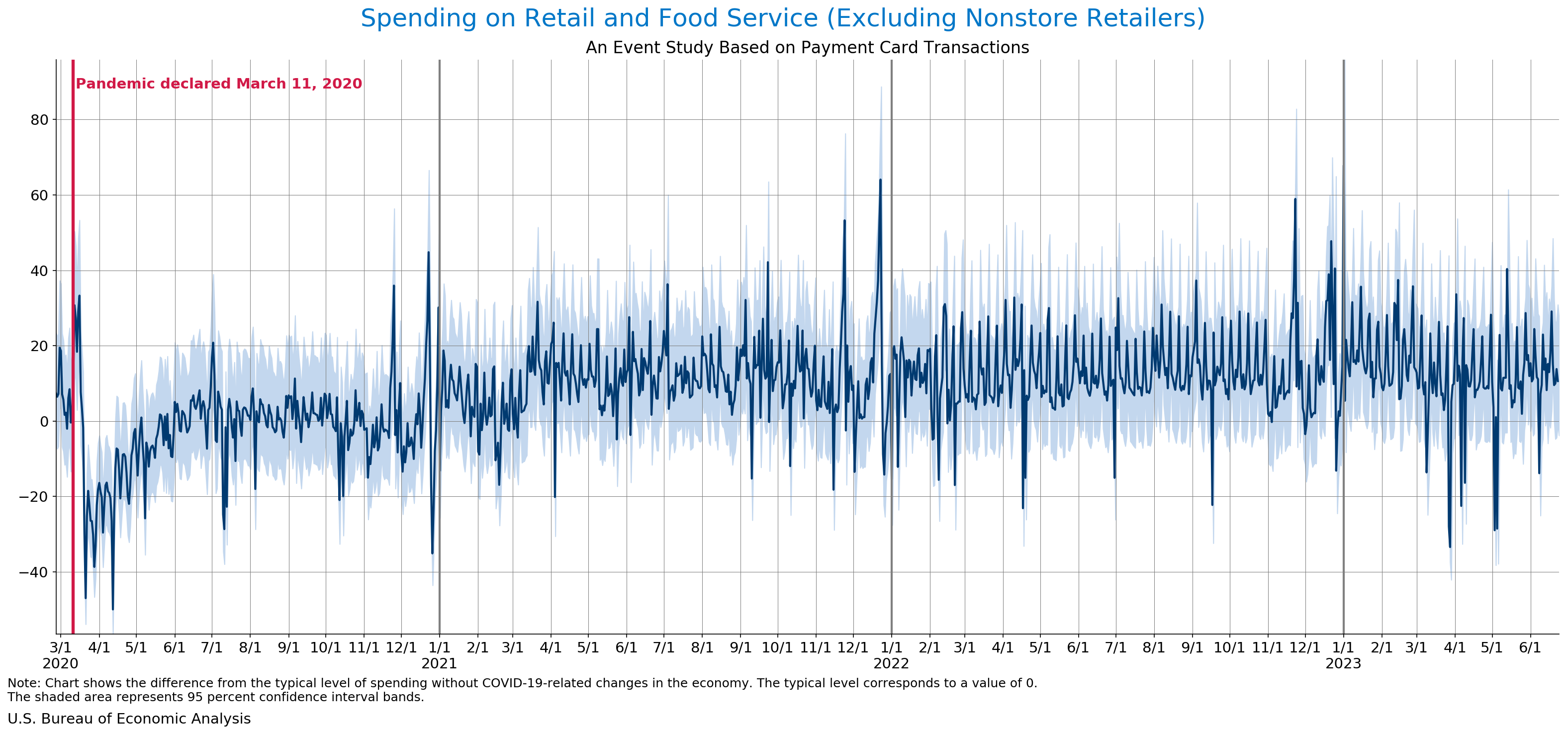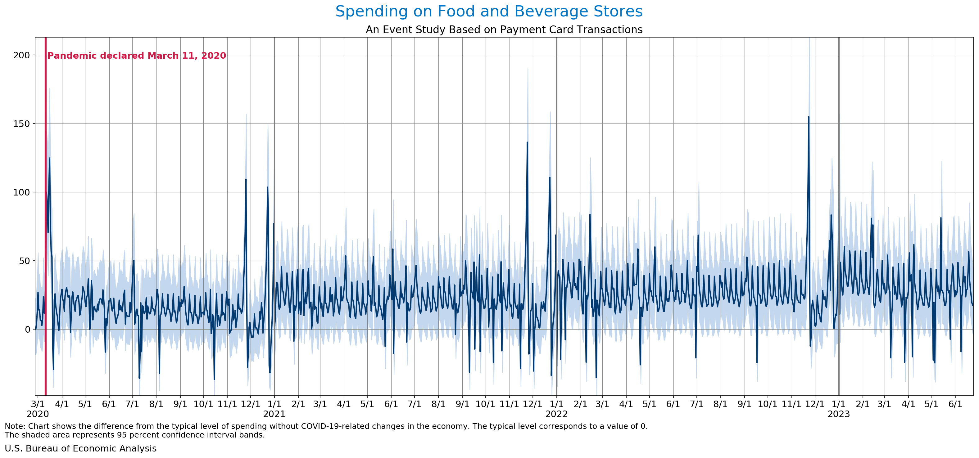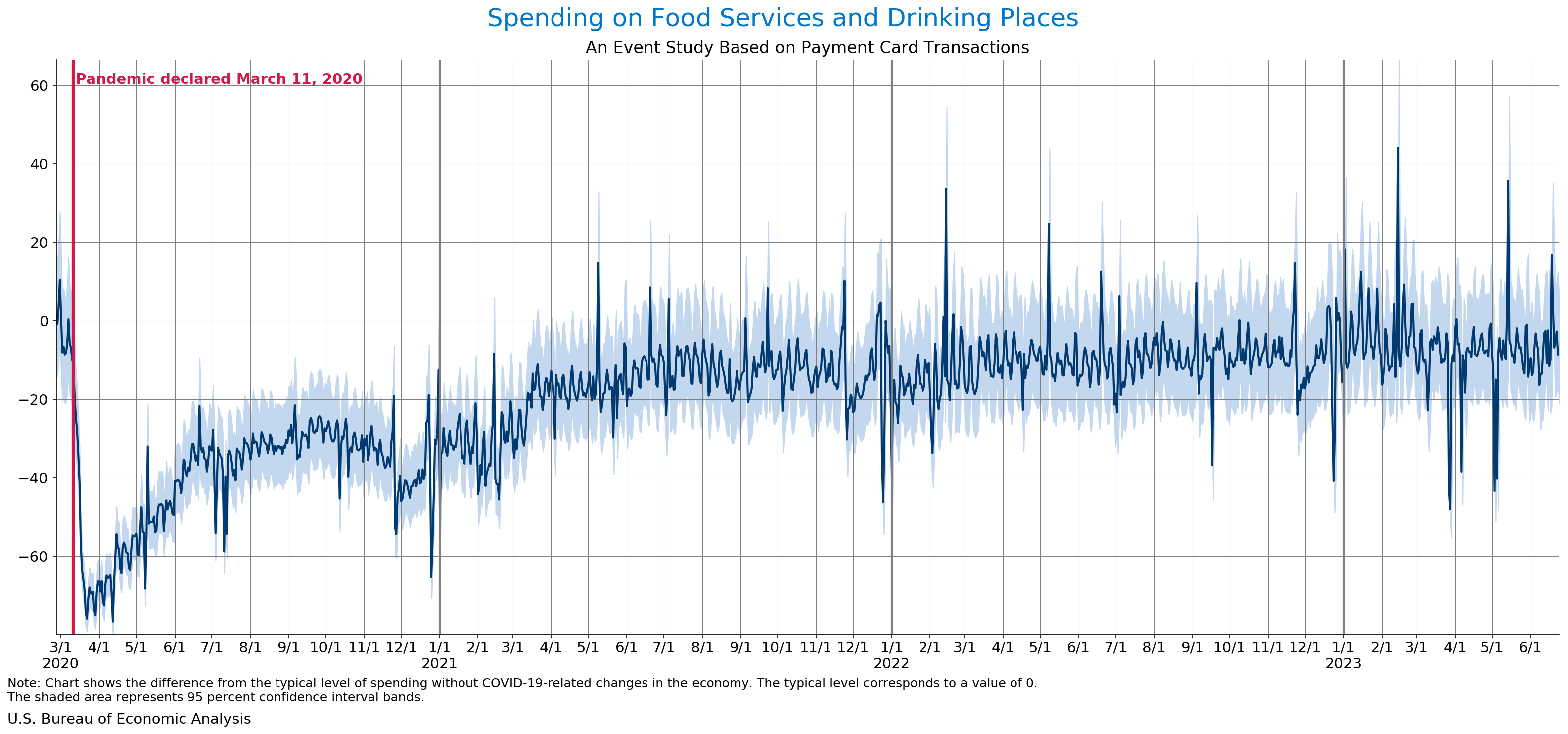 June 28, 2023 Daily Spending by Industry Spending on Food Services and Drinking Places Spending on Accommodation Spending at Clothing and Clothing Accessories Stores Spending on Gasoline Stations Spending on Food and Beverages Spending on Ambulatory Health Care Services Spending on Retail and Food Services (Excluding Nonstore Retailers) Data Weekly Event Study of Estimates Using Card Transactions XLSX Weekly Event Study of Spending Estimates Using Card Transactions CSV Monthly Event Study of Estimates Using Card Transactions XLSX