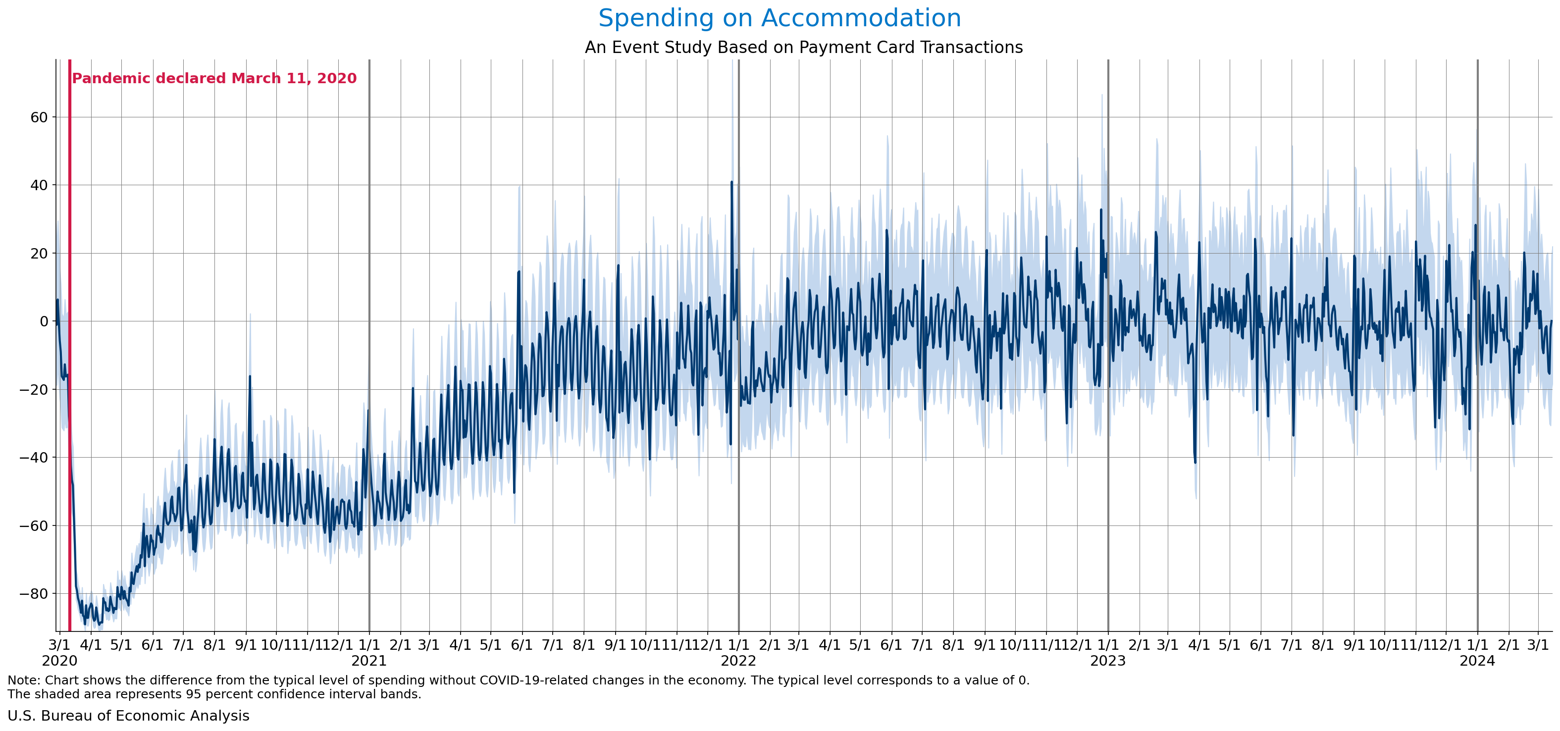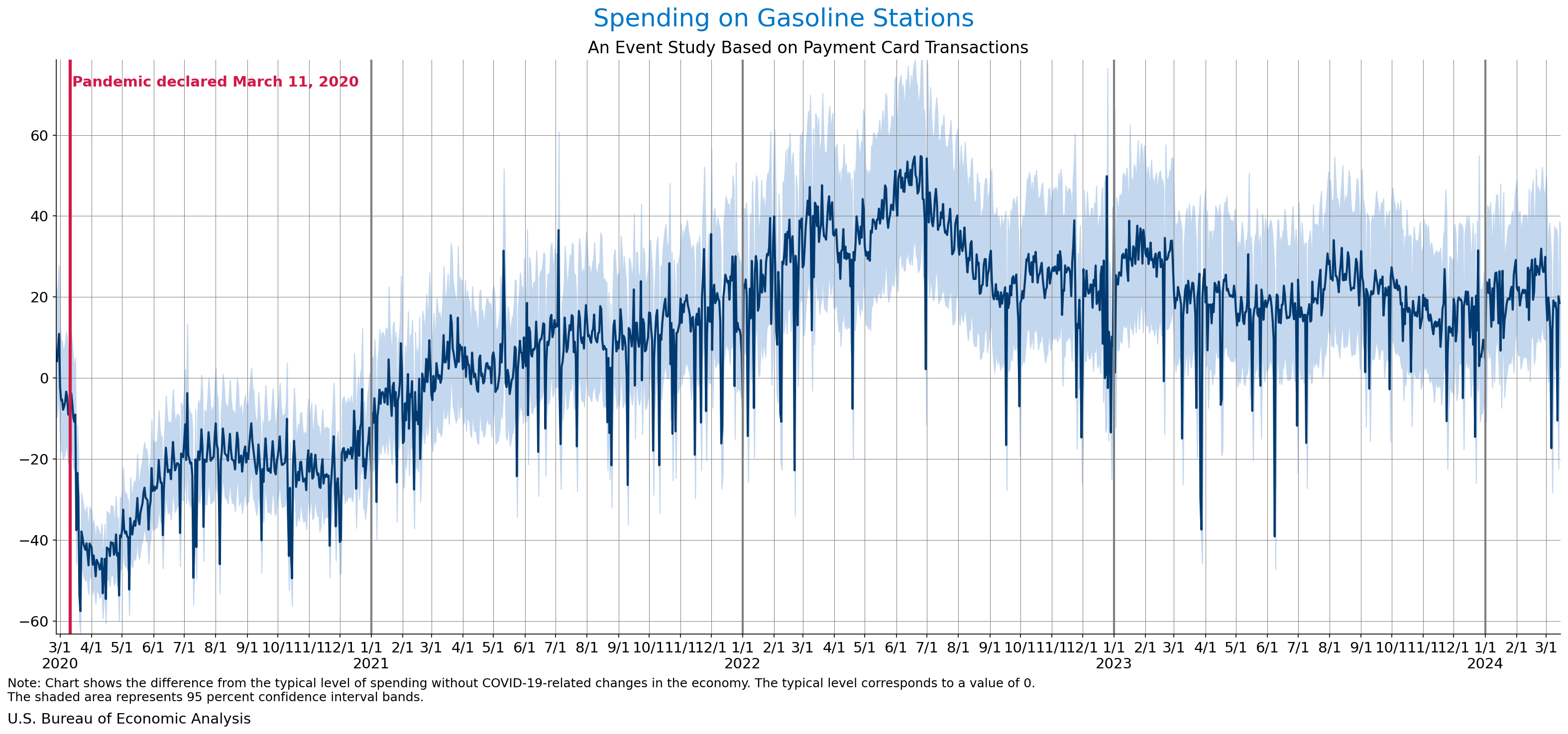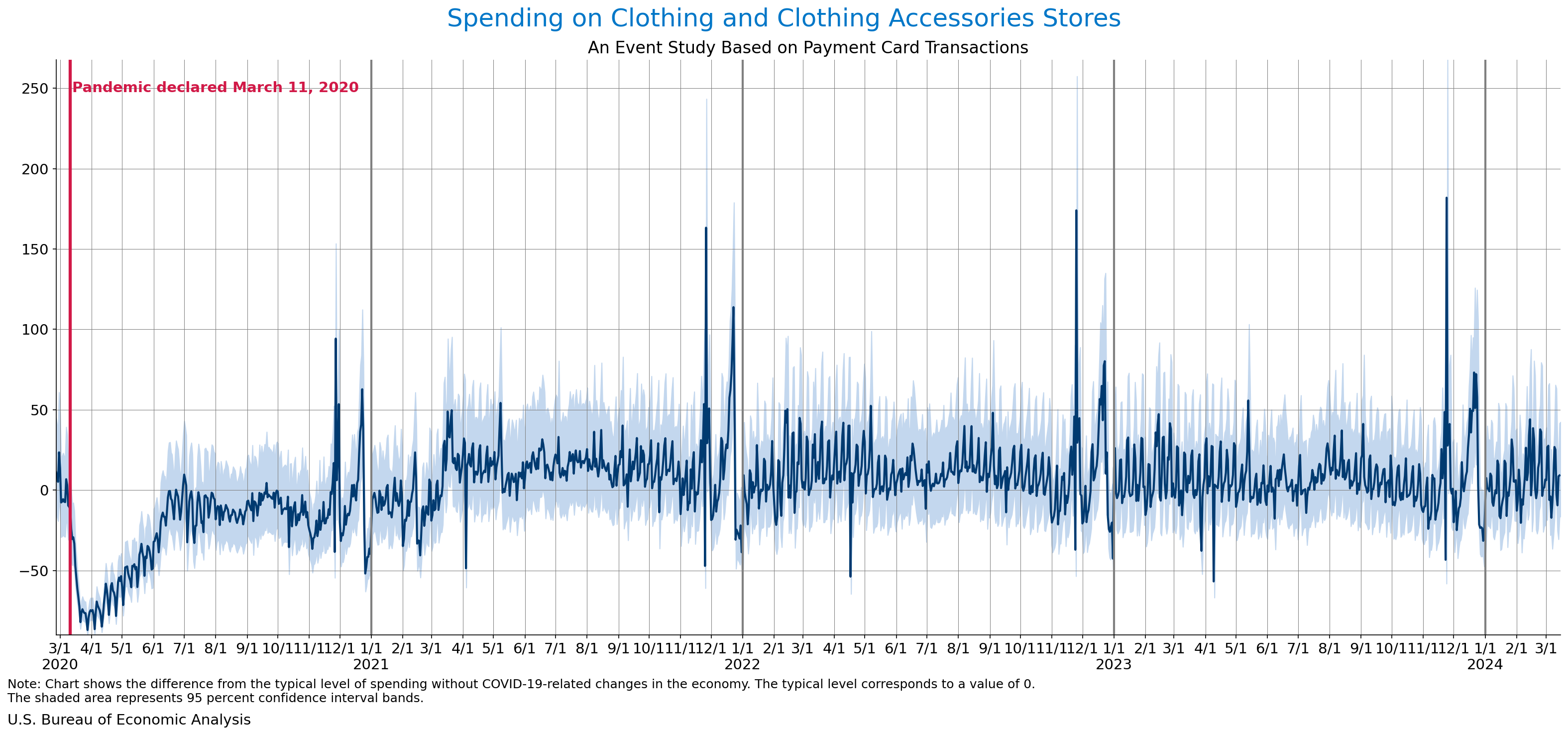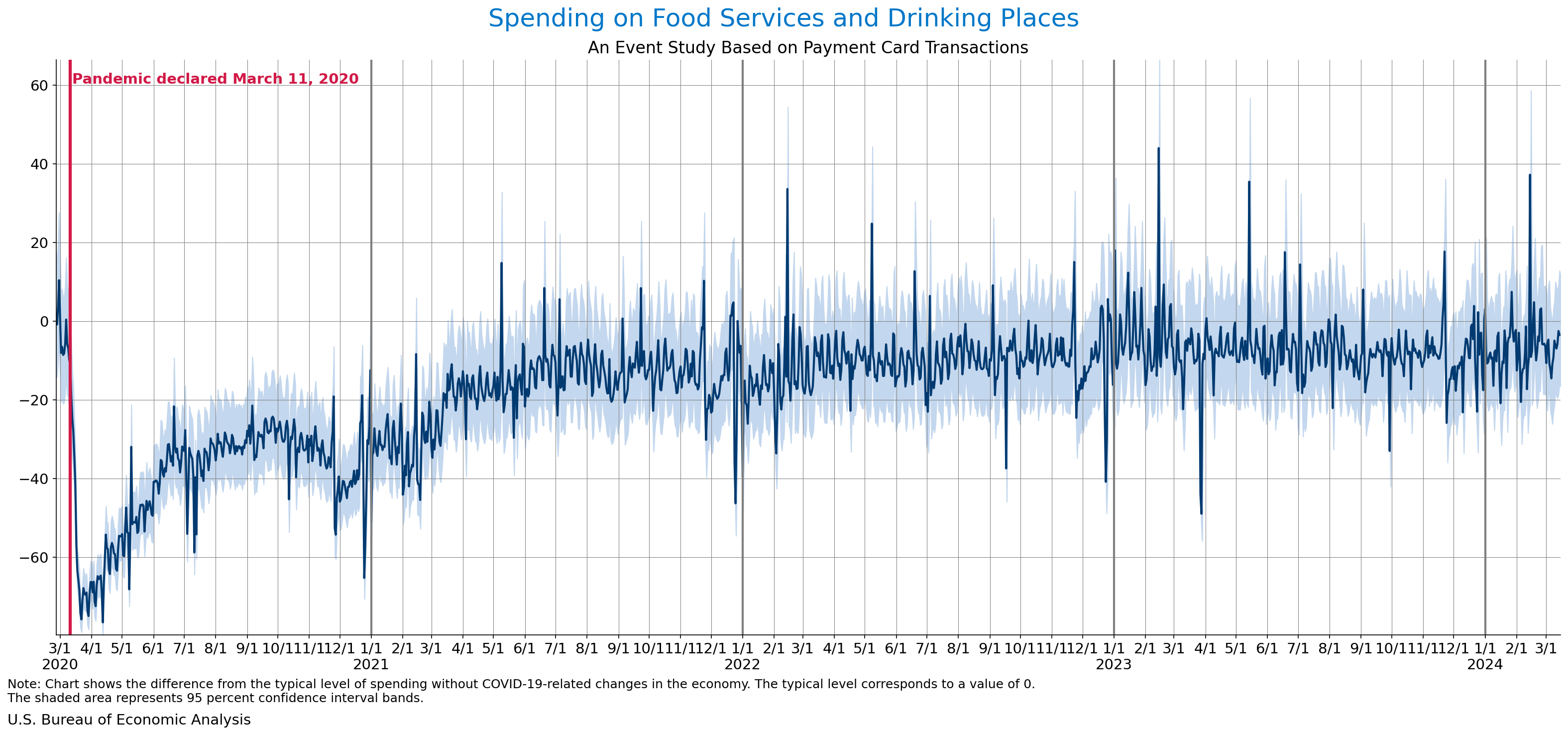 March 19, 2024 Daily Spending by Industry Spending on Food Services and Drinking Places Spending on Accommodation Spending at Clothing and Clothing Accessories Stores Spending on Gasoline Stations Spending on Food and Beverages Spending on Ambulatory Health Care Services Spending on Retail and Food Services (Excluding Nonstore Retailers) Data Weekly Event Study of Estimates Using Card Transactions XLSX Weekly Event Study of Spending Estimates Using Card Transactions CSV Monthly Event Study of Estimates Using Card Transactions XLSX