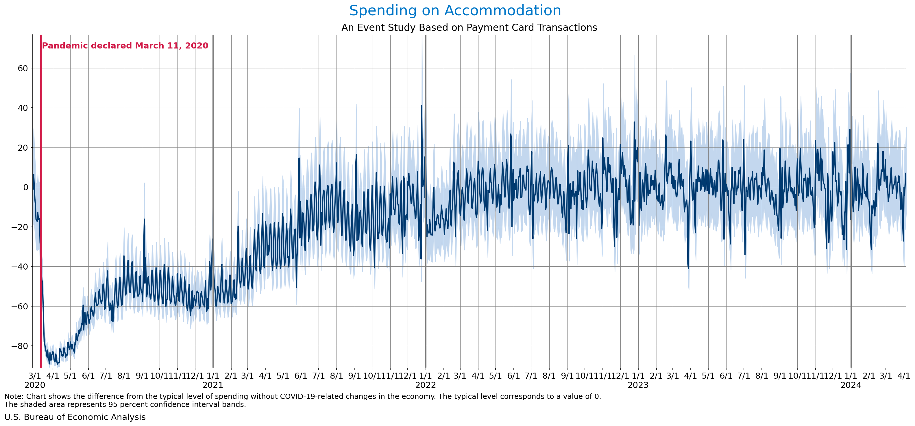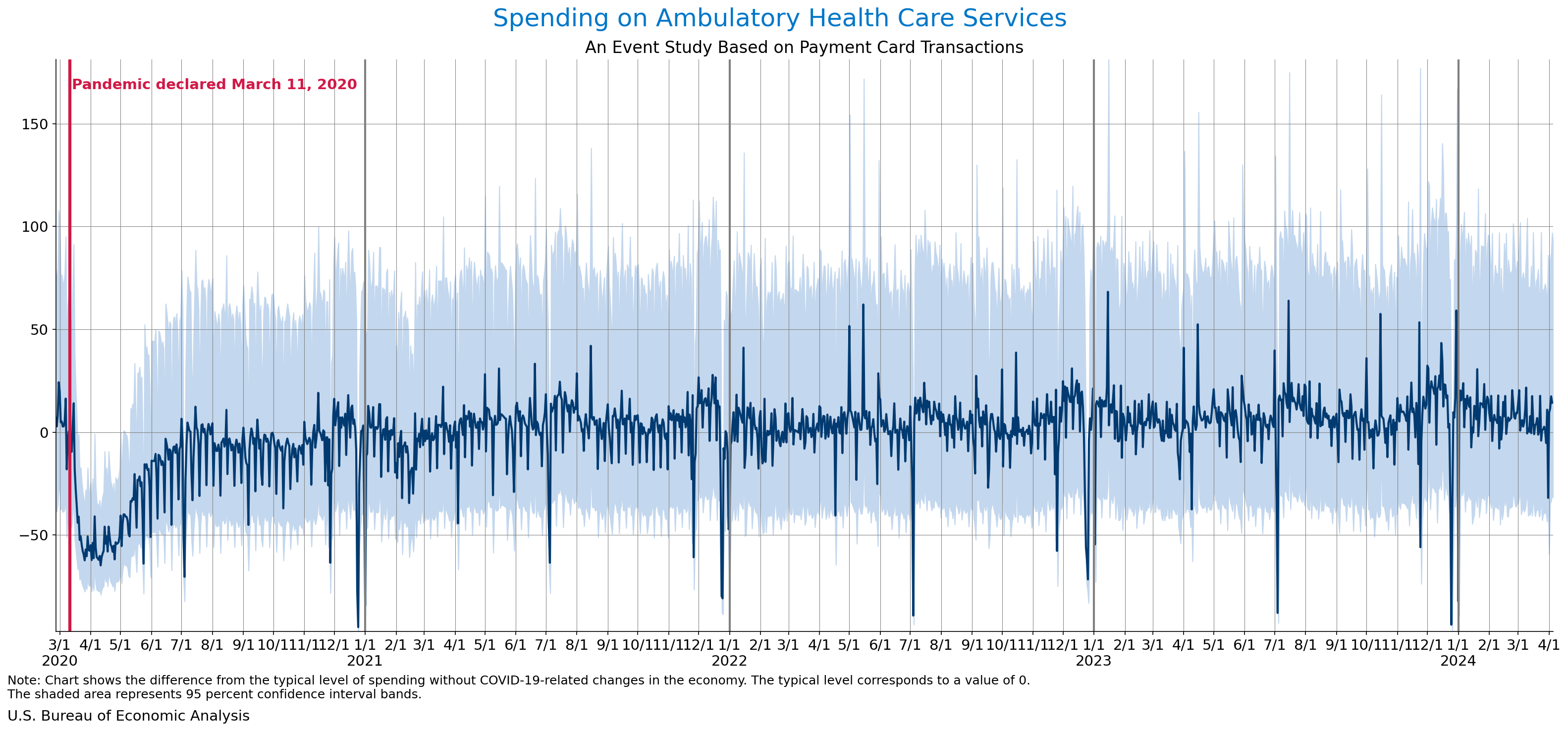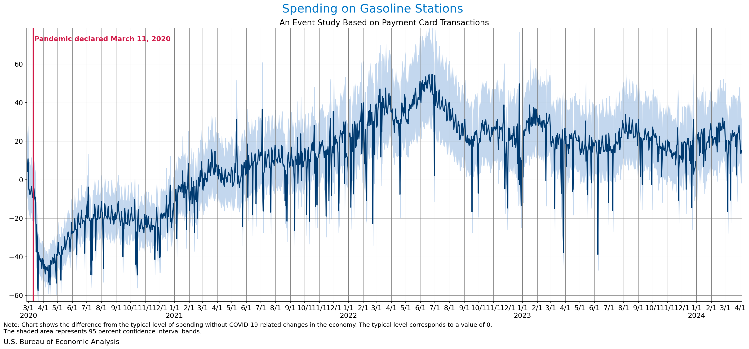 April 9, 2024 Daily Spending by Industry Spending on Food Services and Drinking Places Spending on Accommodation Spending at Clothing and Clothing Accessories Stores Spending on Gasoline Stations Spending on Food and Beverages Spending on Ambulatory Health Care Services Spending on Retail and Food Services (Excluding Nonstore Retailers) Data Weekly Event Study of Estimates Using Card Transactions XLSX Weekly Event Study of Spending Estimates Using Card Transactions CSV Monthly Event Study of Estimates Using Card Transactions XLSX