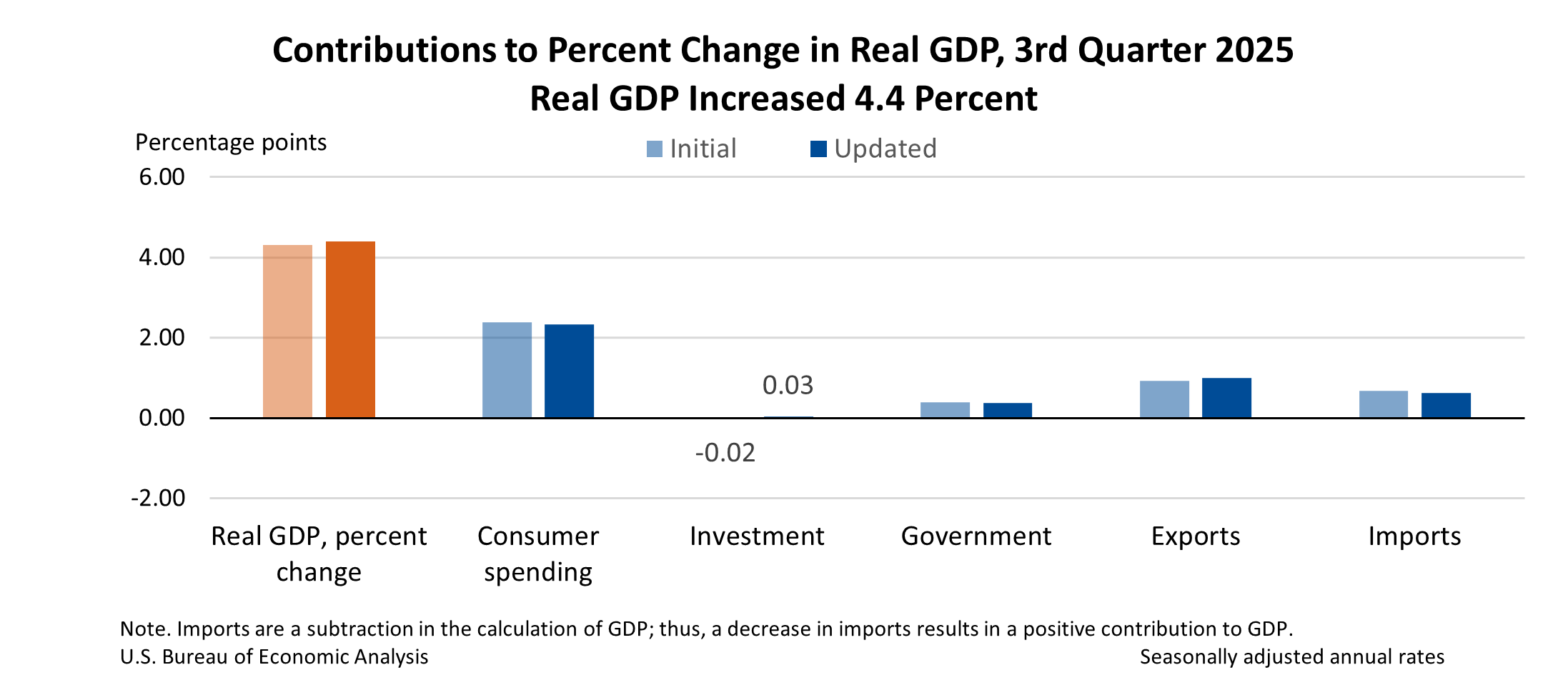 Real GDP increased at an annual rate of 4.4 percent (1.1 percent at a quarterly rate ) in the third quarter, an upward revision of 0.1 percentage point from the previous estimate, primarily reflecting upward revisions to exports and investment that were partly offset by a downward revision to consumer spending. Imports were revised up.